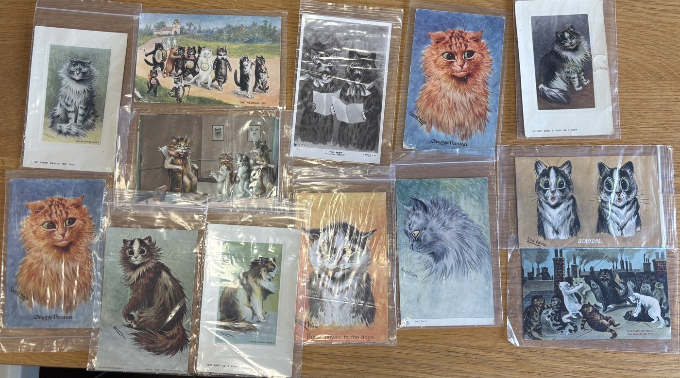 Artist. Louis Wain coln. loose in plastic sleeves, with publishers Beagles, Faulkner, Philco, Tucks, incl. 'A night attack', 'Scandal', I'm Not Such A Fool As I Look', 'Throw Physic to the Dogs', 'Tom Says I'm A Flirt', etc. Plus range of shipping and UK local interests incl. gas explosion. Qty 23. (R)