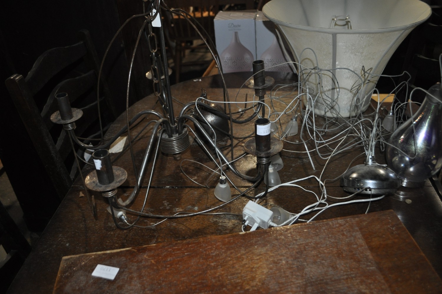 A VINTAGE 5 ARMED CANDELABRA STYLE CHANDELIER PLUS MODERN POSEABLE HALOGEN LIGHT FITTING