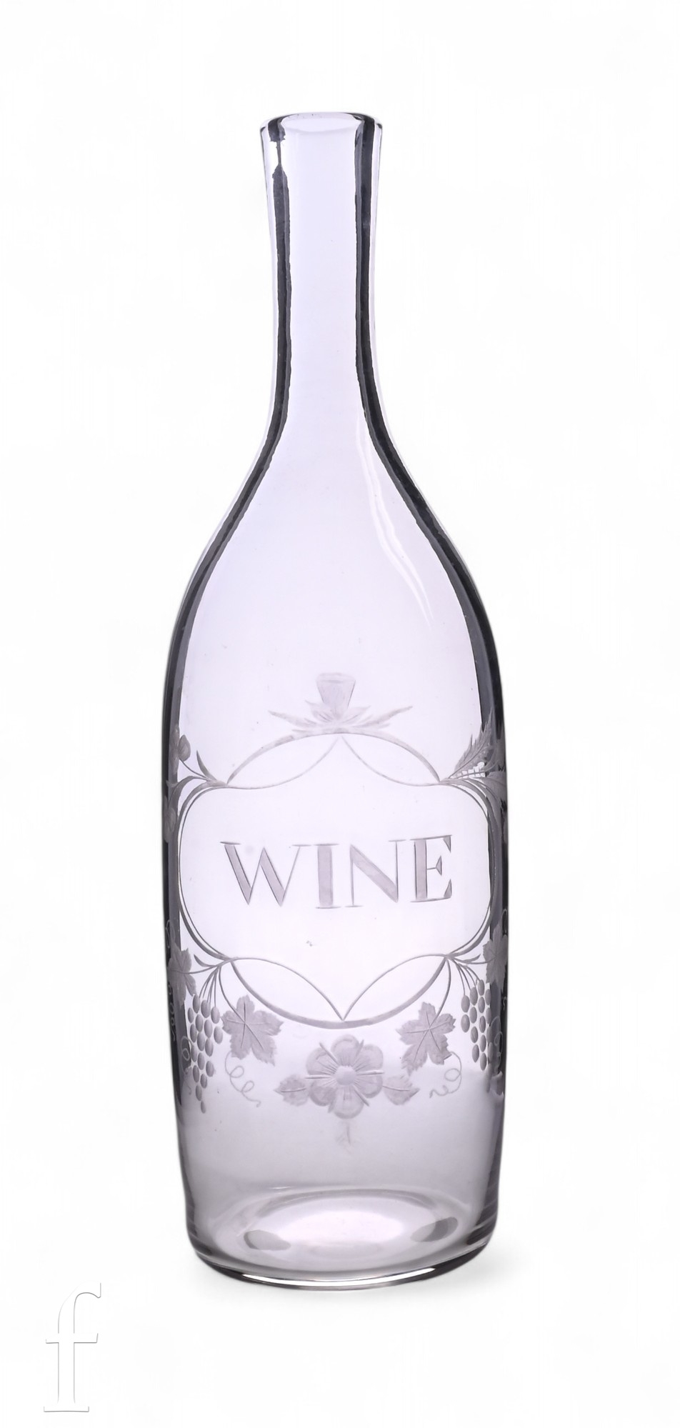 A 19th Century clear crystal glass wine serving bottle in the 18th Century taste, the slender shouldered ovoid body with tall slender neck, the body engraved with WINE within a foliate border cartouche panel, height 28cm.