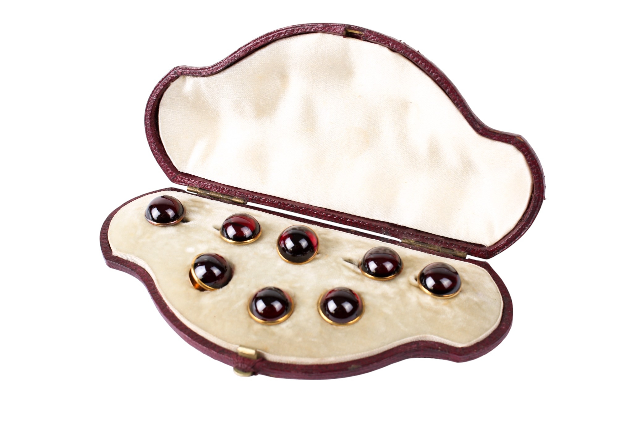 A set of eight yellow metal and red paste dress studs and links. Each diameter 1.2cm, metal unmarked but back of cabochons test as 9ct gold, gross weight 22g, in a fitted box.