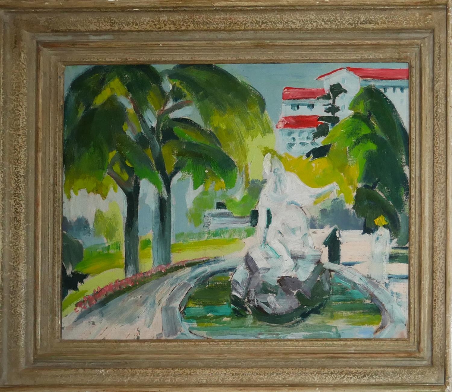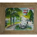 A fountain with an exotic garden, bearing label verso, dated 1982, framed.