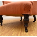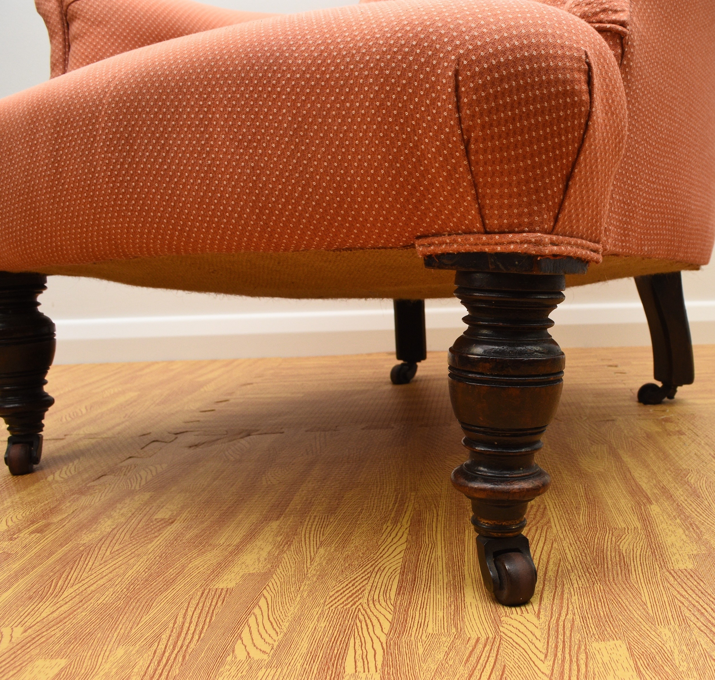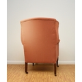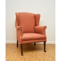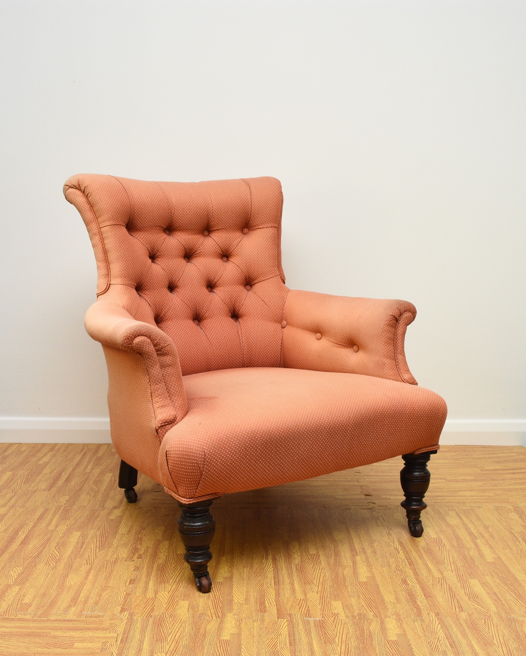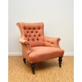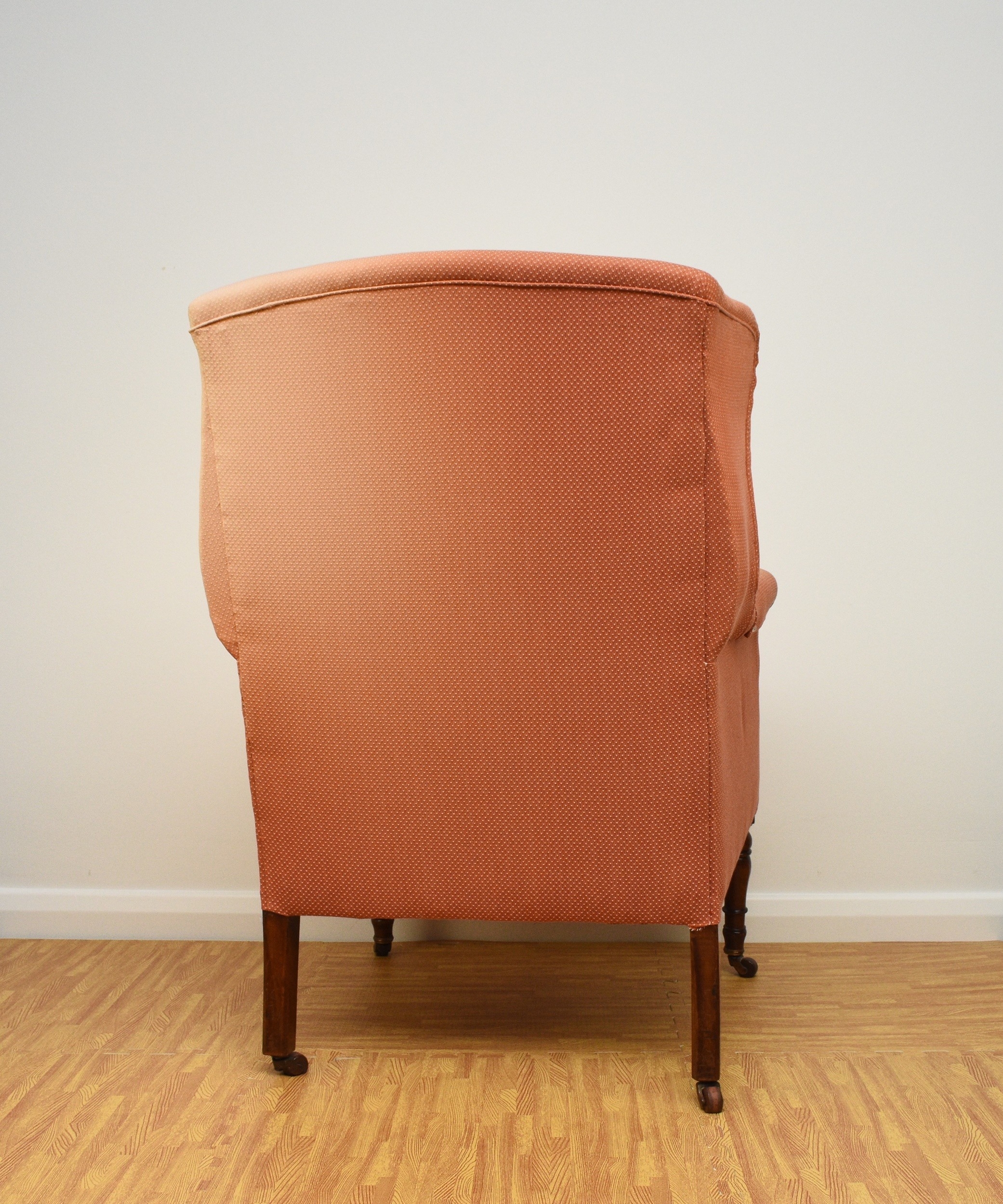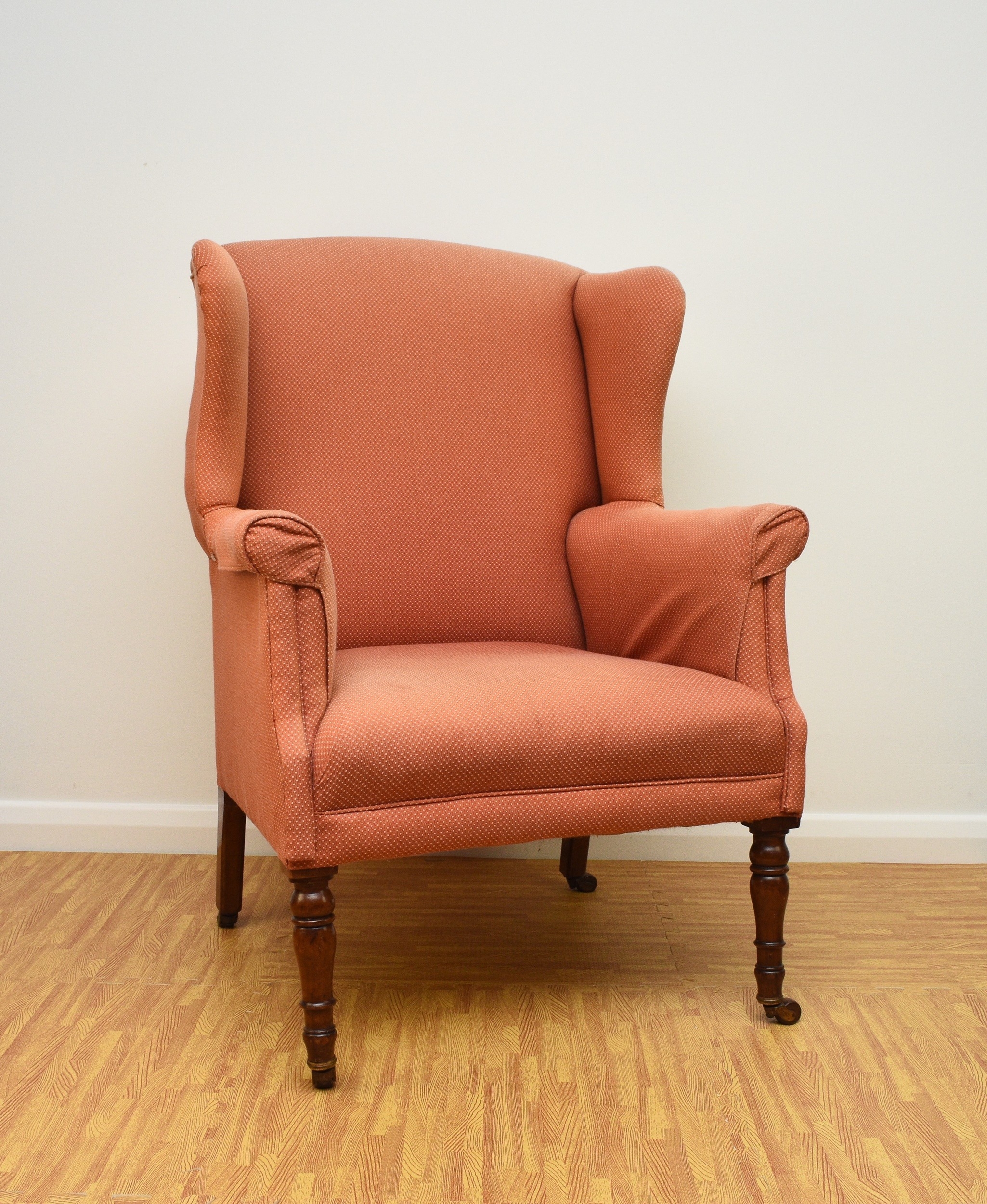 Two 19th century upholstered wing armchairs The first of button back form, raised on turned mahogany front supports and castors, 79cm wide, seat height 36cm; the second of wing form, raised on turned mahogany front supports and castors, 74cm wide, seat height 46cm, both re-upholstered in salmon pink textured fabric. (2) Wirswall Hall, Whitchurch, Shropshire. Condition:Both structurally sturdy. Good cushioning and springing. Some minor marks and scuffs to the show wood. Upholstery fabric has faded in places and there are some fairly faint stains in places also.