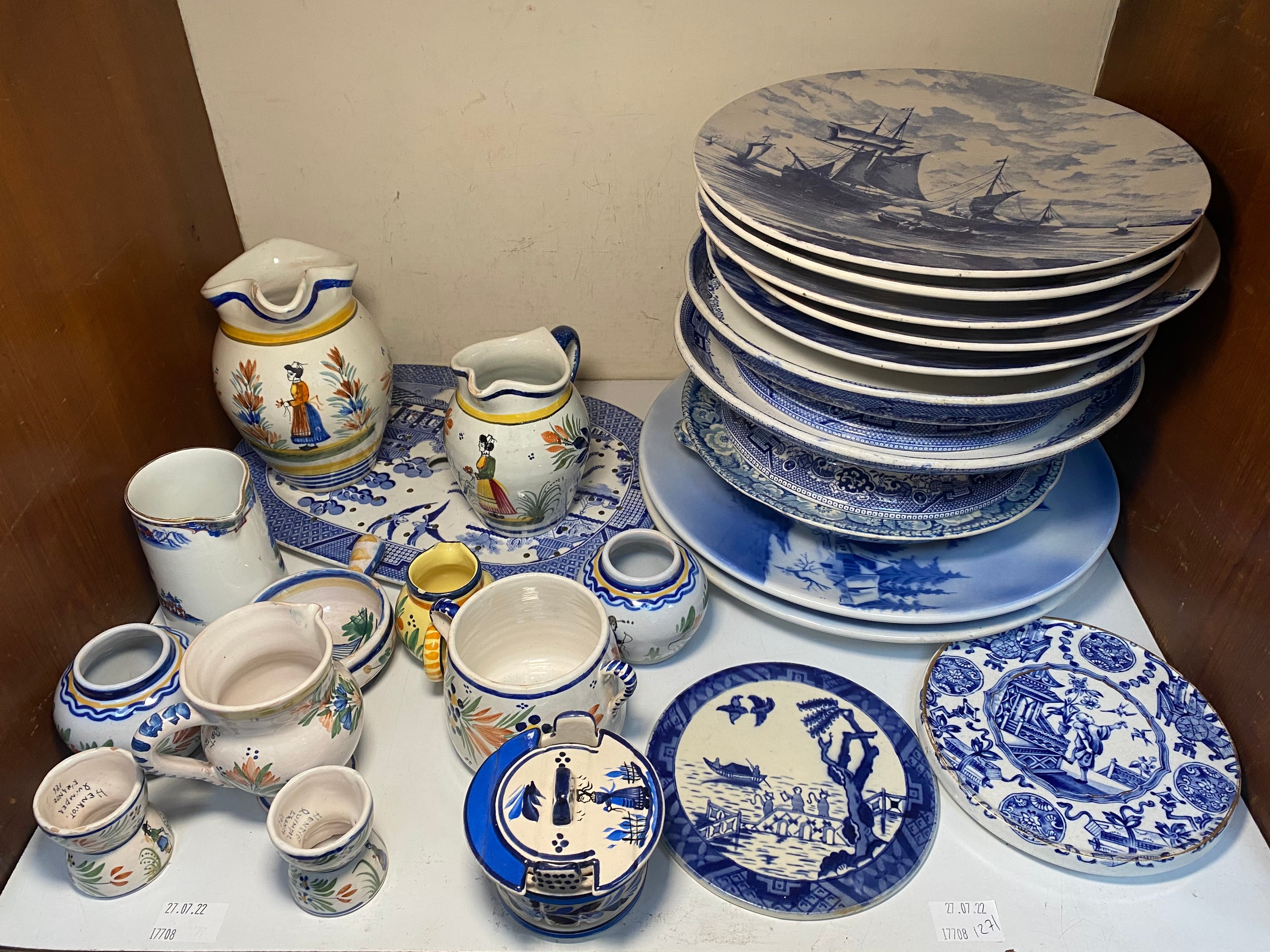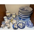 A quantity of blue and white printed pottery and porcelain, including and Aesthetic Movement teapot stand, various willow pattern etc (Section 7)