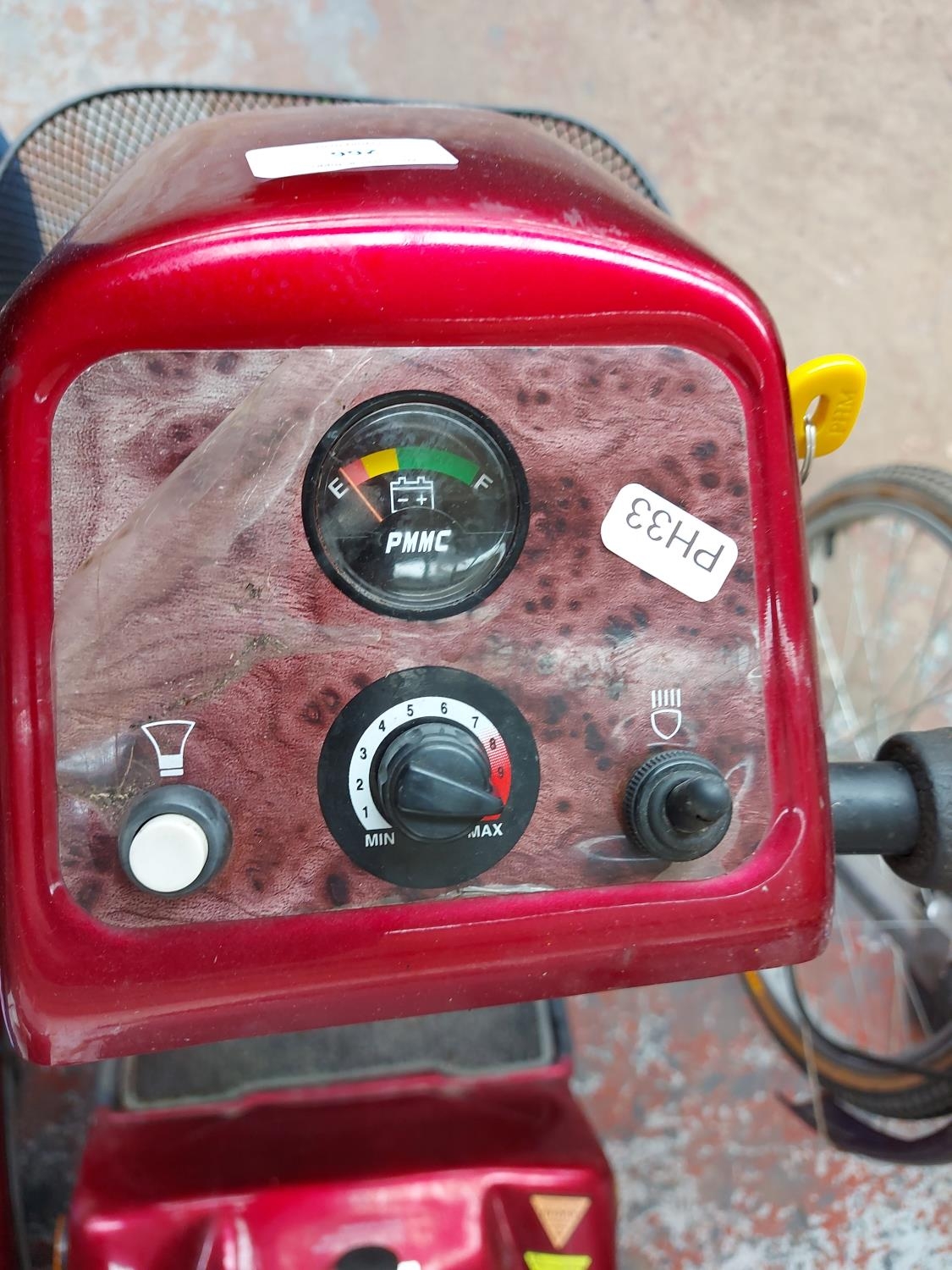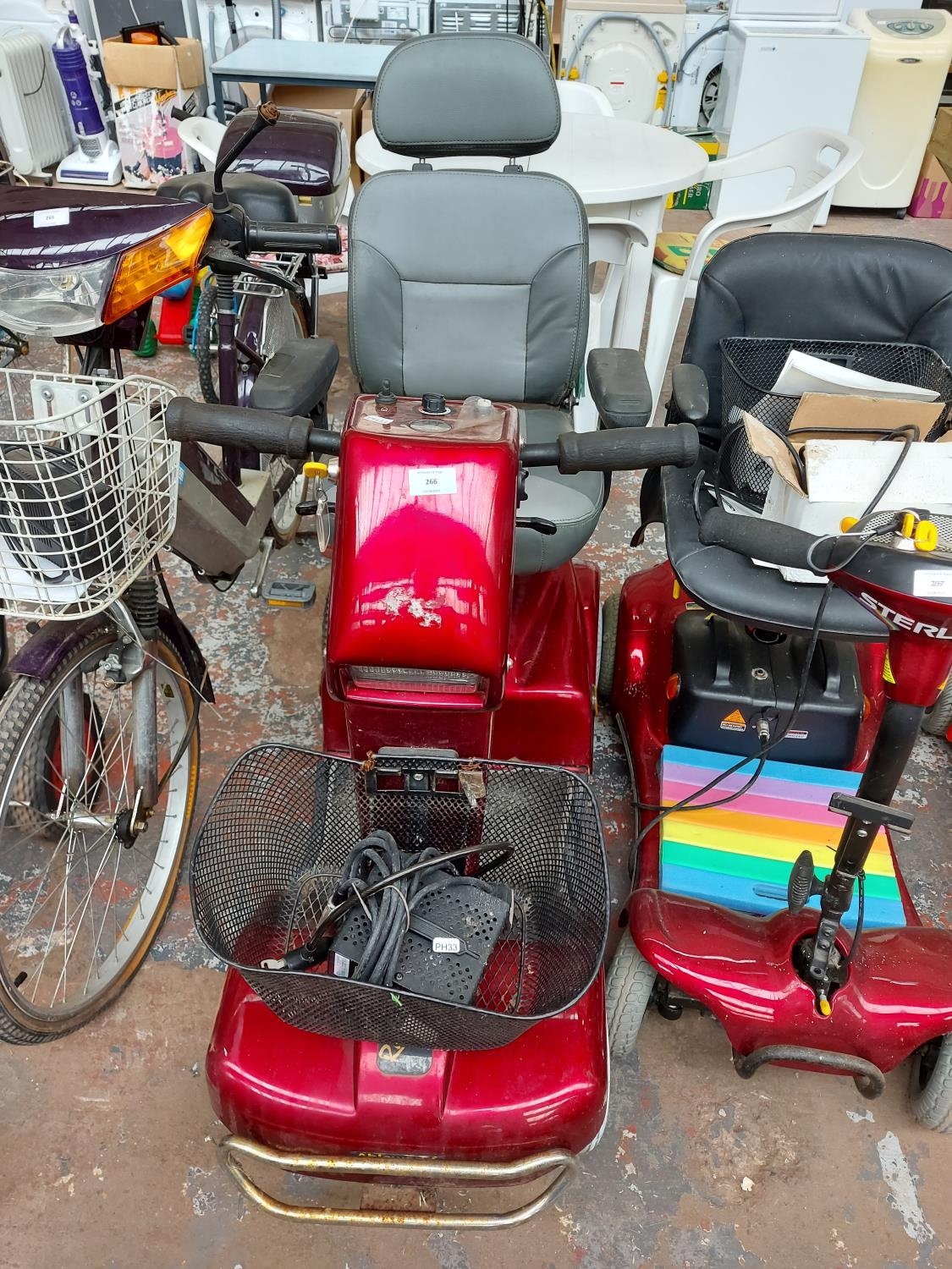 A red Rascal ride on four wheeled mobility scooter with key, battery and charger (switches on, driven in, electrically untested)