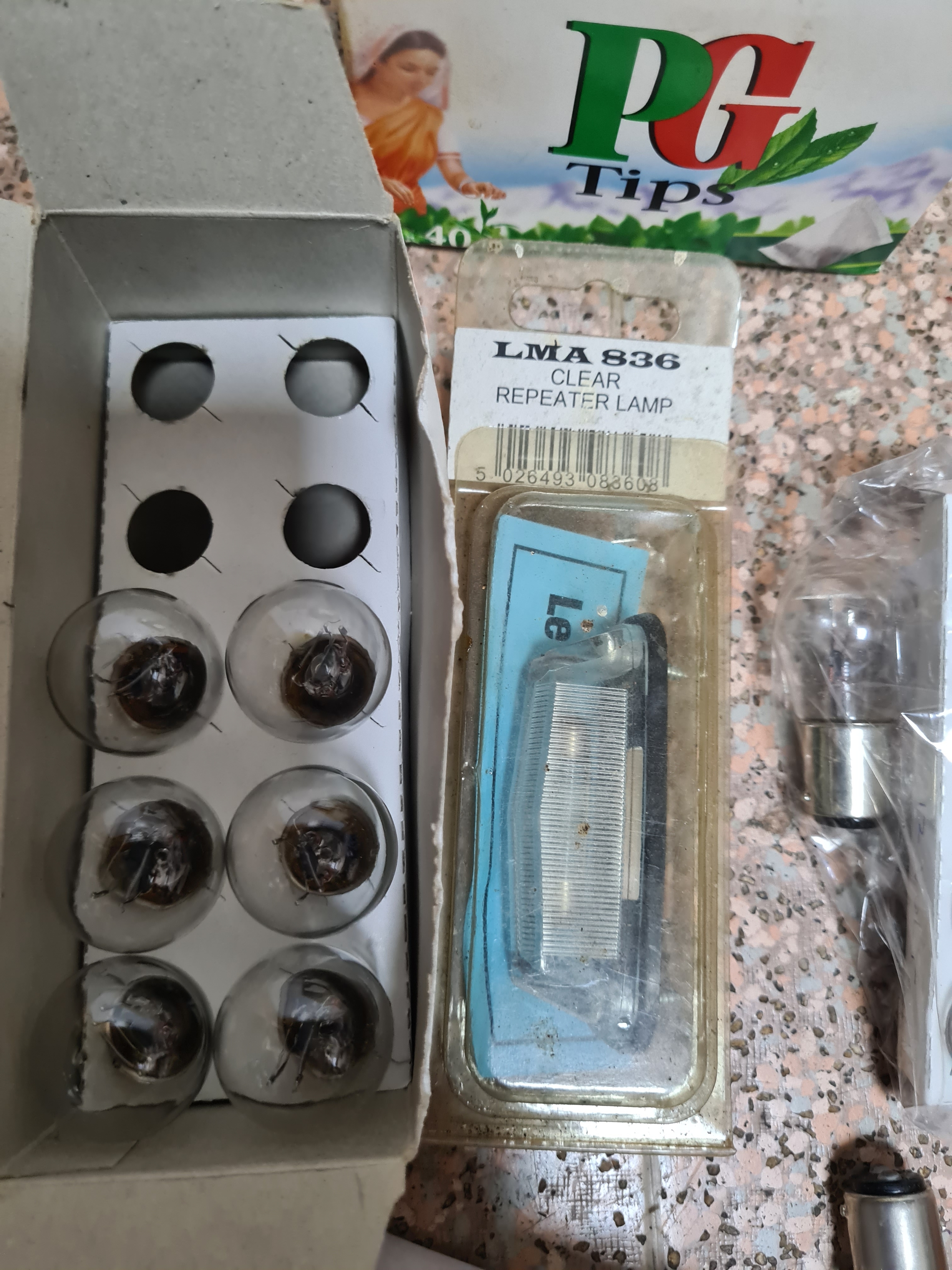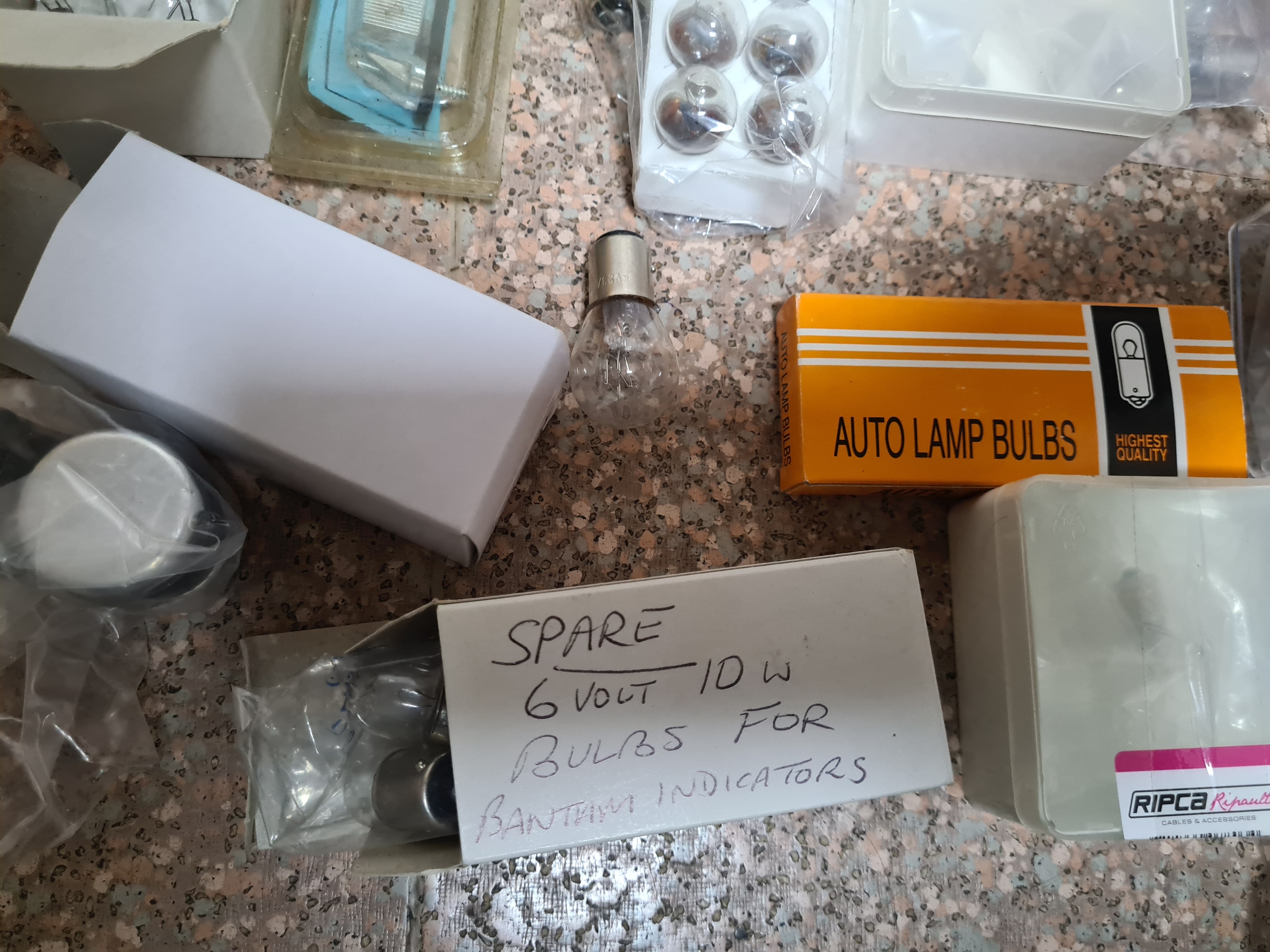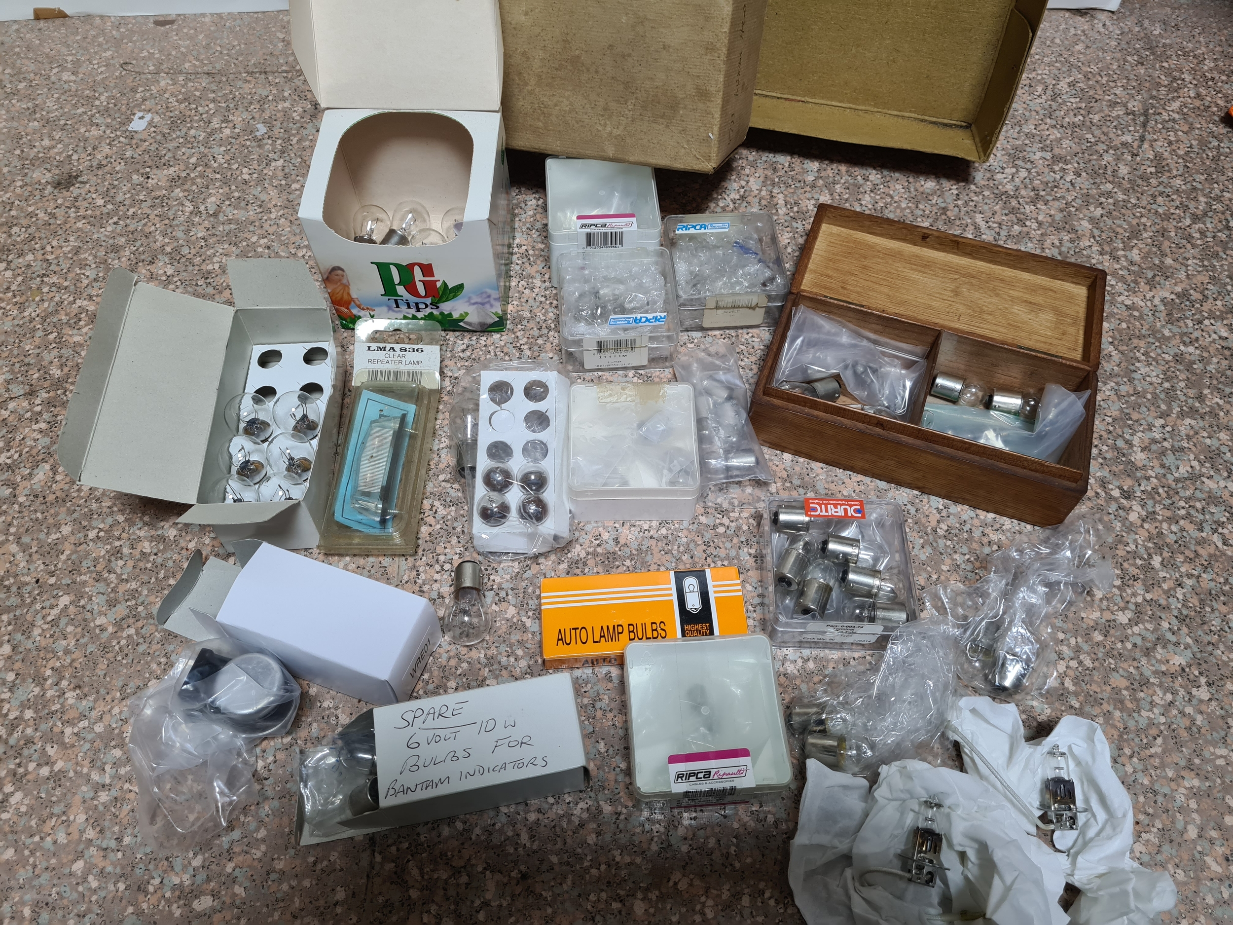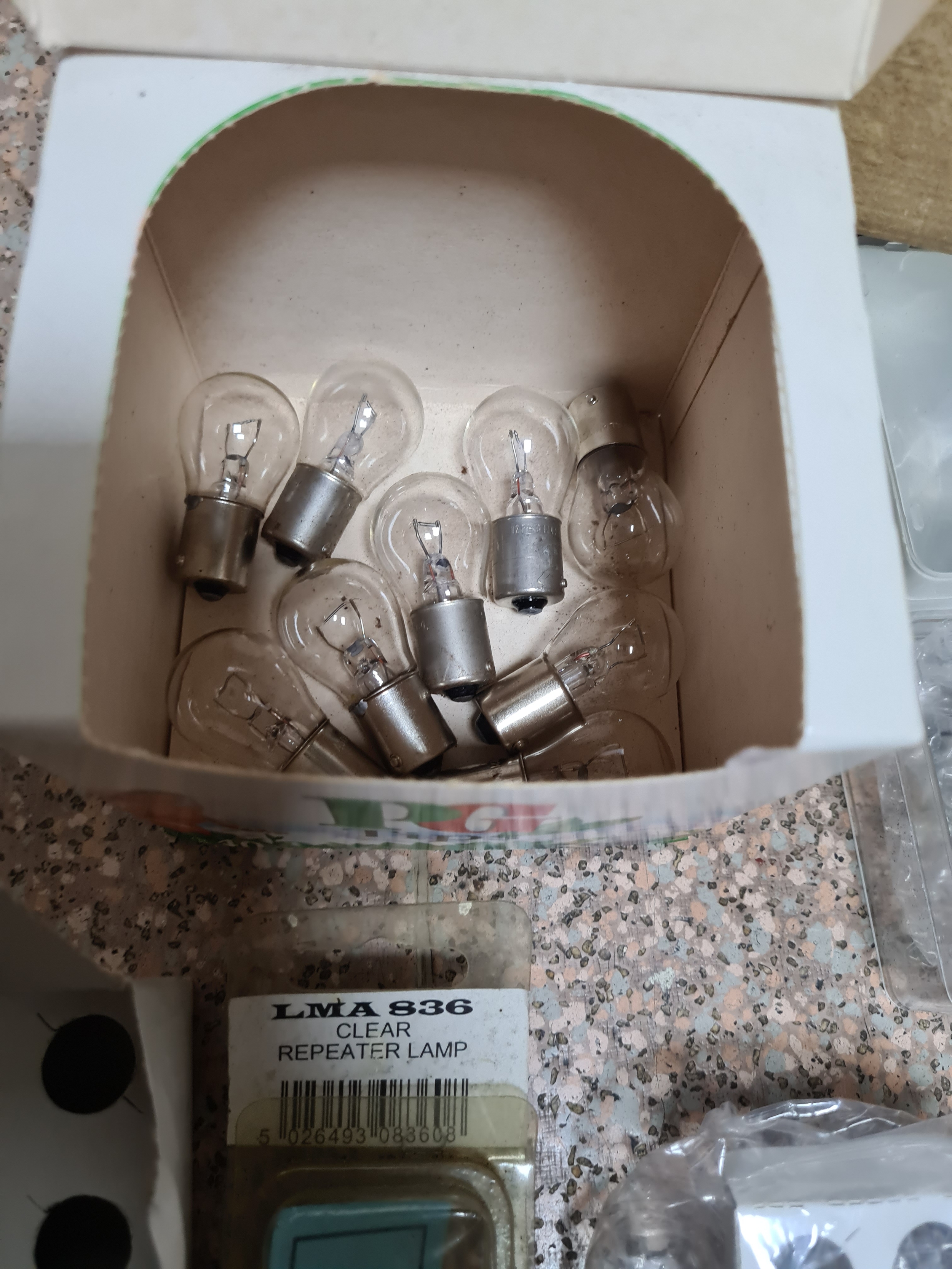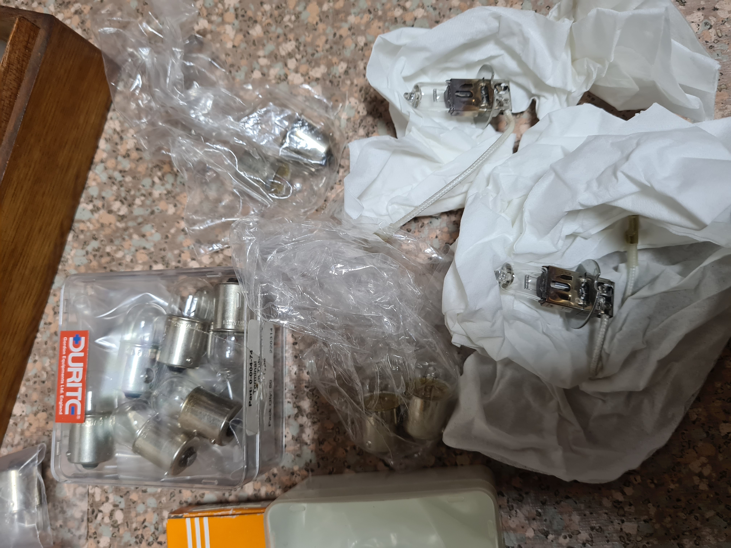 A collection of vehicle side light bulbs and indicator light bulbs etc. Also includes a Classic Car chromed door handle, possibly for a Triumph Herald.