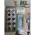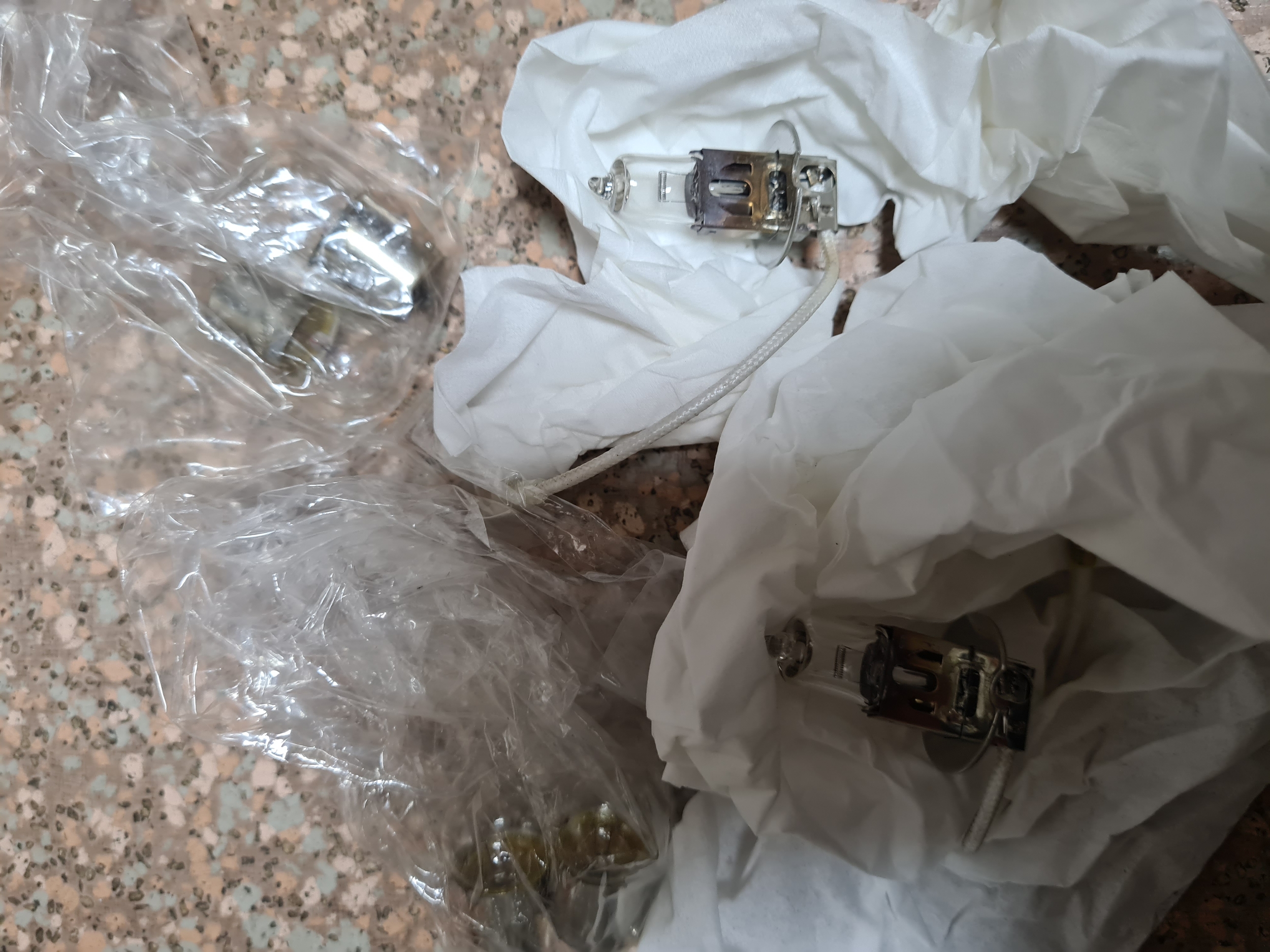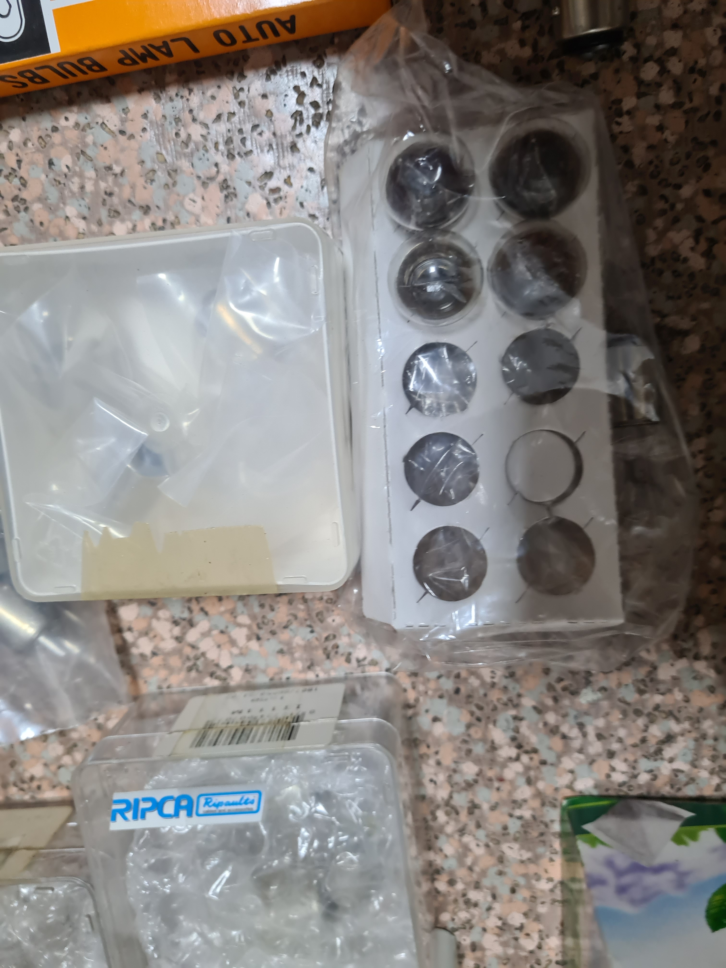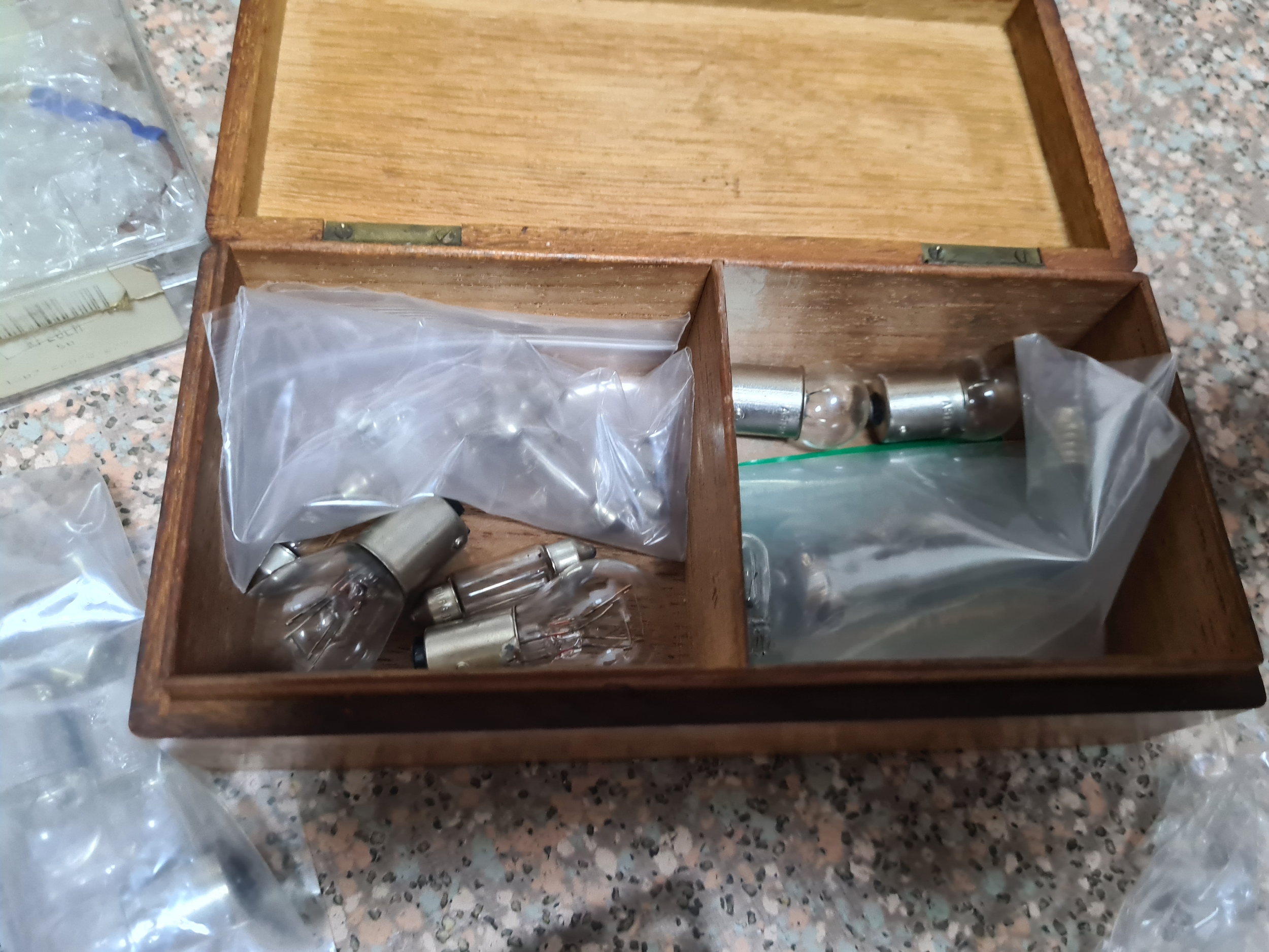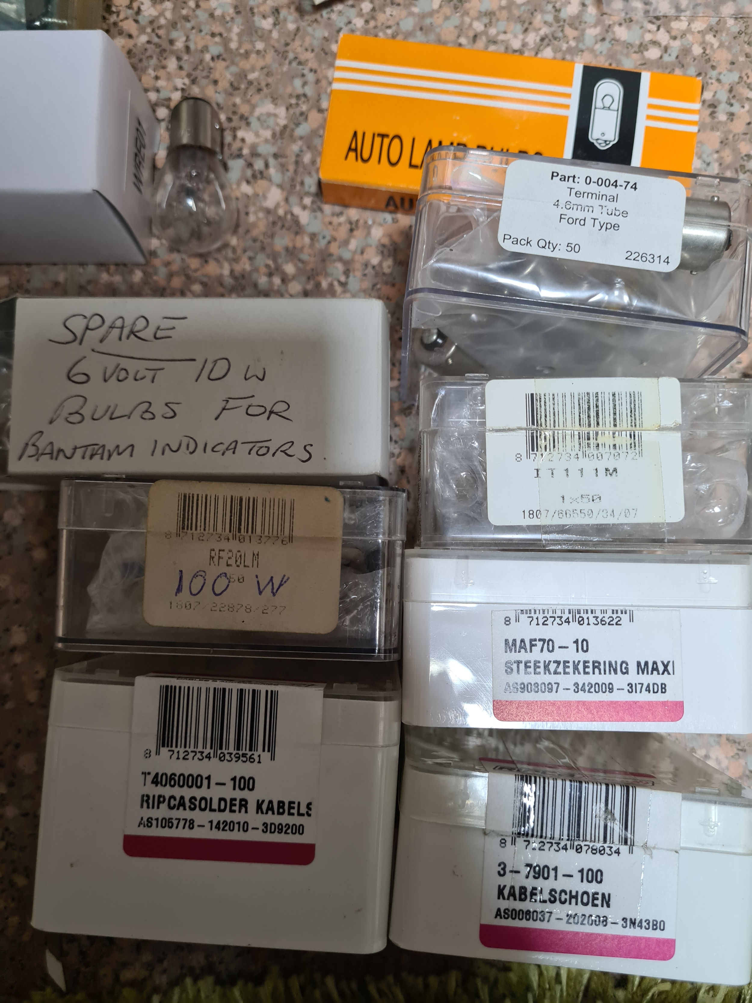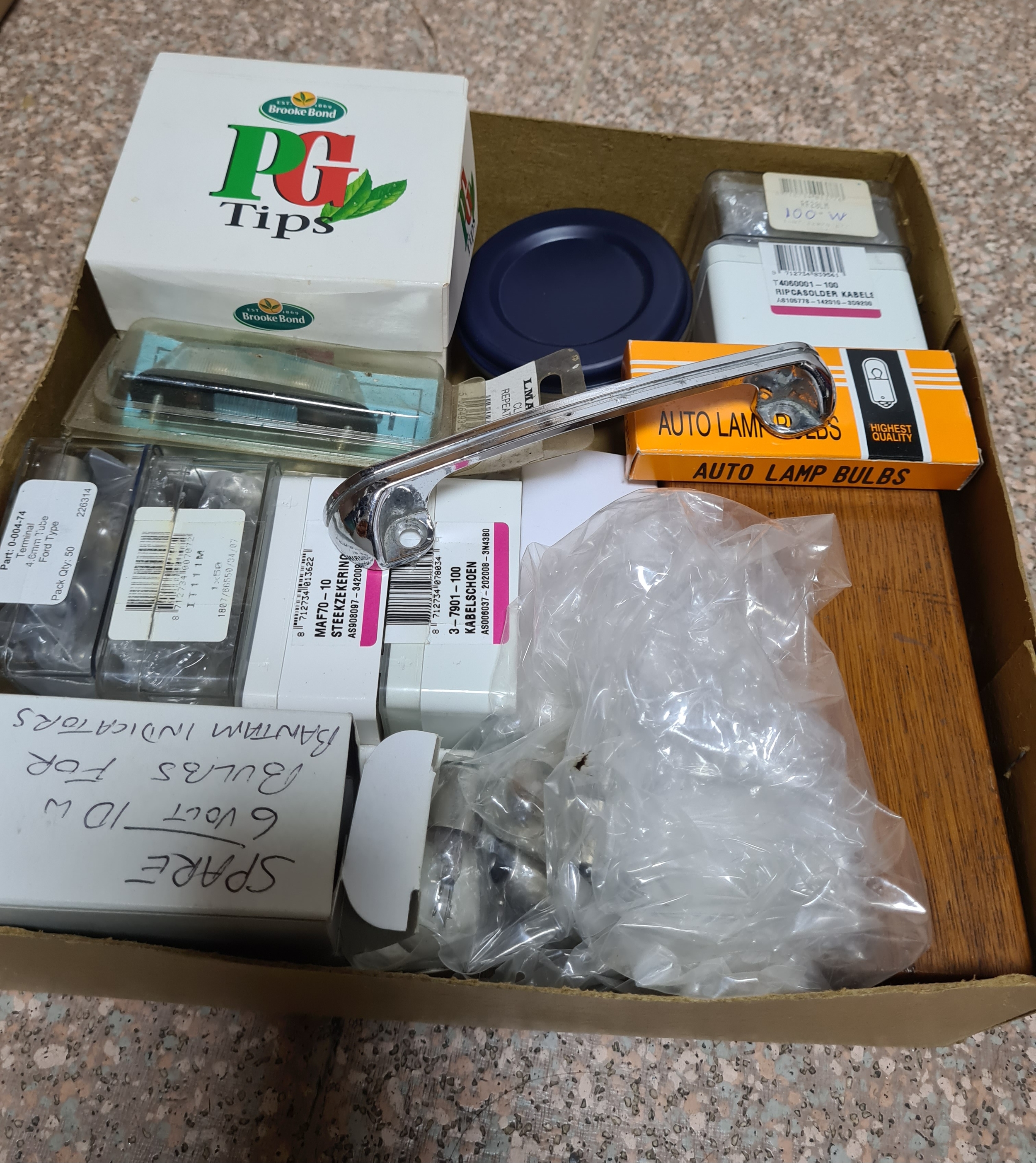 A collection of vehicle side light bulbs and indicator light bulbs etc. Also includes a Classic Car chromed door handle, possibly for a Triumph Herald.