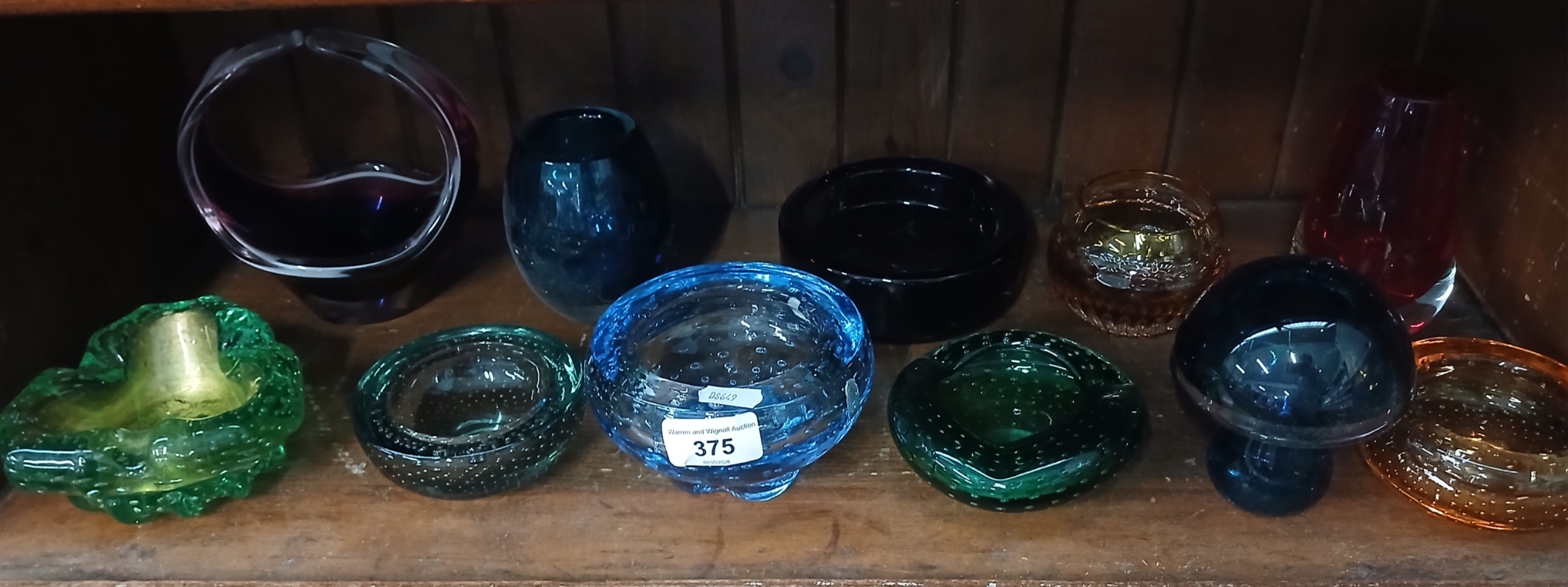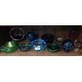 Eleven coloured glass ashtrays and vases