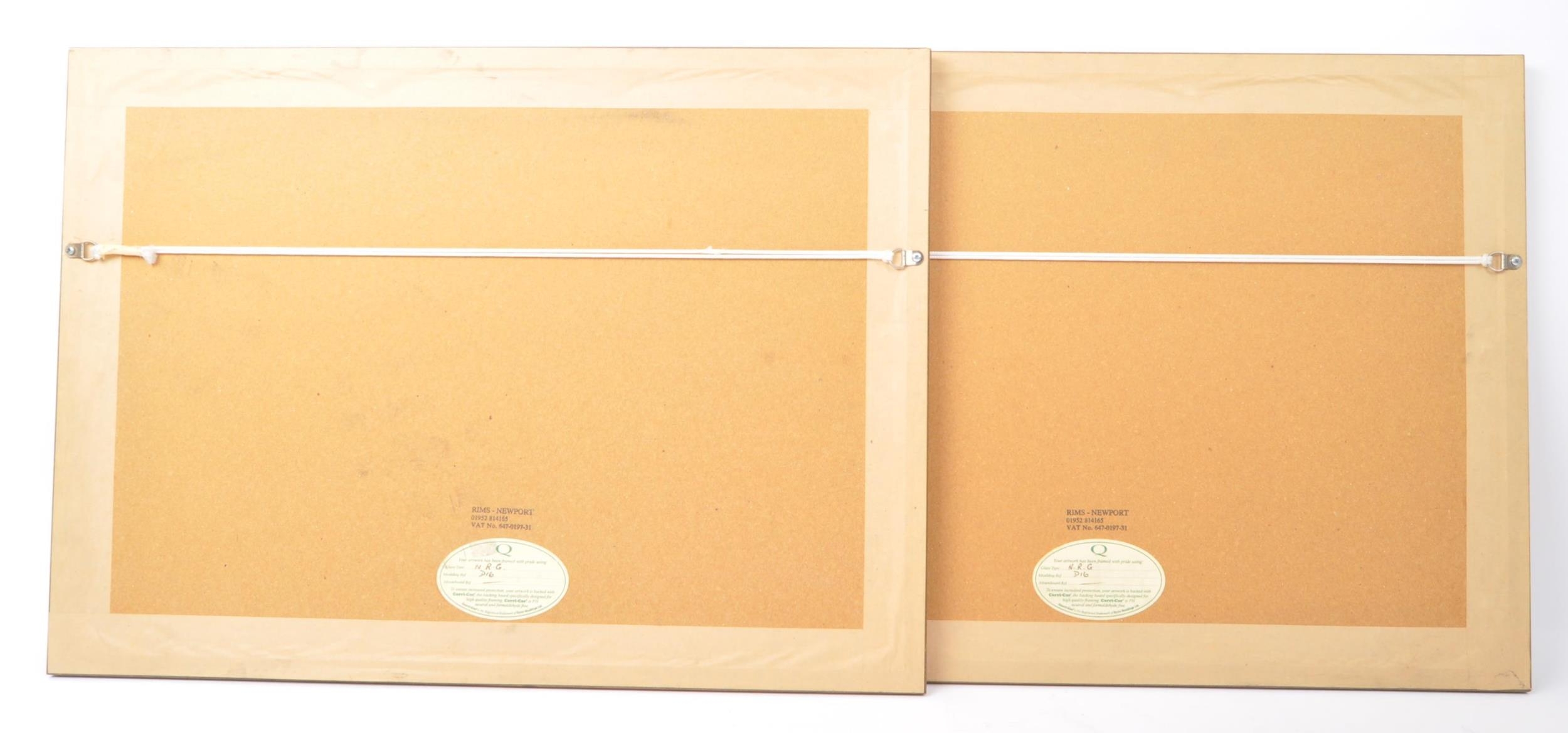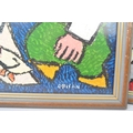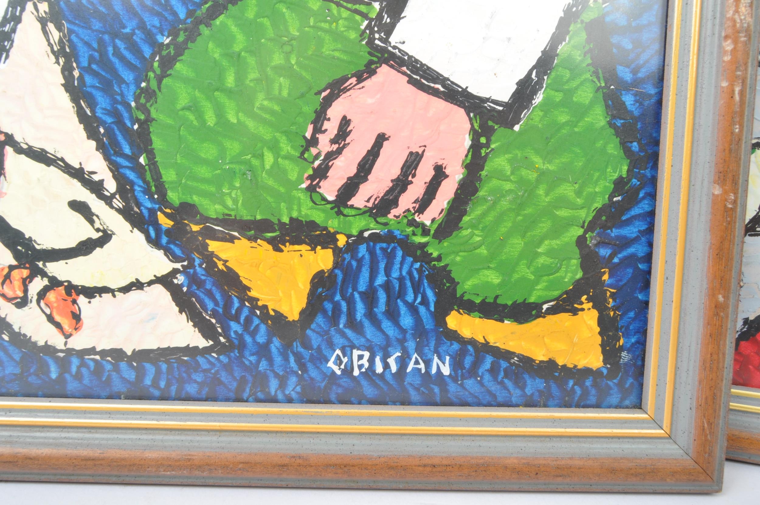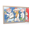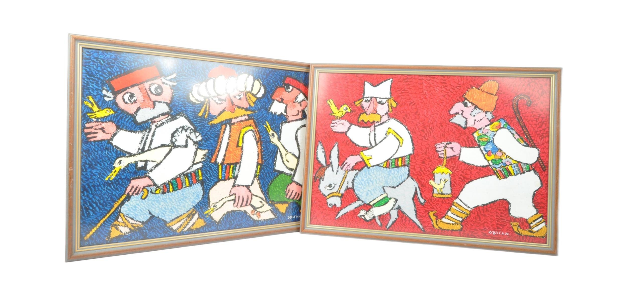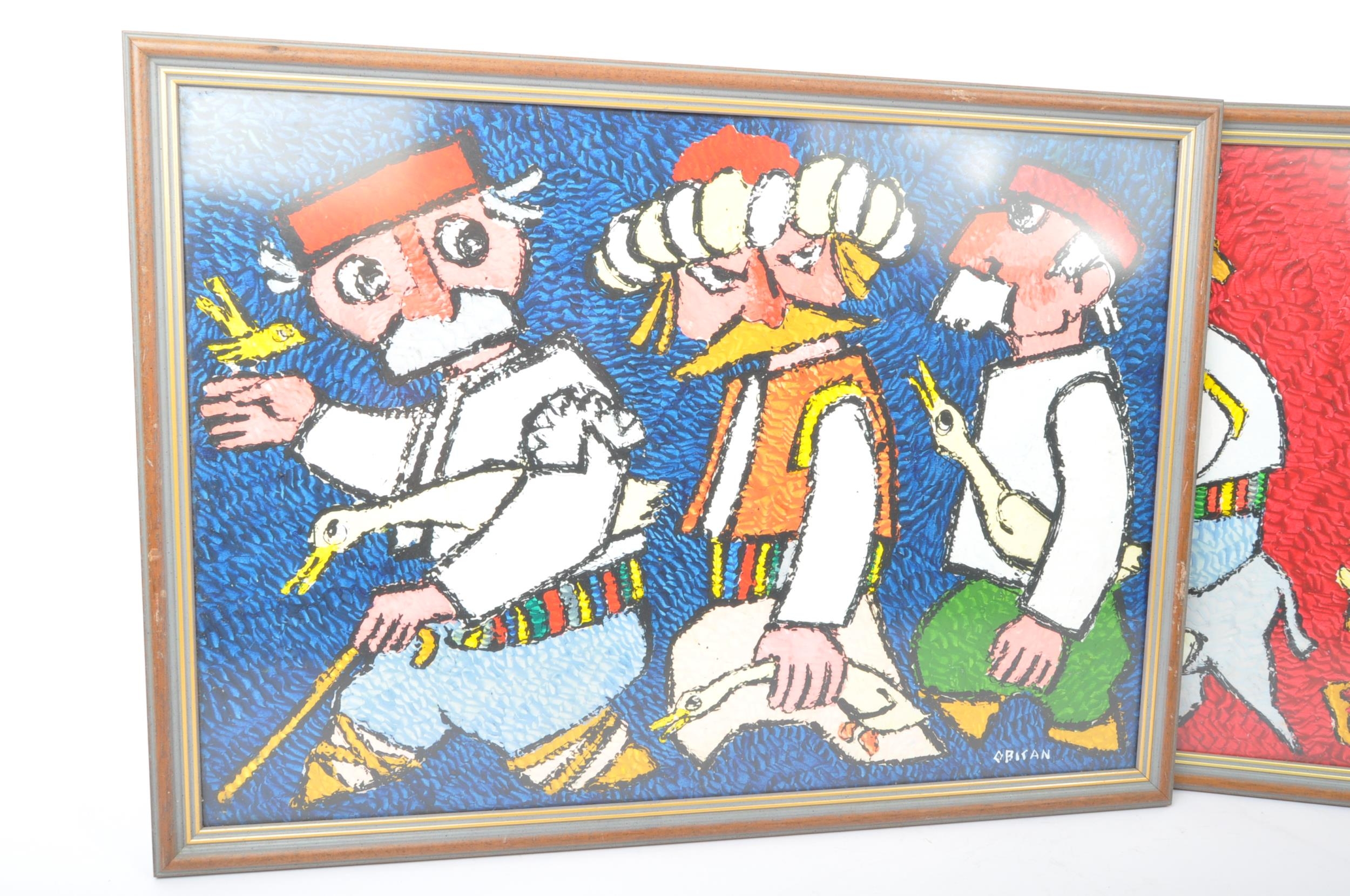 Jovan Obican (French, 1918 - 1986) - A pair of vintage 20th century acrylic on paper from the French painter & lithographer J. Obican depicting pair of man with donkey & birds, together with another depicting three men. Both the original paintings signed to bottom right. Framed & glazed. Each measuring approx. 54 x 39cm.