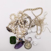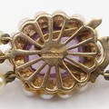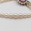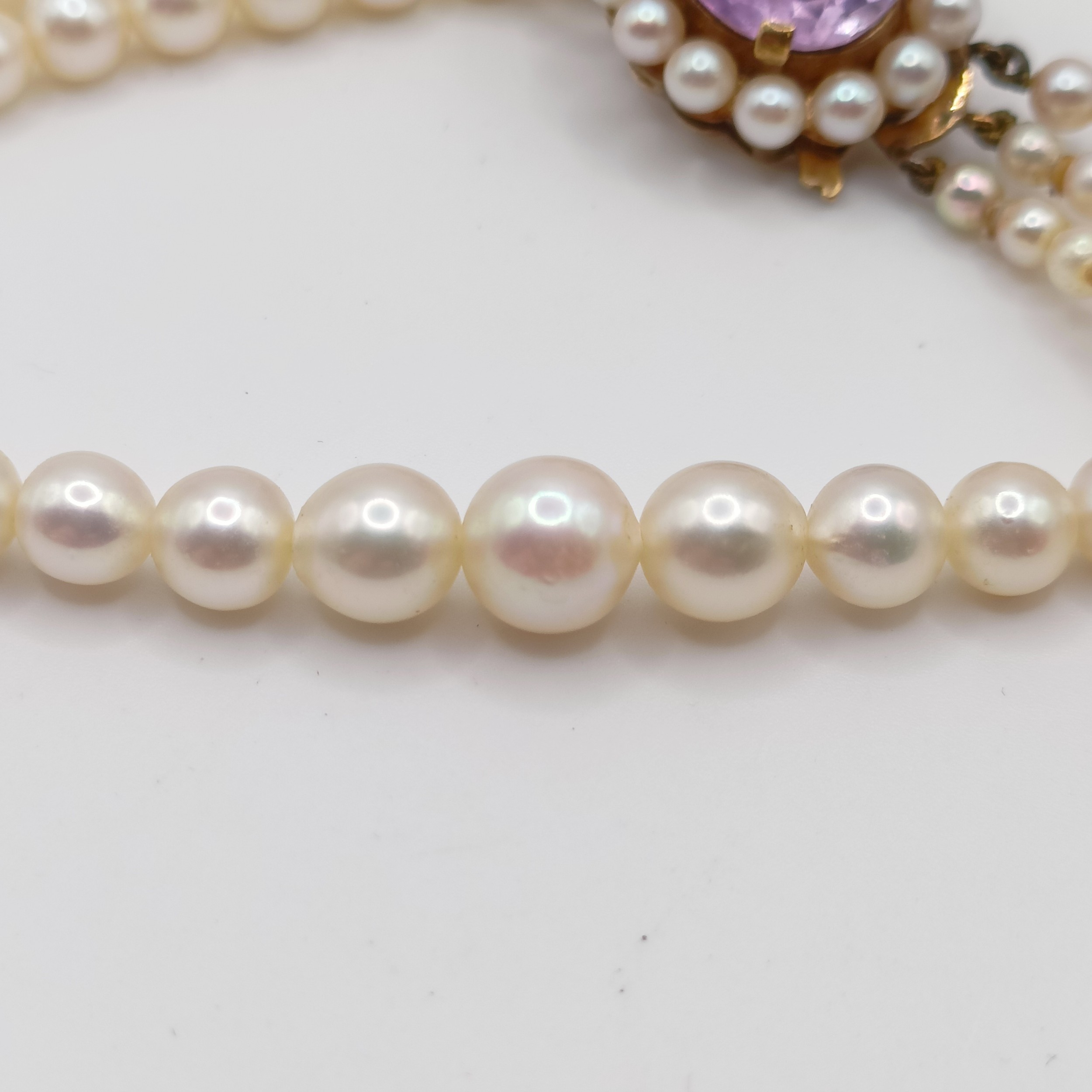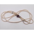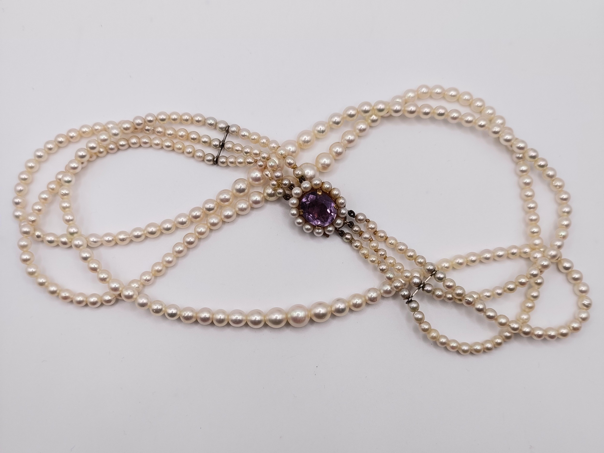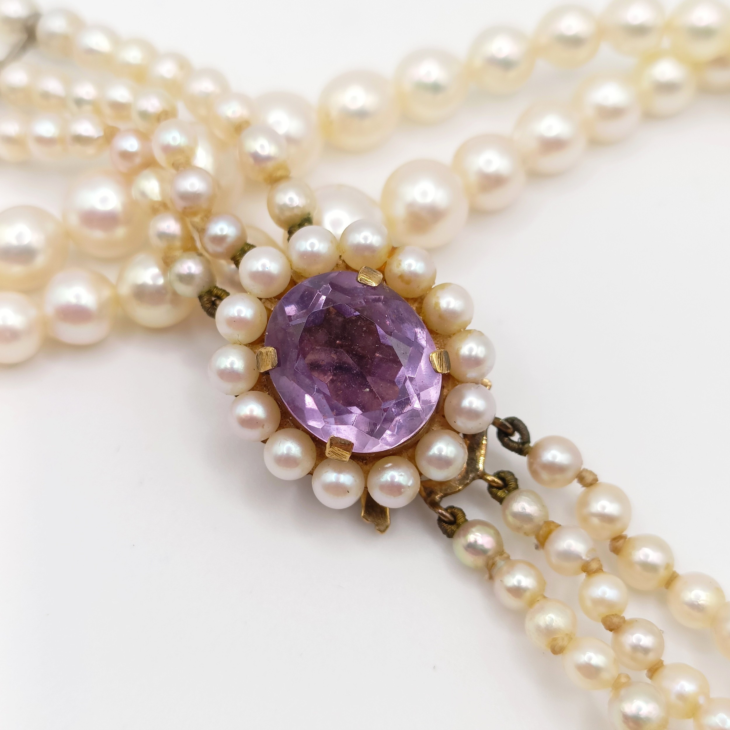 A cultured pearl triple necklace, with a 9ct gold and amethyst clasp