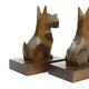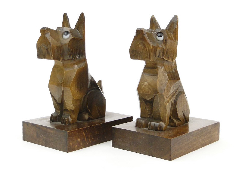 Pair of Black Forest style carved wood Cubist Scottie dog bookends with glass eyes, 15cm high