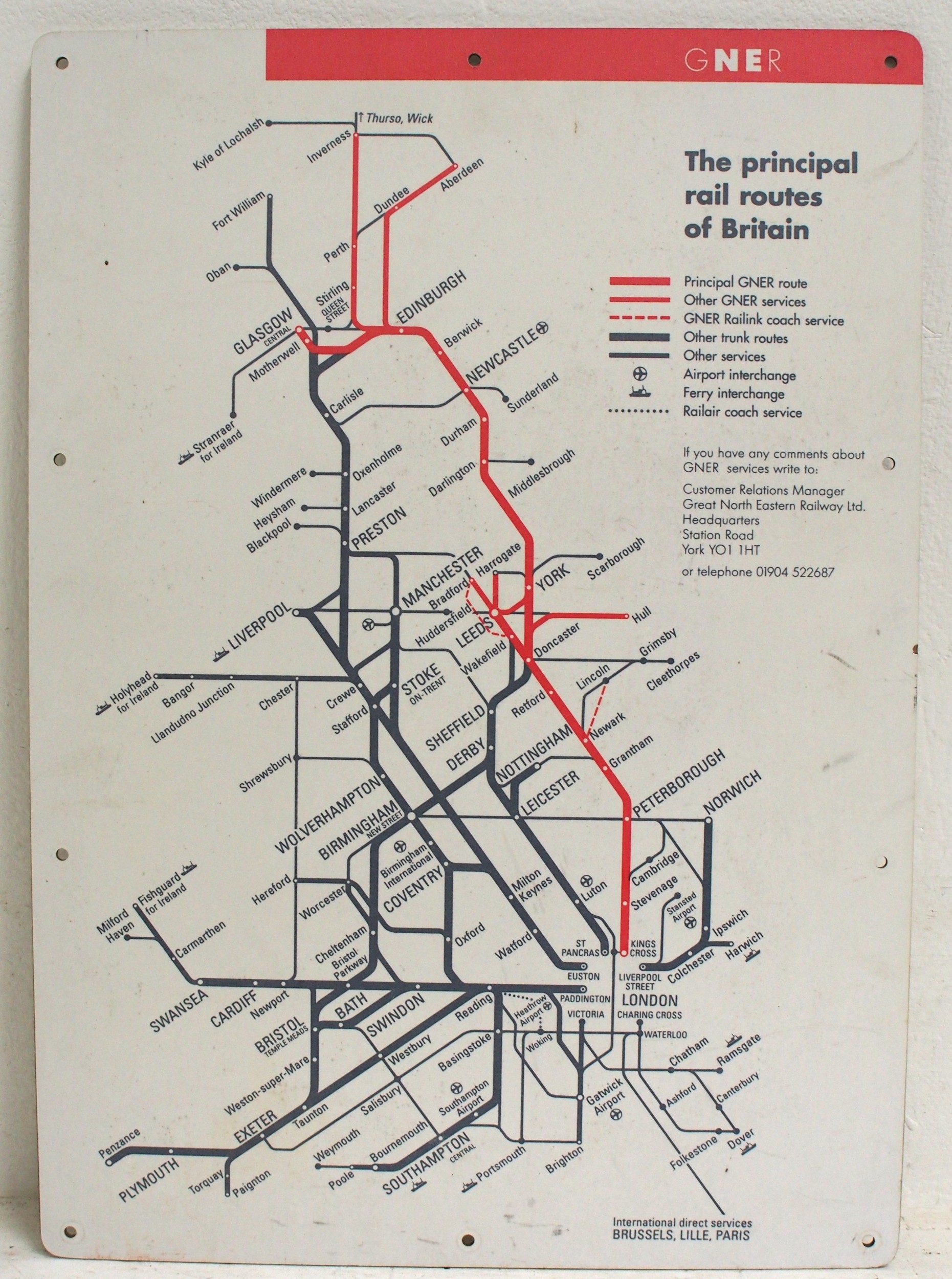 GNER Principle Routes route map on Formica 16½"x 23½". (C) (Dispatch by Mailboxes/Collect from Banbury Depot)