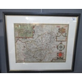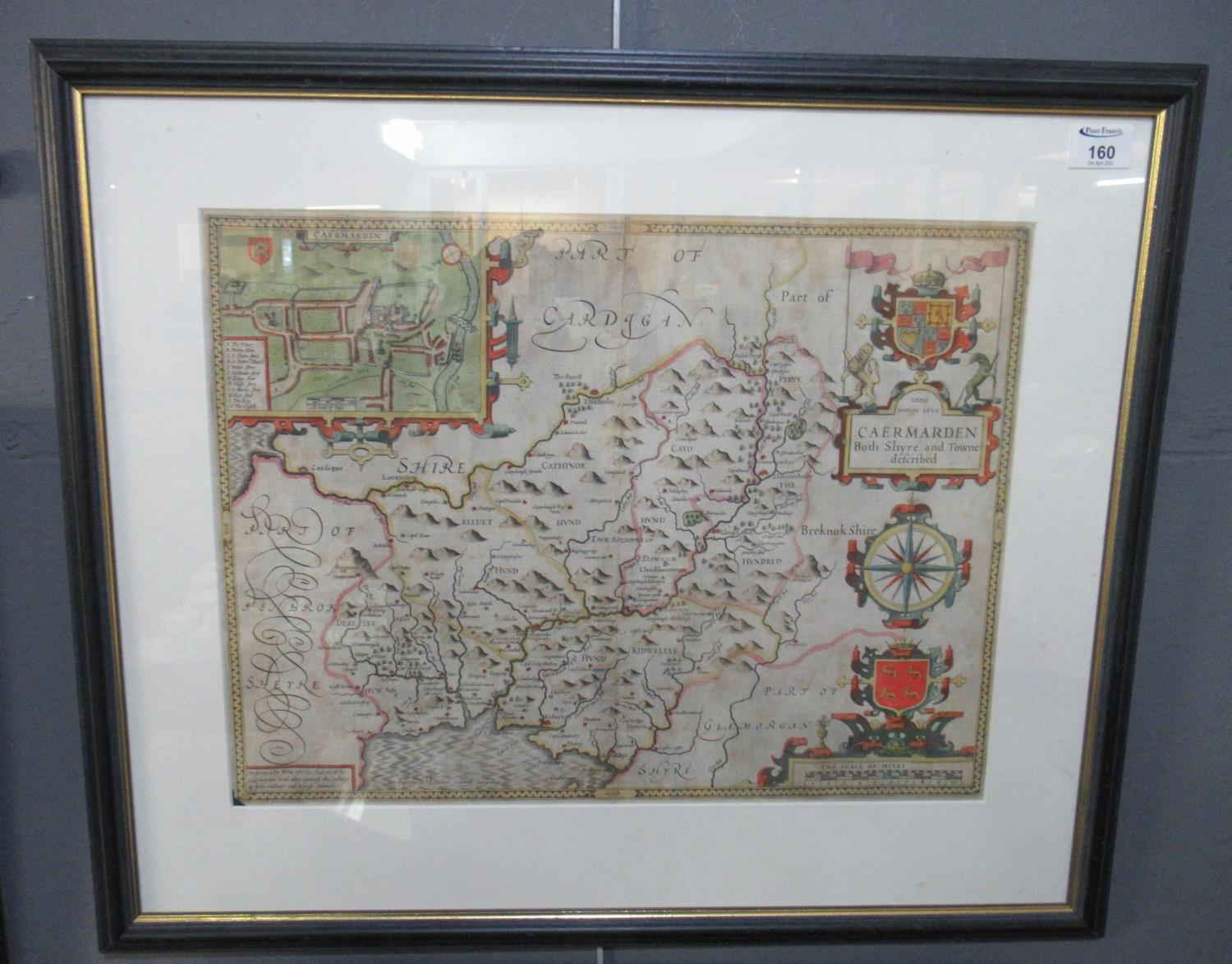 John Speede, Original hand coloured map of "Caermarden", Carmarthen, with vignettes and armorials ,Bradbury and Humble Edition. 38.5 X 51 approx framed and glazed