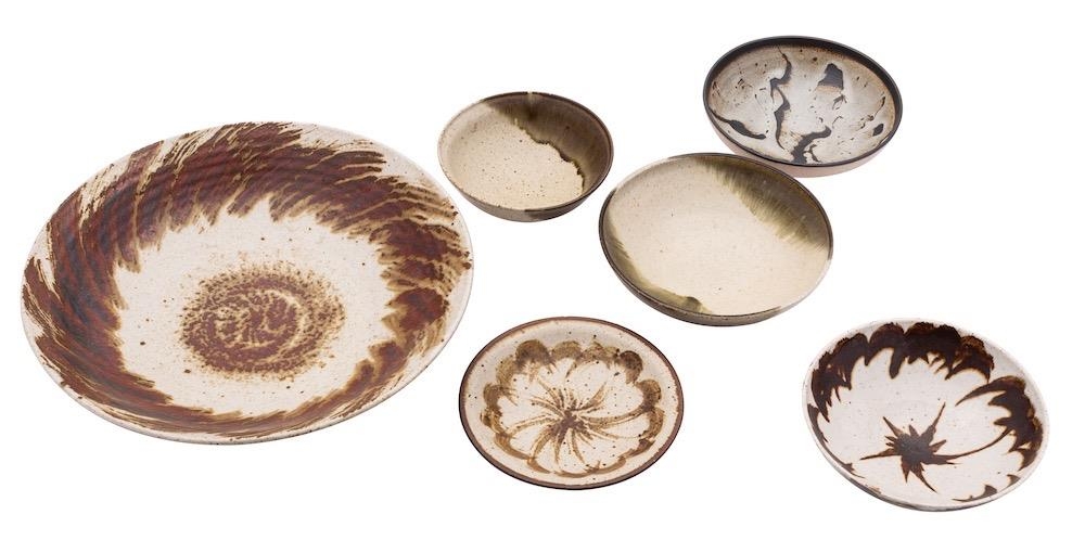 *Barbara Cass [1921-1992] six stoneware dishes and bowls, decorated variously, incised 'B.C. Arden', largest 33cm diameter.