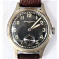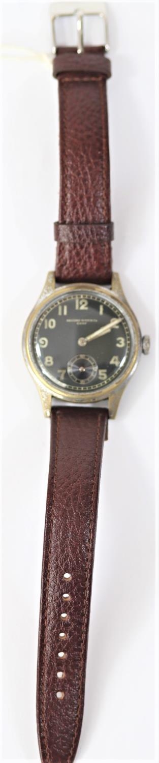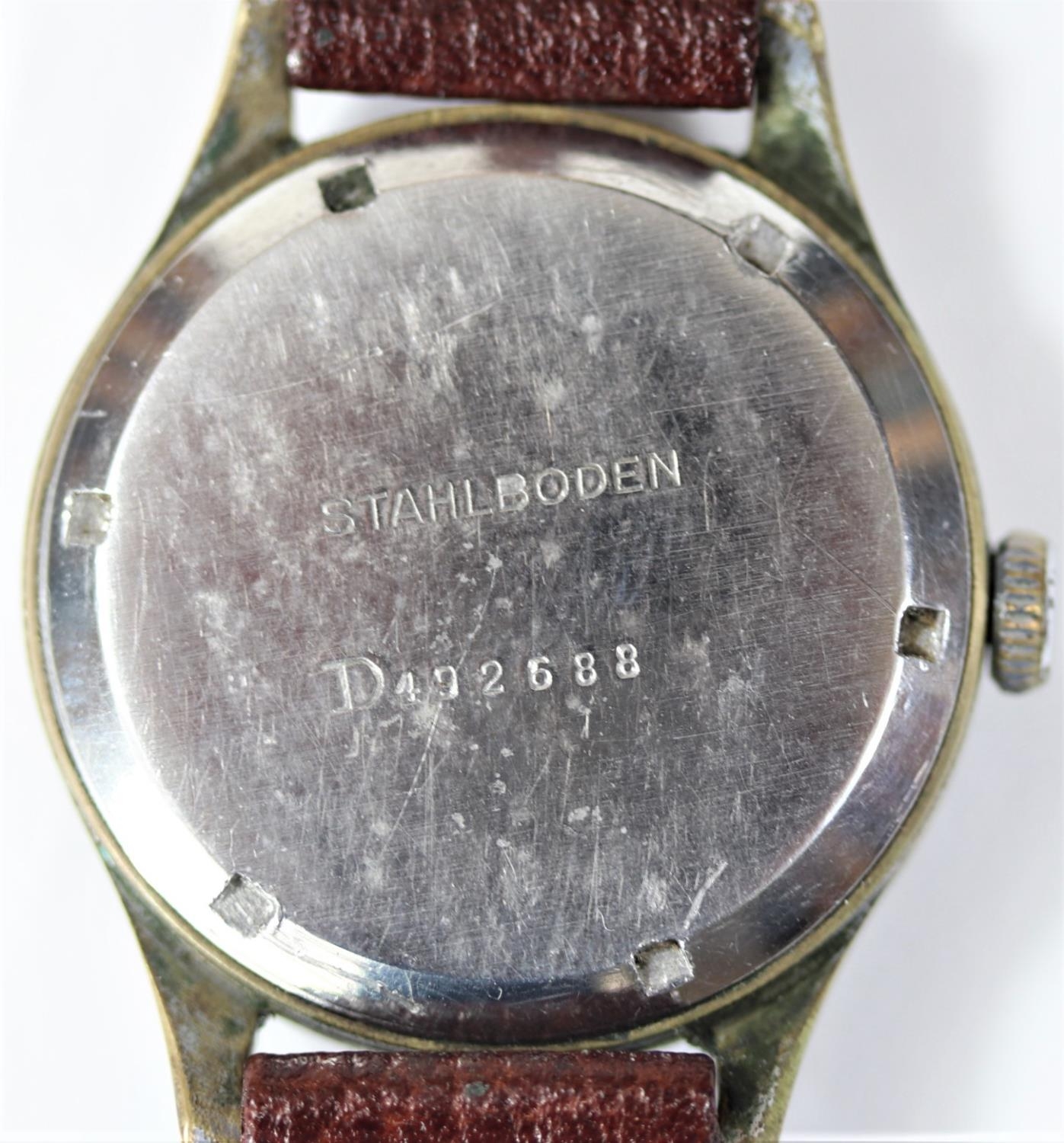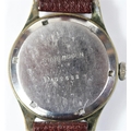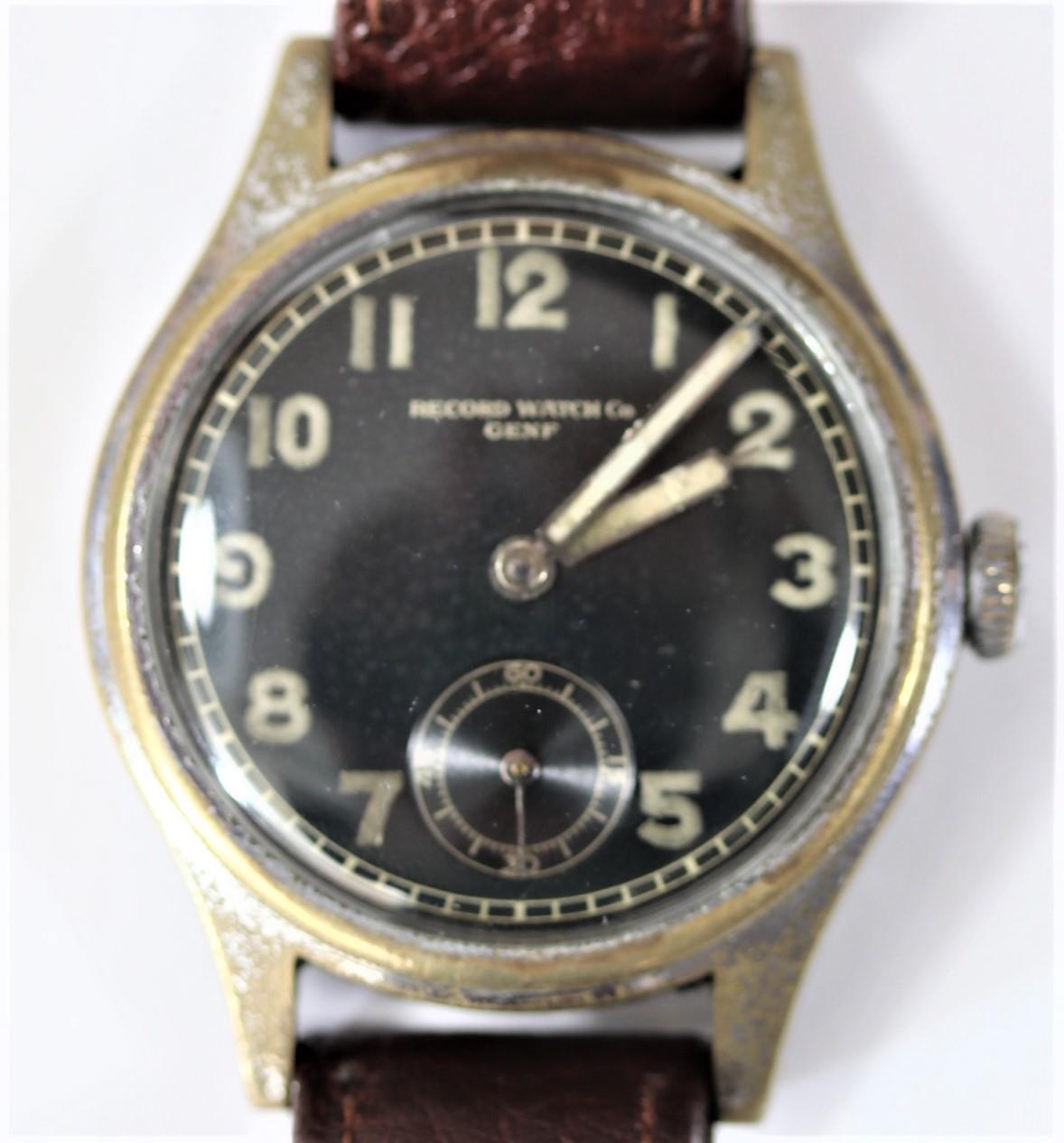 D marked Record Watch Co wristwatch. Serial D492688. Plated case, brushed finish, heavy wear to plating, 34mm without crown. Screw caseback, marked stahlboden. Dial has light spotting, signed Record Watch Co Genf. Luminous material likely replaced. Record 022K movement, signed on ratchet wheel, shock protected balance, running condition. Movement ring present. QGC