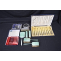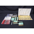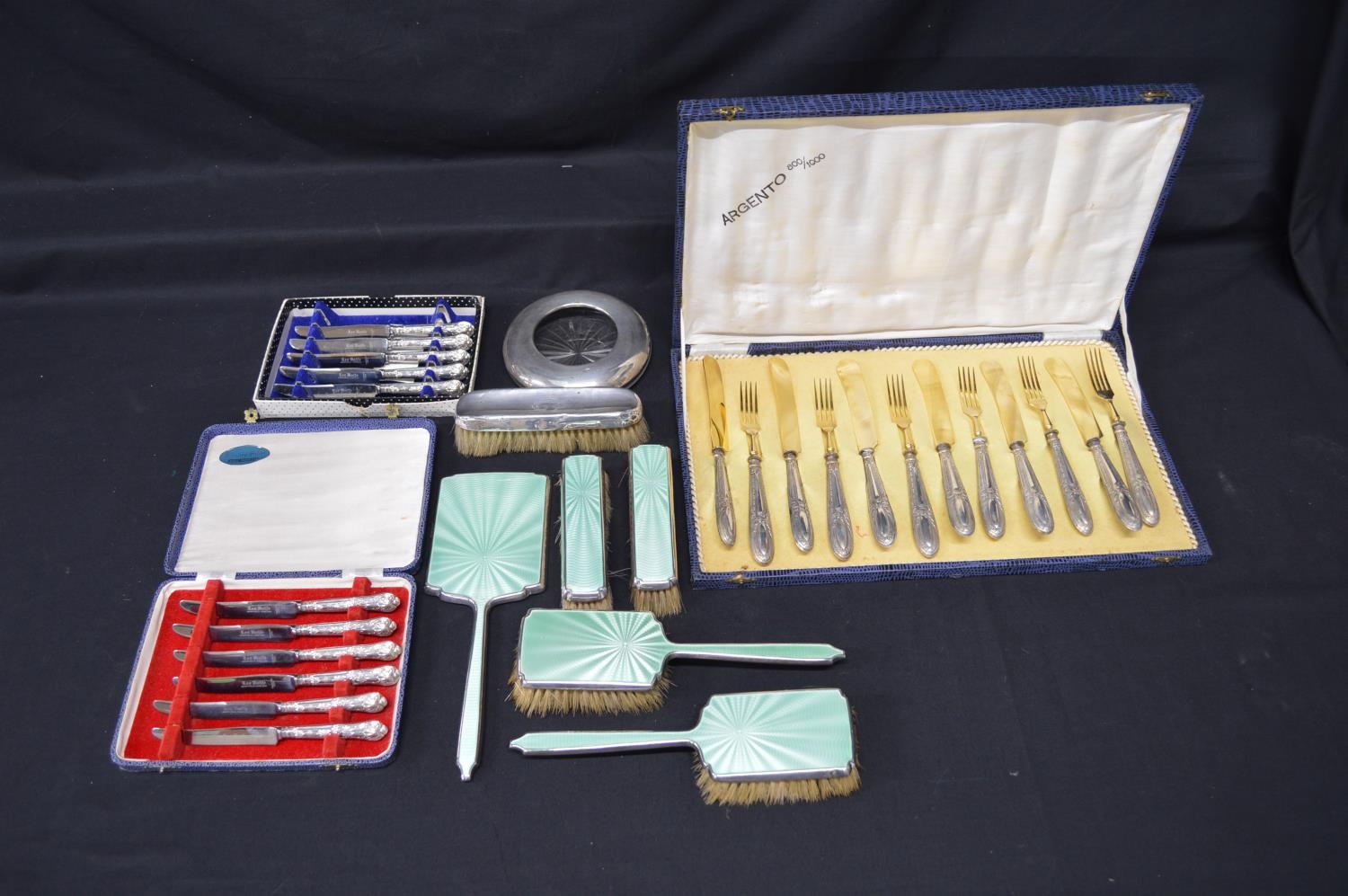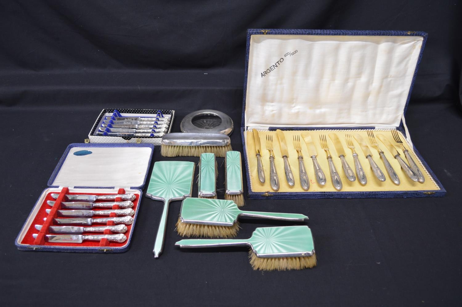 Group of silver items to comprise: quantity of silver handled cutlery, silver mounted glass ashtray and enamel backed dressing table set