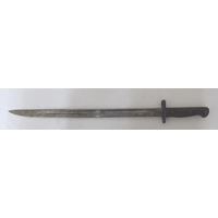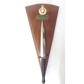 Royal Marines Commando Knife/Dagger, black grip, steel blade mounted on wooden plaque with staybright cap badge