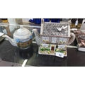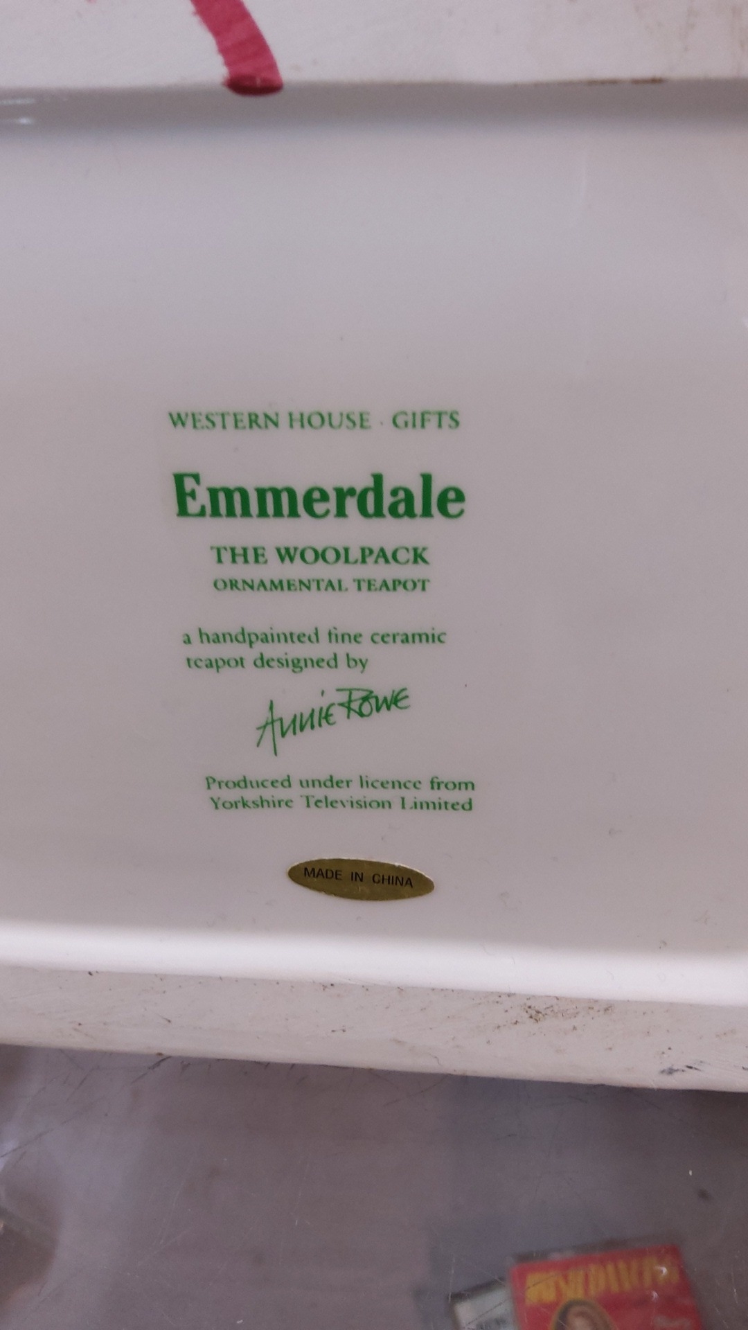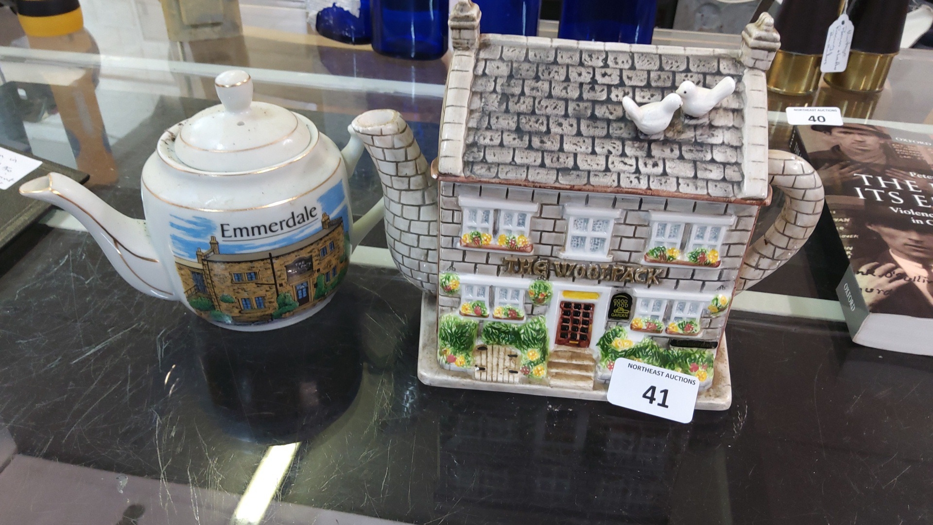 Pair of Emmerdale television-themed ceramic teapots, comprising a cylindrical pot with printed homestead view and a hand-painted cottage-form “The Woolpack” teapot designed by Annie Rowe, licensed by Yorkshire Television.