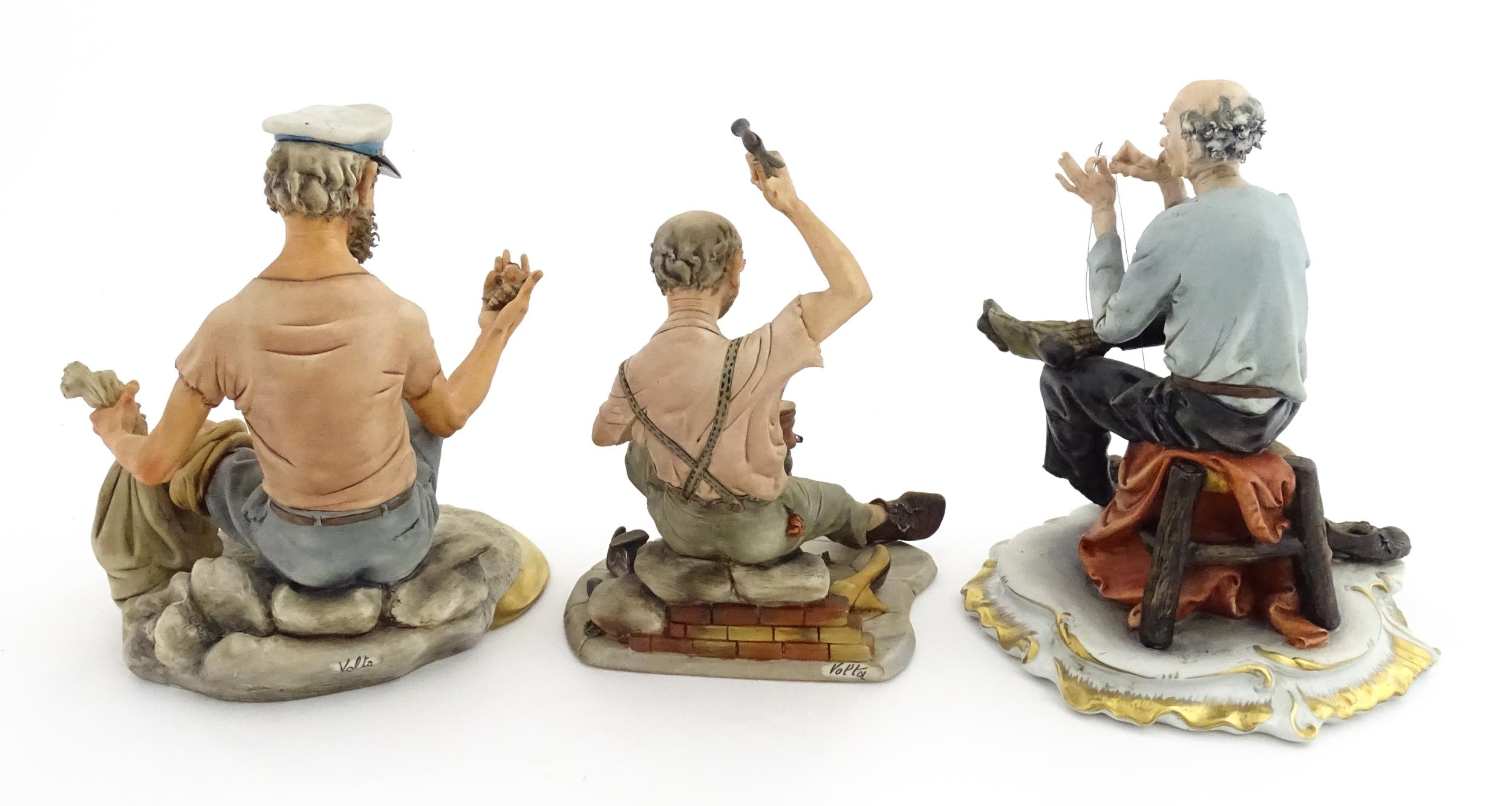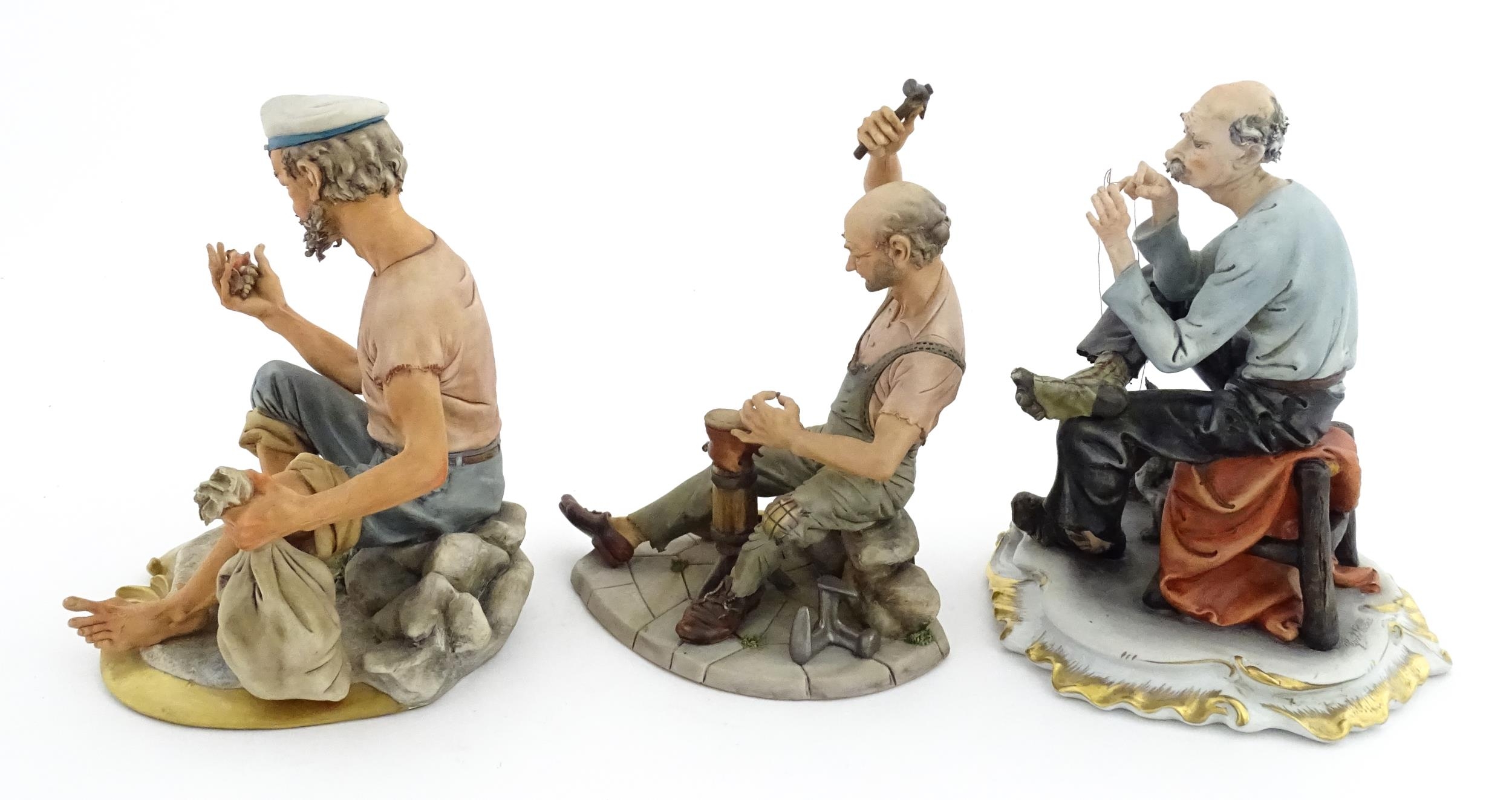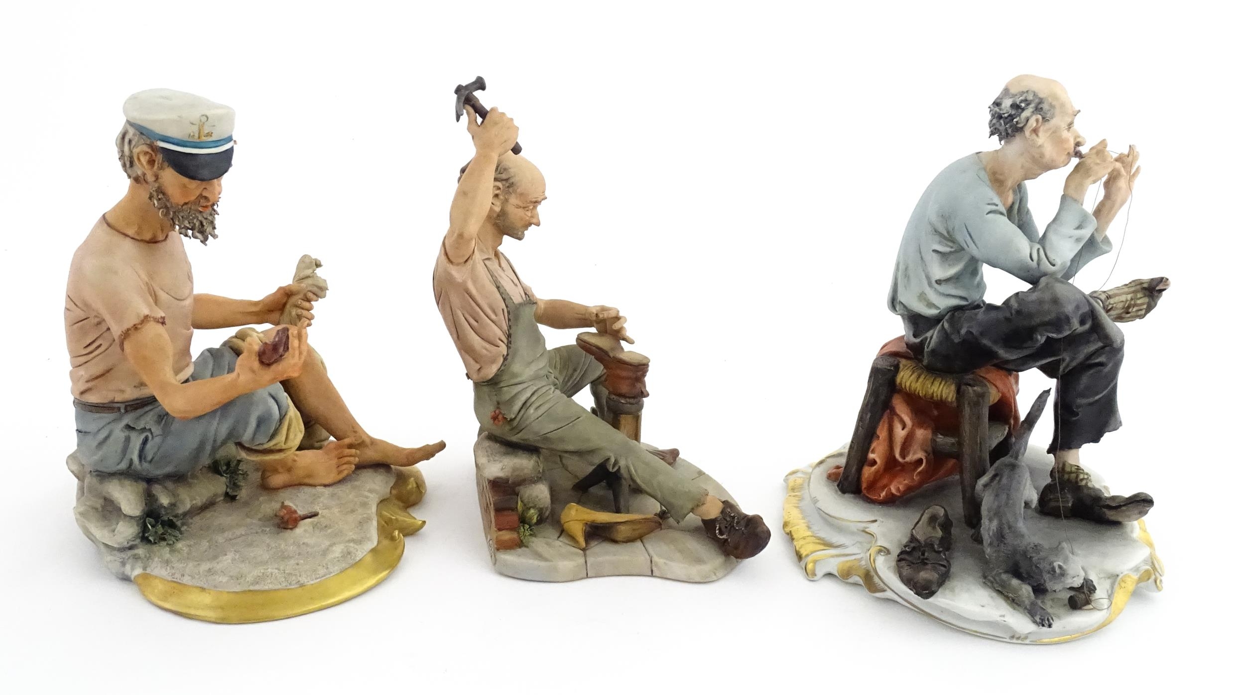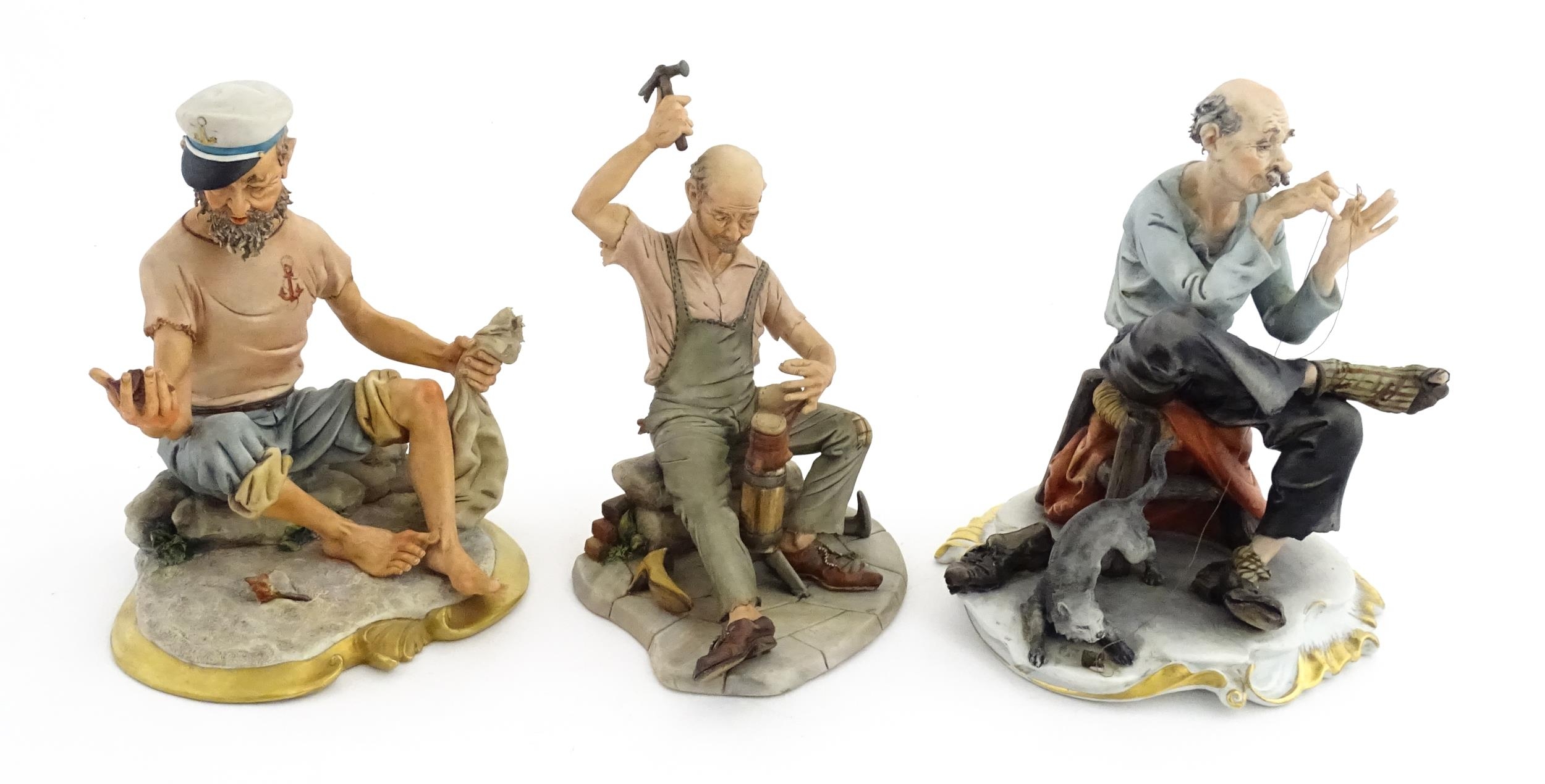 Three Capodimonte figures comprising a model of a sailor, a cobbler, and a tramp with needle and thread. Two signed Volta, and one signed Tyche Tosca. Largest approx. 9 1/4" high (3)