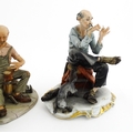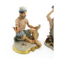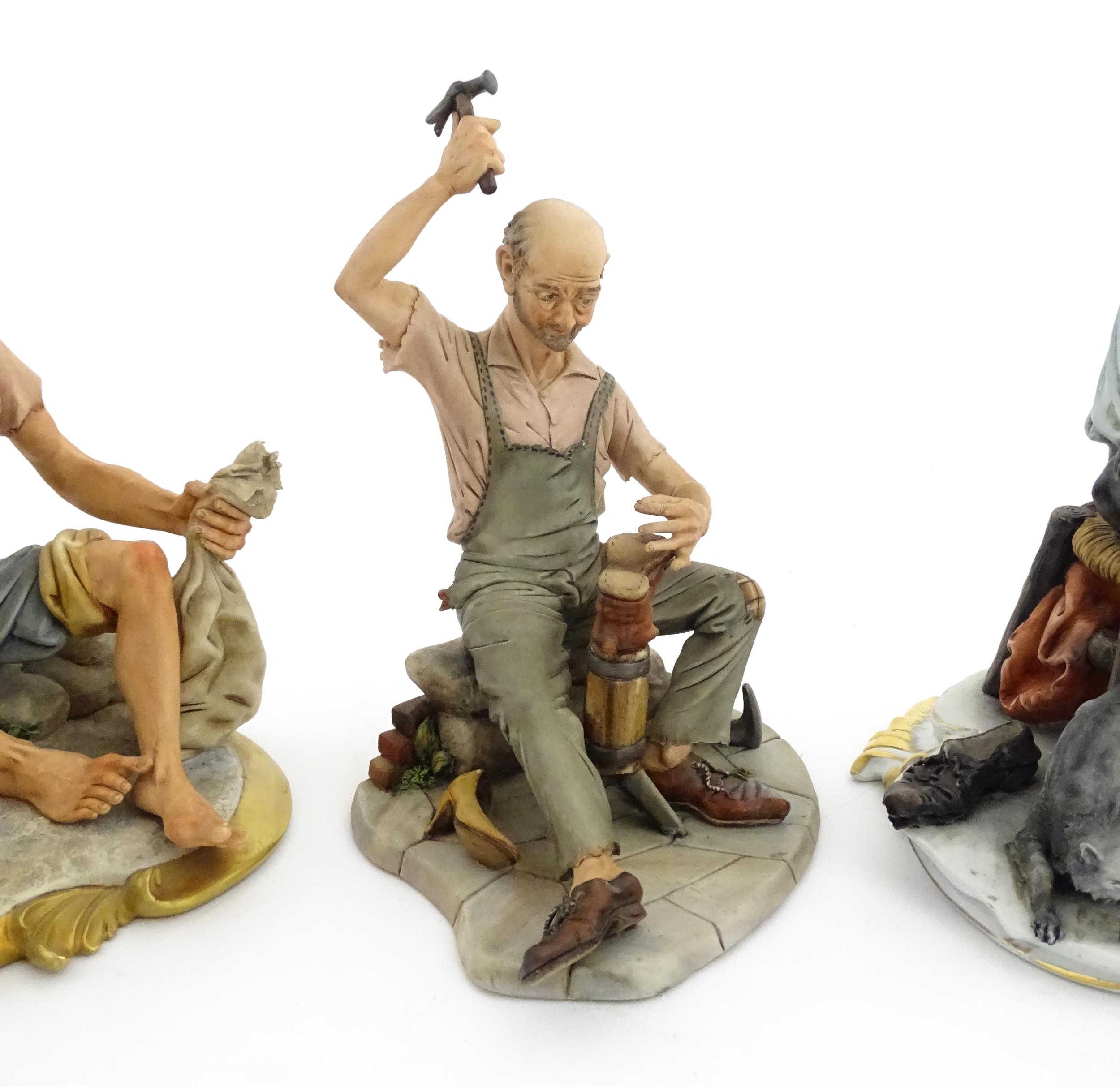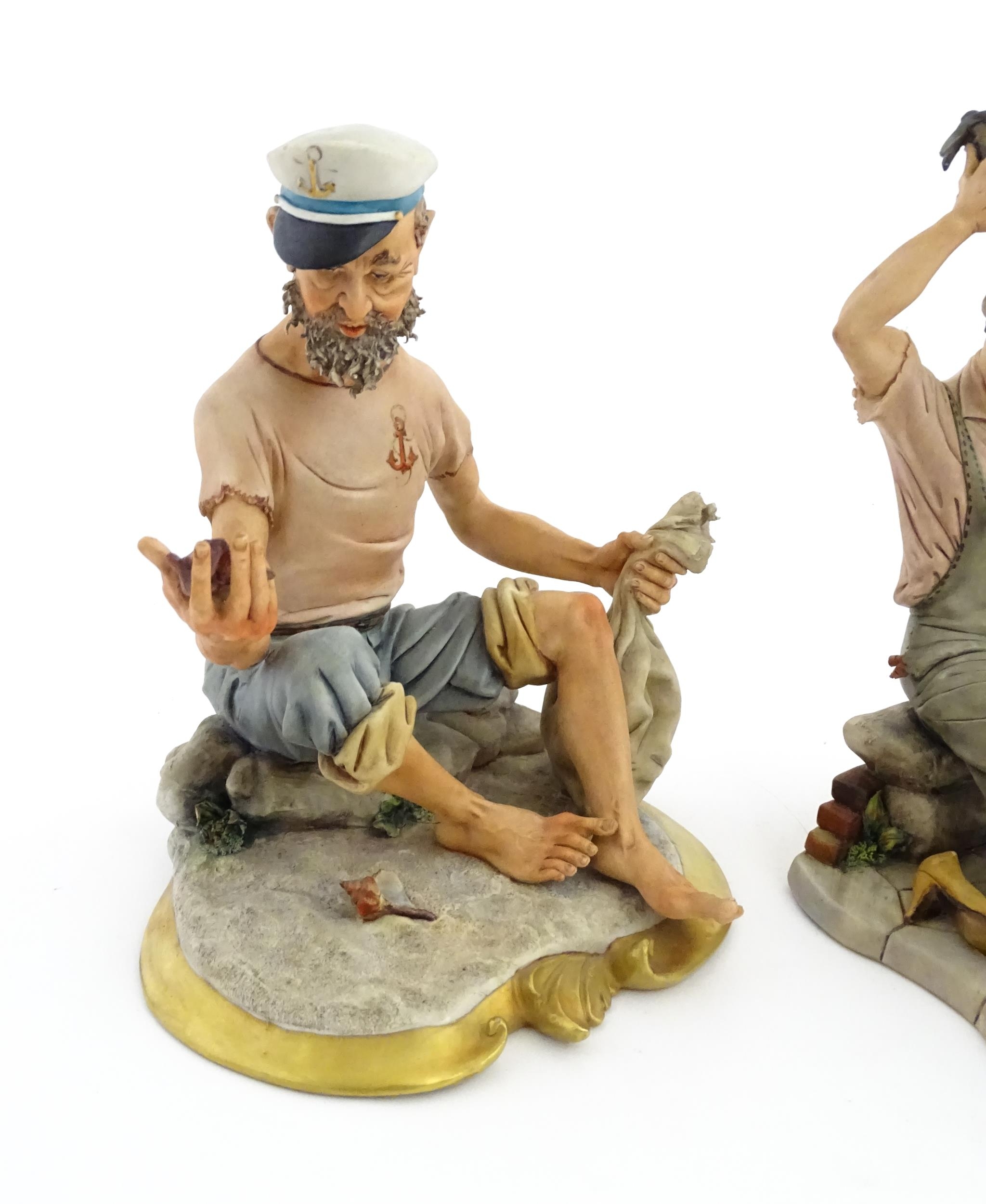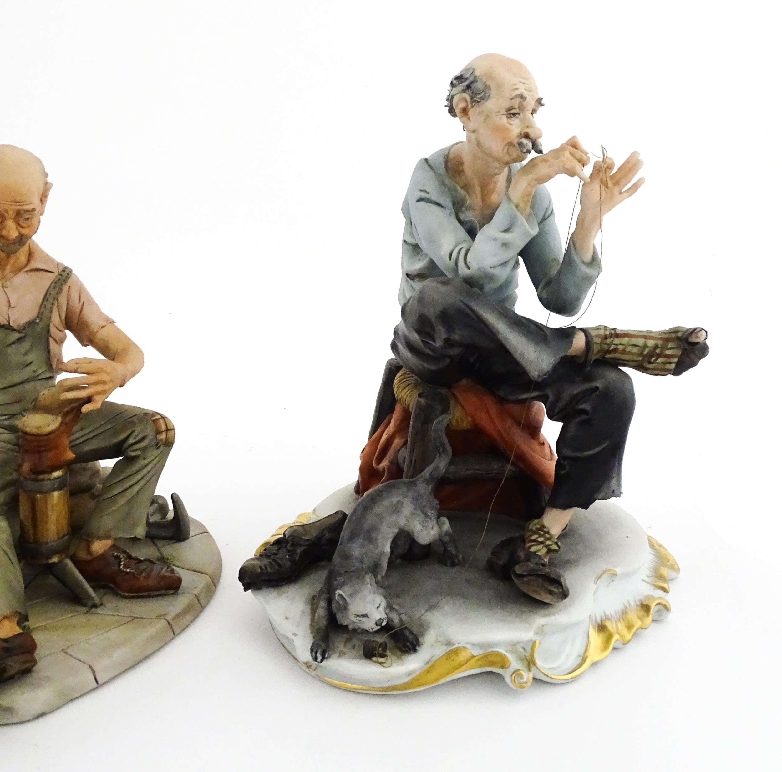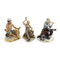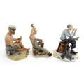 Three Capodimonte figures comprising a model of a sailor, a cobbler, and a tramp with needle and thread. Two signed Volta, and one signed Tyche Tosca. Largest approx. 9 1/4" high (3)