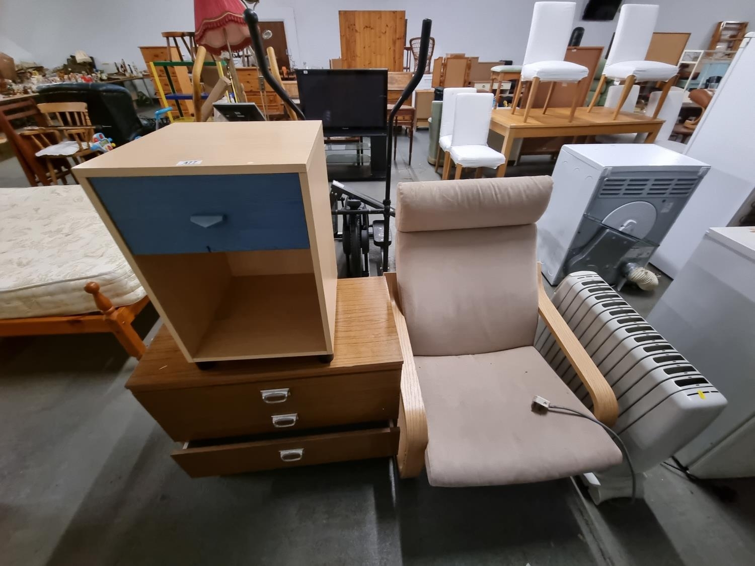 Electric heater, chest of drawers, Ikea armchair etc