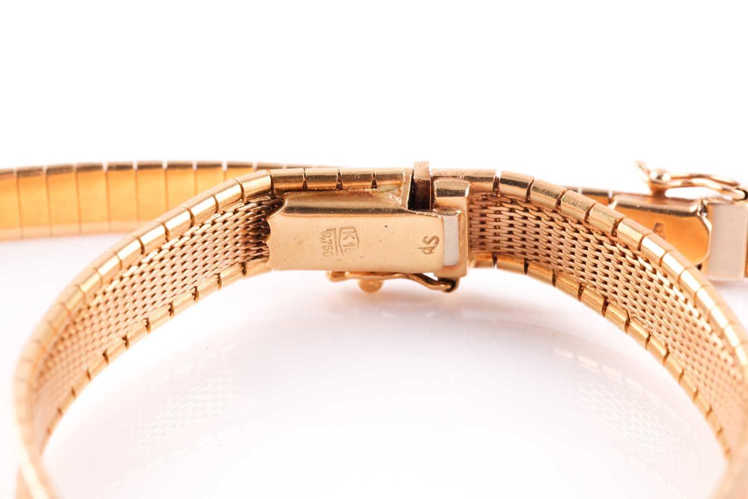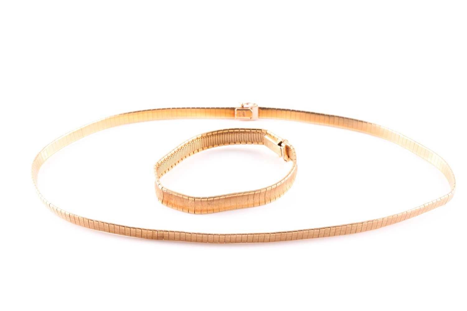 An 18ct yellow gold necklet, of articulated links with brushed finish, approximately 43 cm long, approximately 0.5 cm wide, together with a similar 18ct yellow gold bracelet, bracelet 16.5 cm long, both marked 750.
