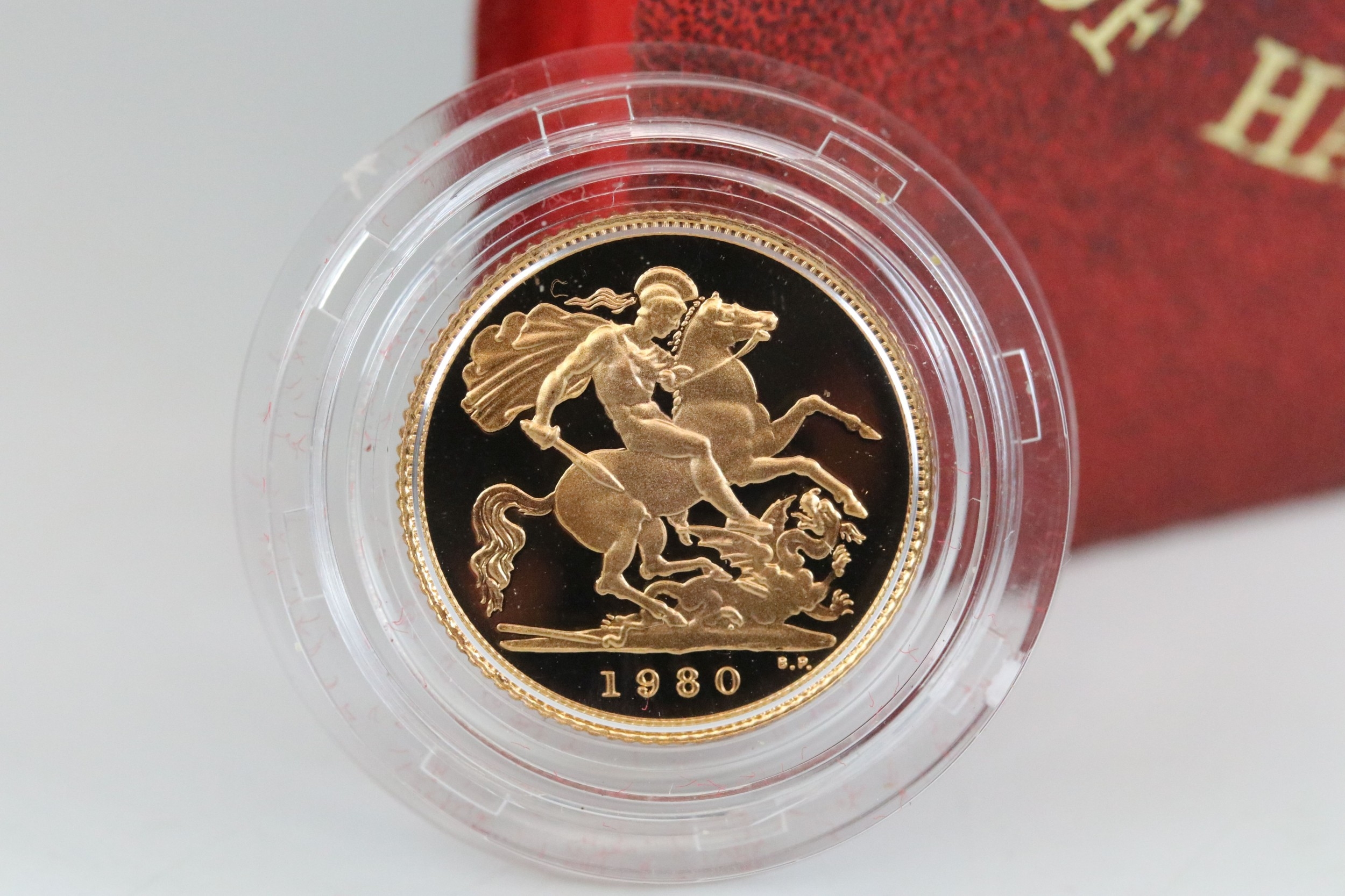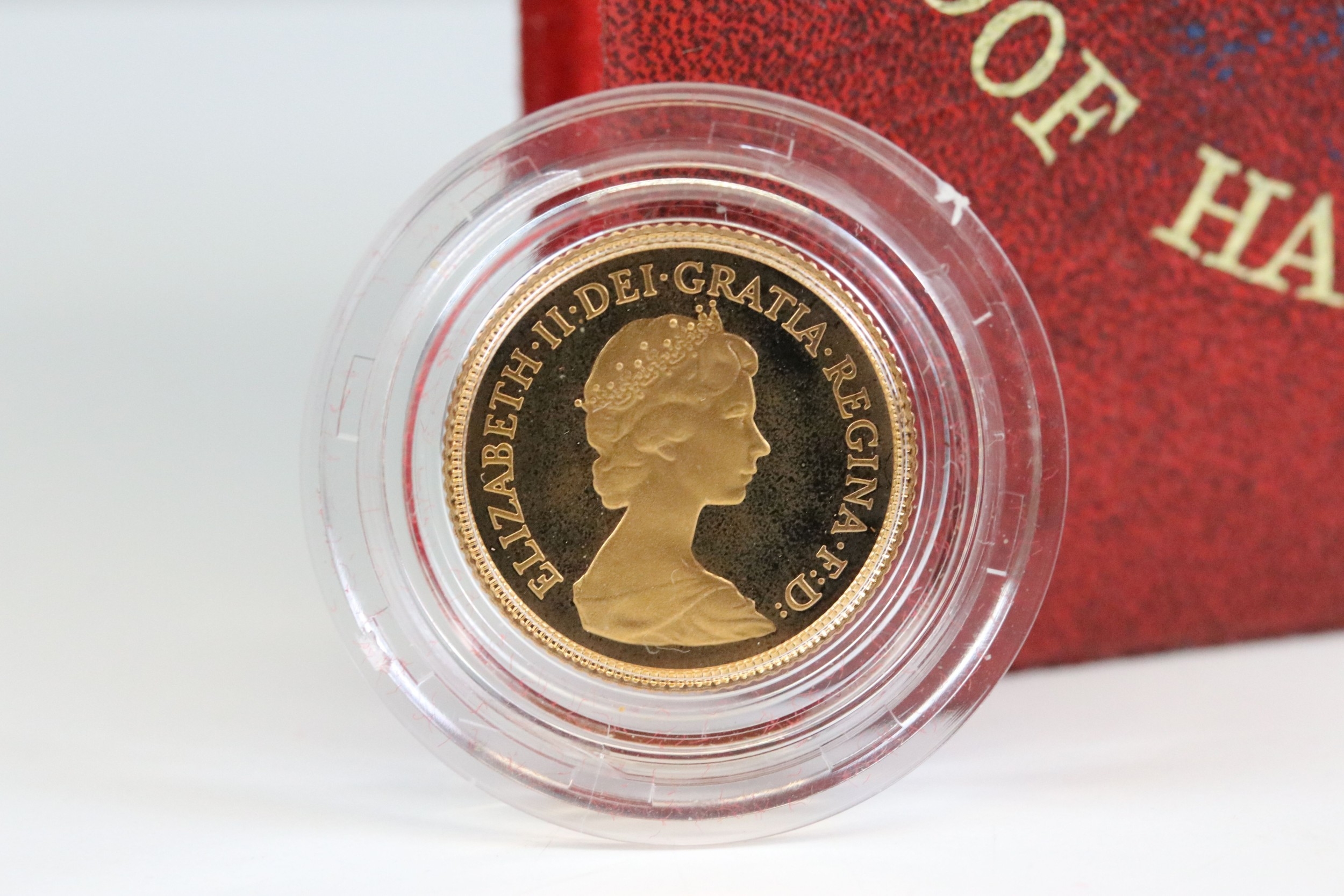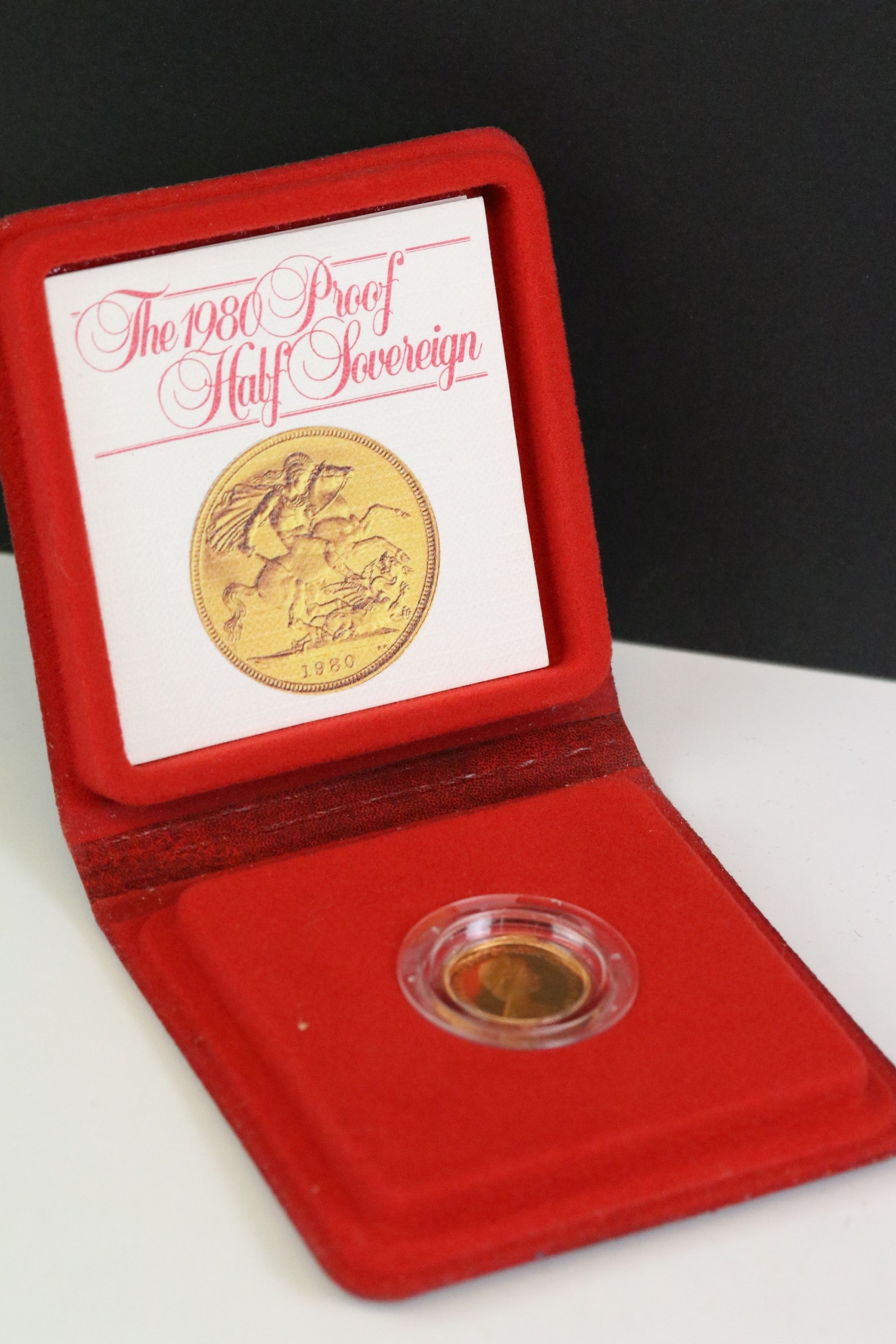 A Royal Mint United Kingdom Queen Elizabeth II 1980 gold proof half sovereign coin, encapsulated within fitted display case.