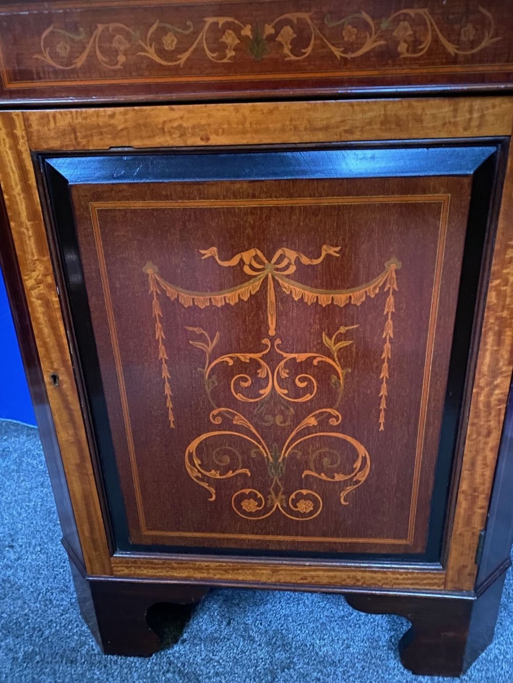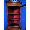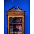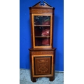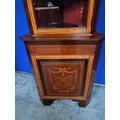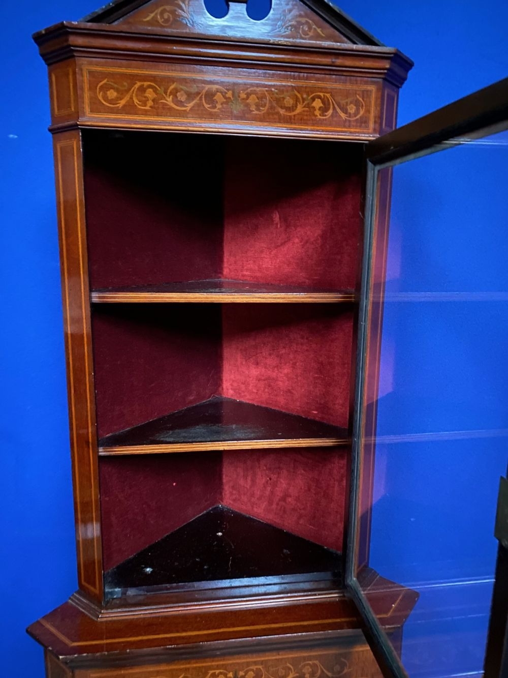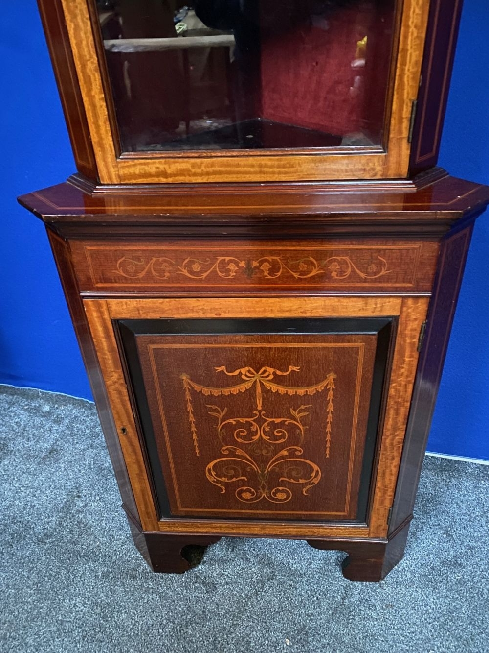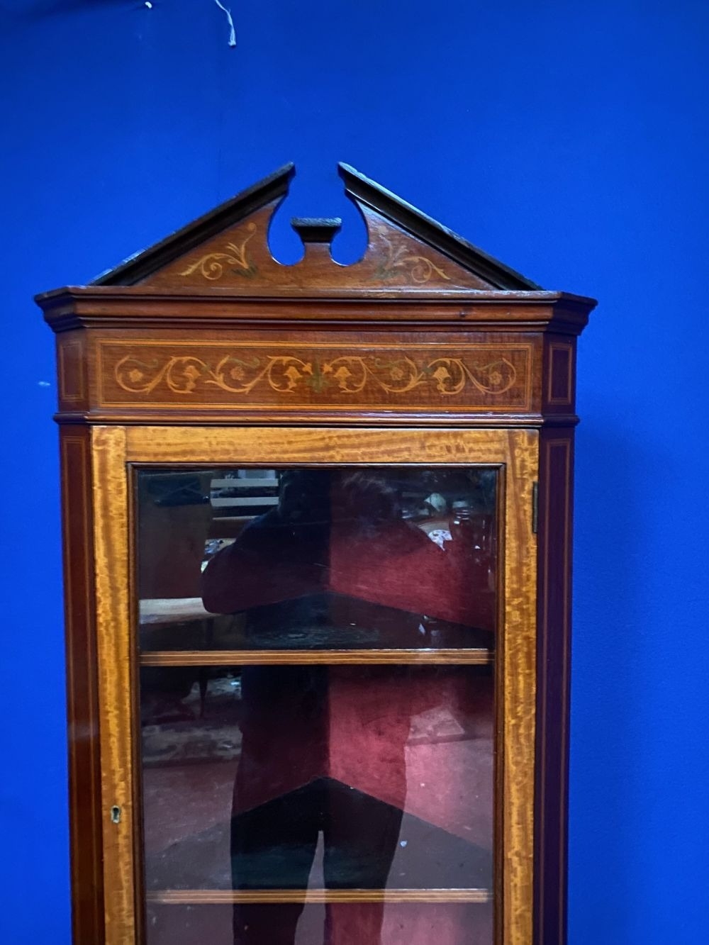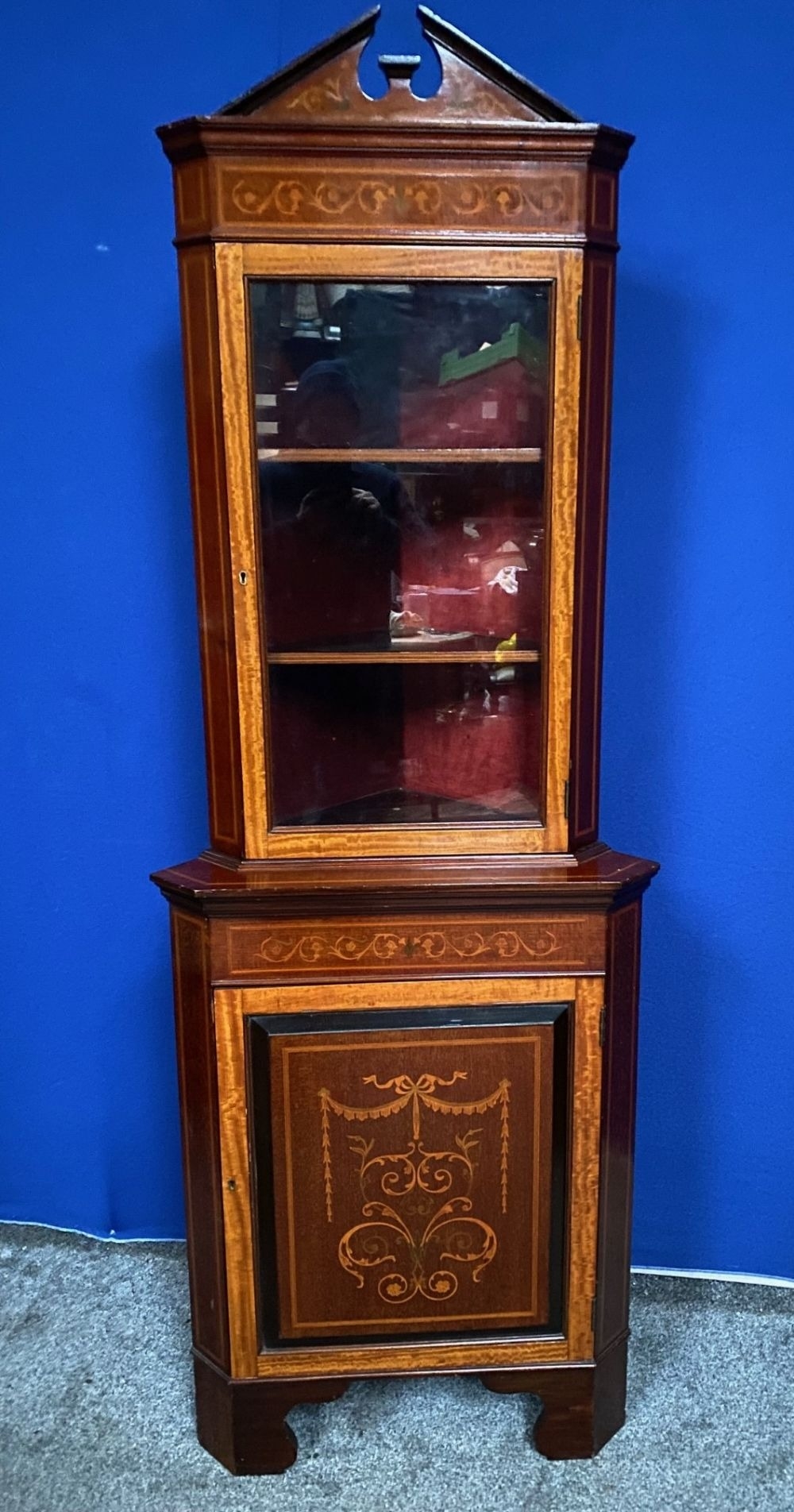AN EXCELLENT MAHOGANY INLAID CORNER CABINET, in the Edwards & Roberts style. With pediment to top above glass panelled door revealing shelved interior, the base with one drawer over door raised on bracket feet. With intricate marquetry inlay throughout. Dimensions: 70cm wide x 197cm high approx.