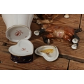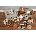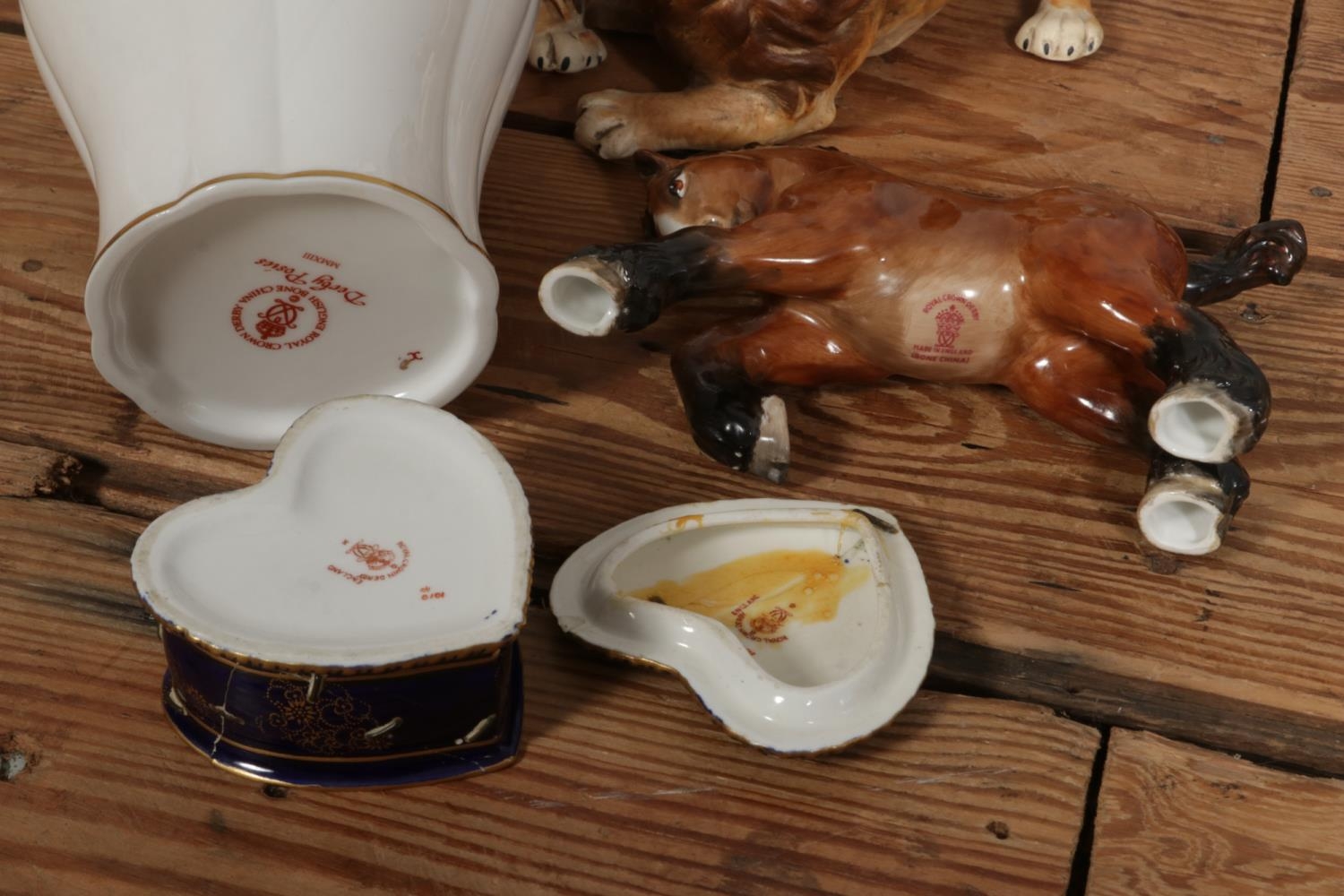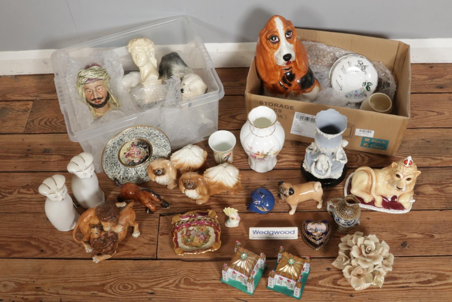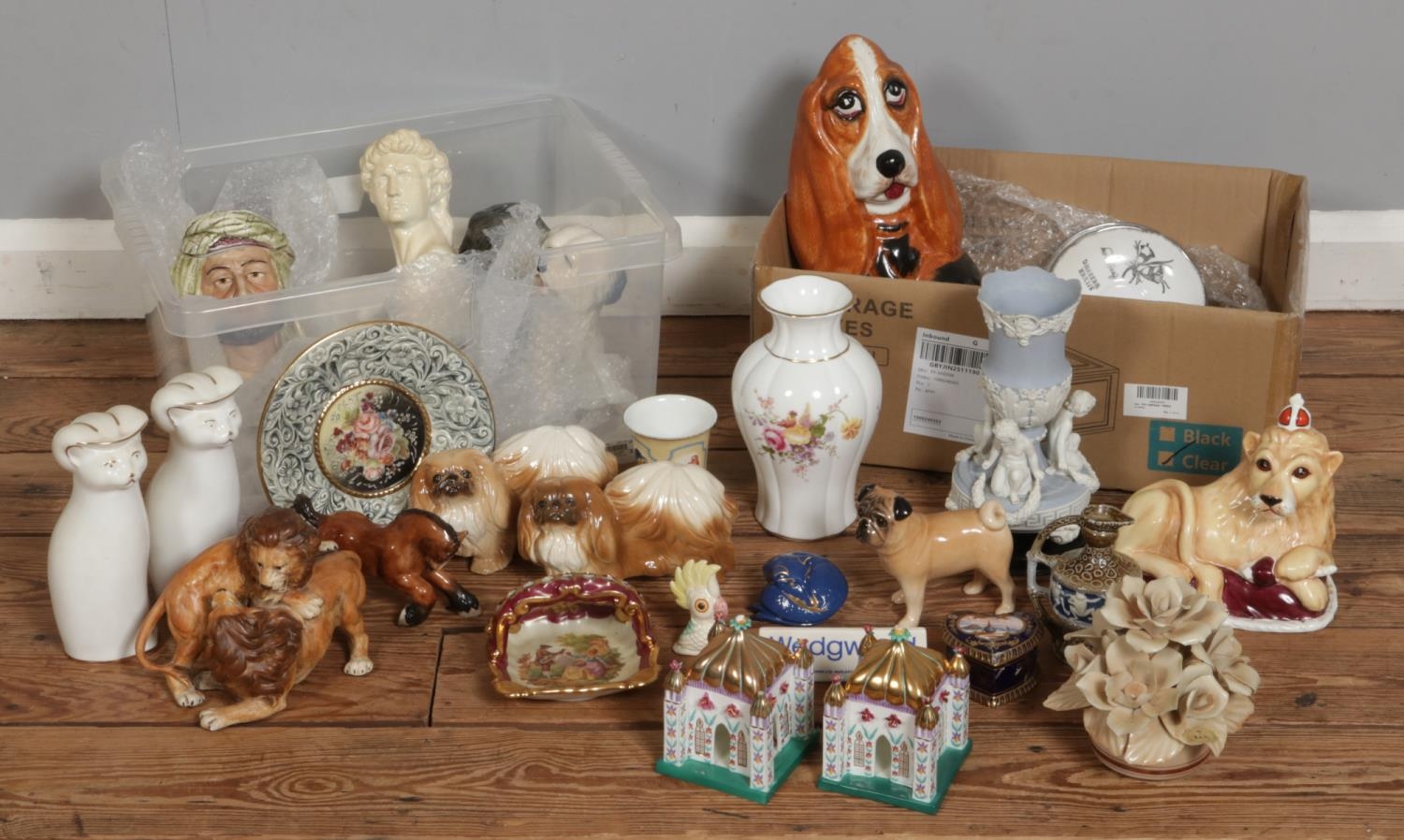 A good collection of cermamics; Including Price Kensington basset hound dog figure, a pair of Coalport Orchid Retreat examples, a Royal Stratford lion figure, a capodimonte floral bouquet, a Jasperware style centrepiece, pair of Royal Vale cat figures, capodimonte plate, Royal Crown Derby examples and other examples.