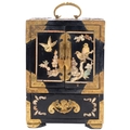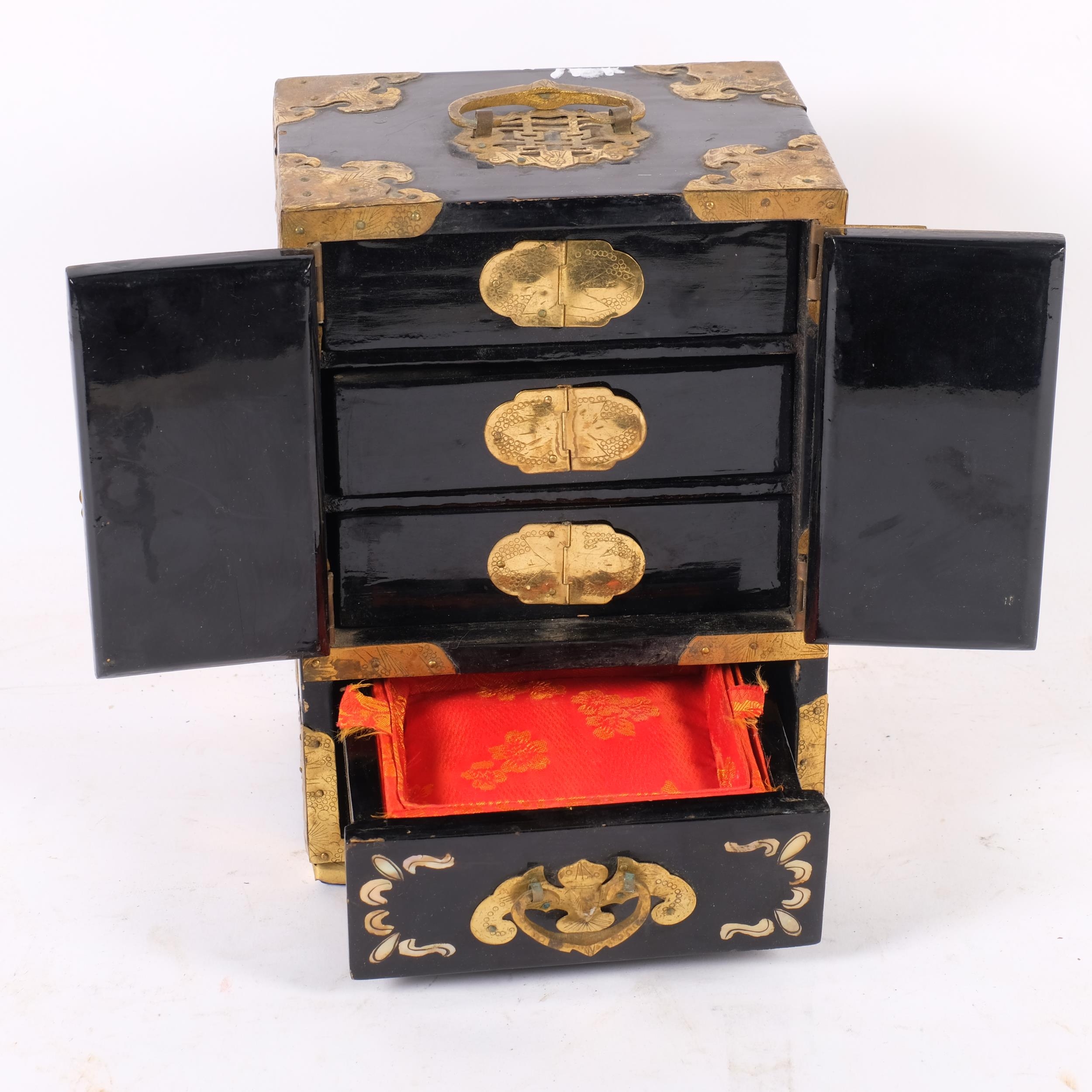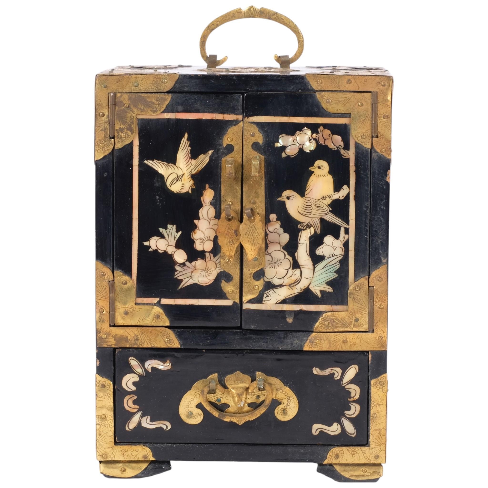A Chinese black lacquered jewellery cabinet, with brass mounts and inlaid mother-of-pearl decoration, W15.5cm, H21.5cm, D12cm