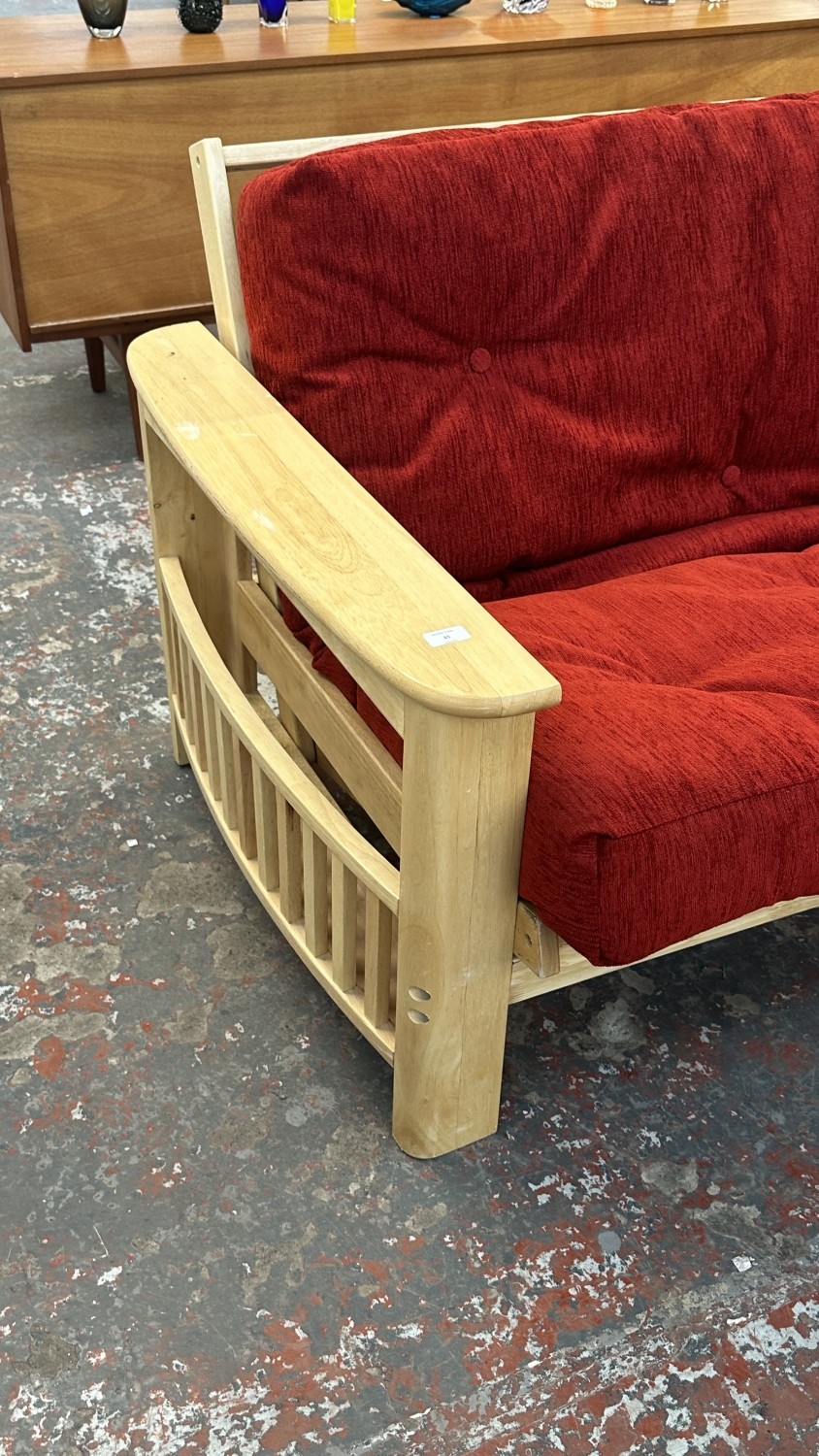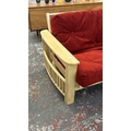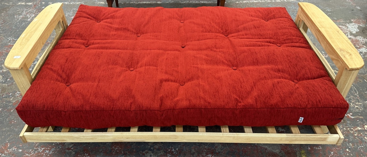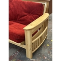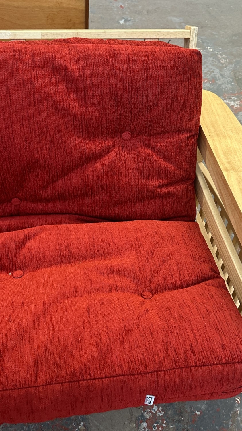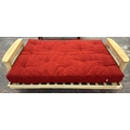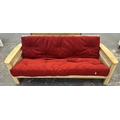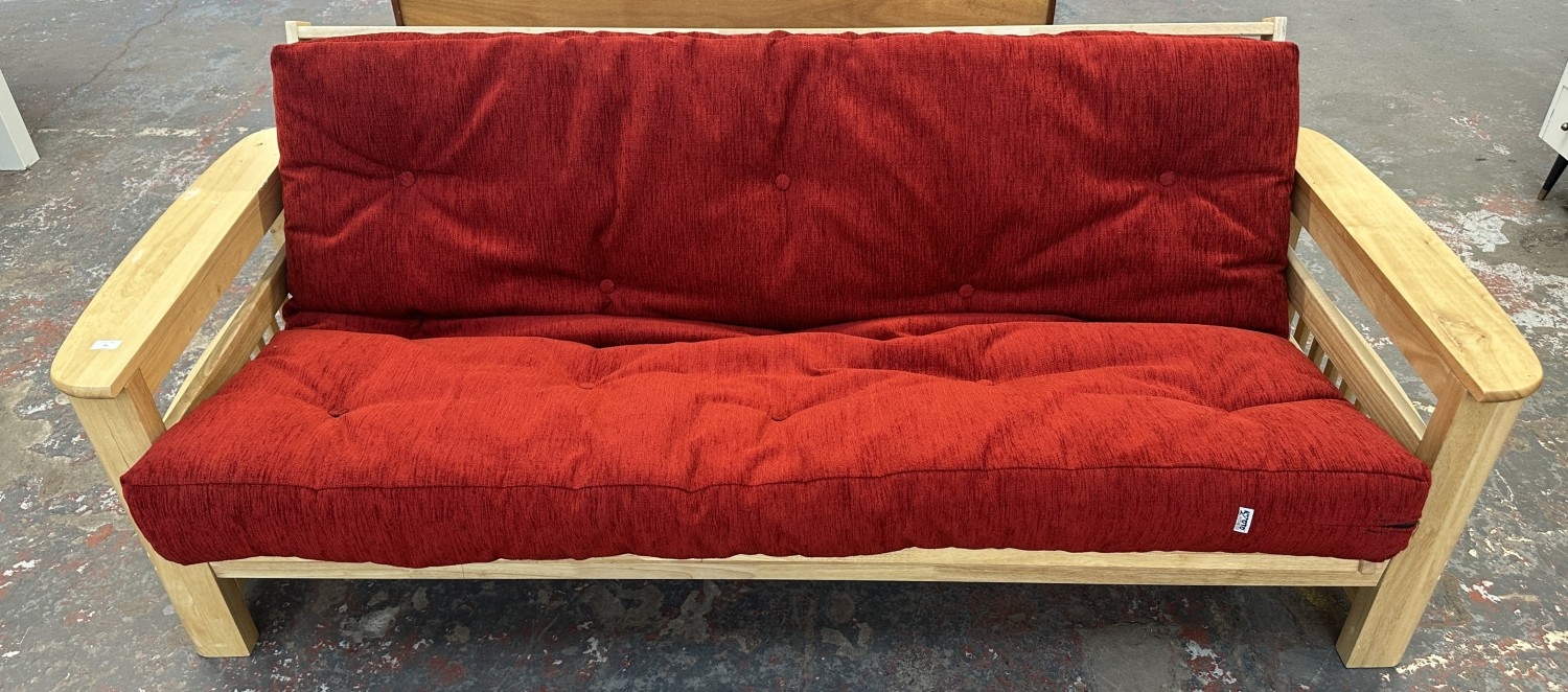 A modern beech sofa bed with Kyoto Futons Ltd. red fabric upholstered cushion - approx. 82cm high x 217cm wide x 92cm deep