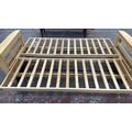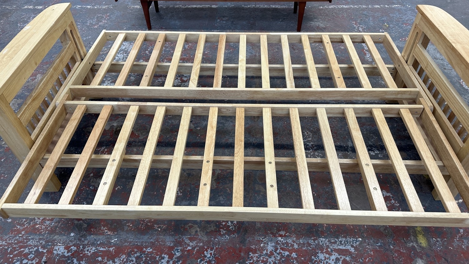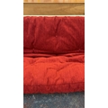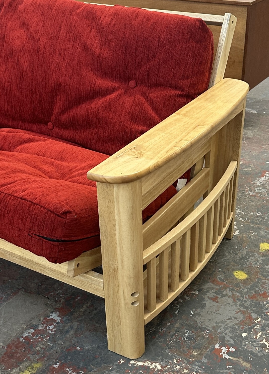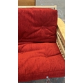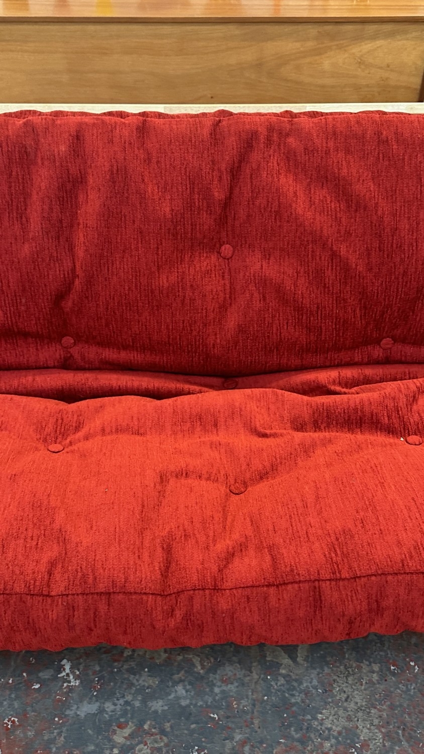 A modern beech sofa bed with Kyoto Futons Ltd. red fabric upholstered cushion - approx. 82cm high x 217cm wide x 92cm deep