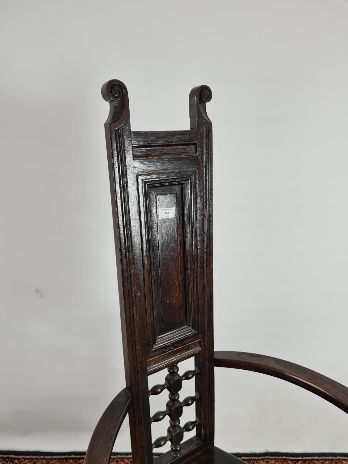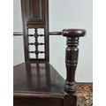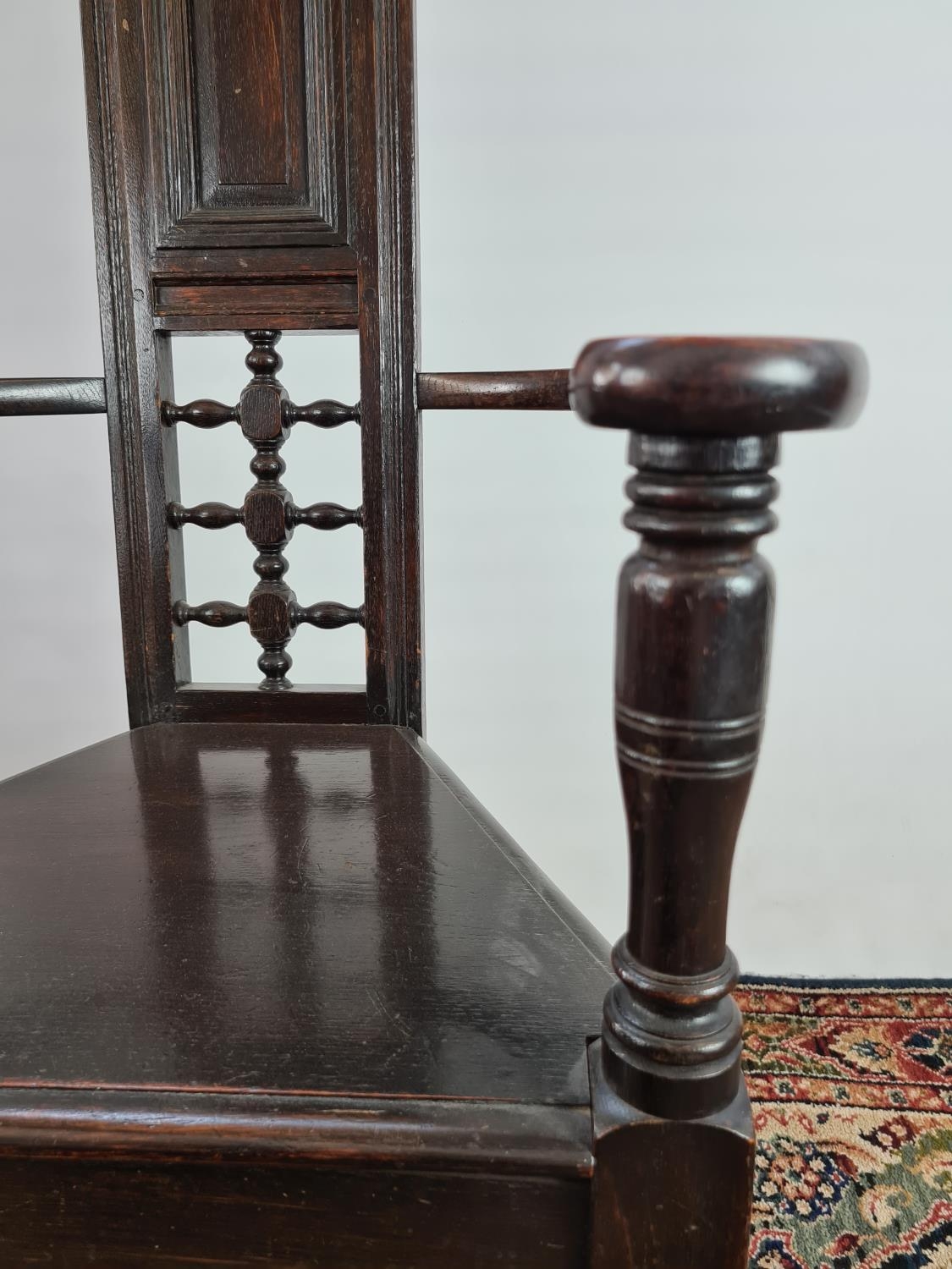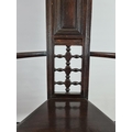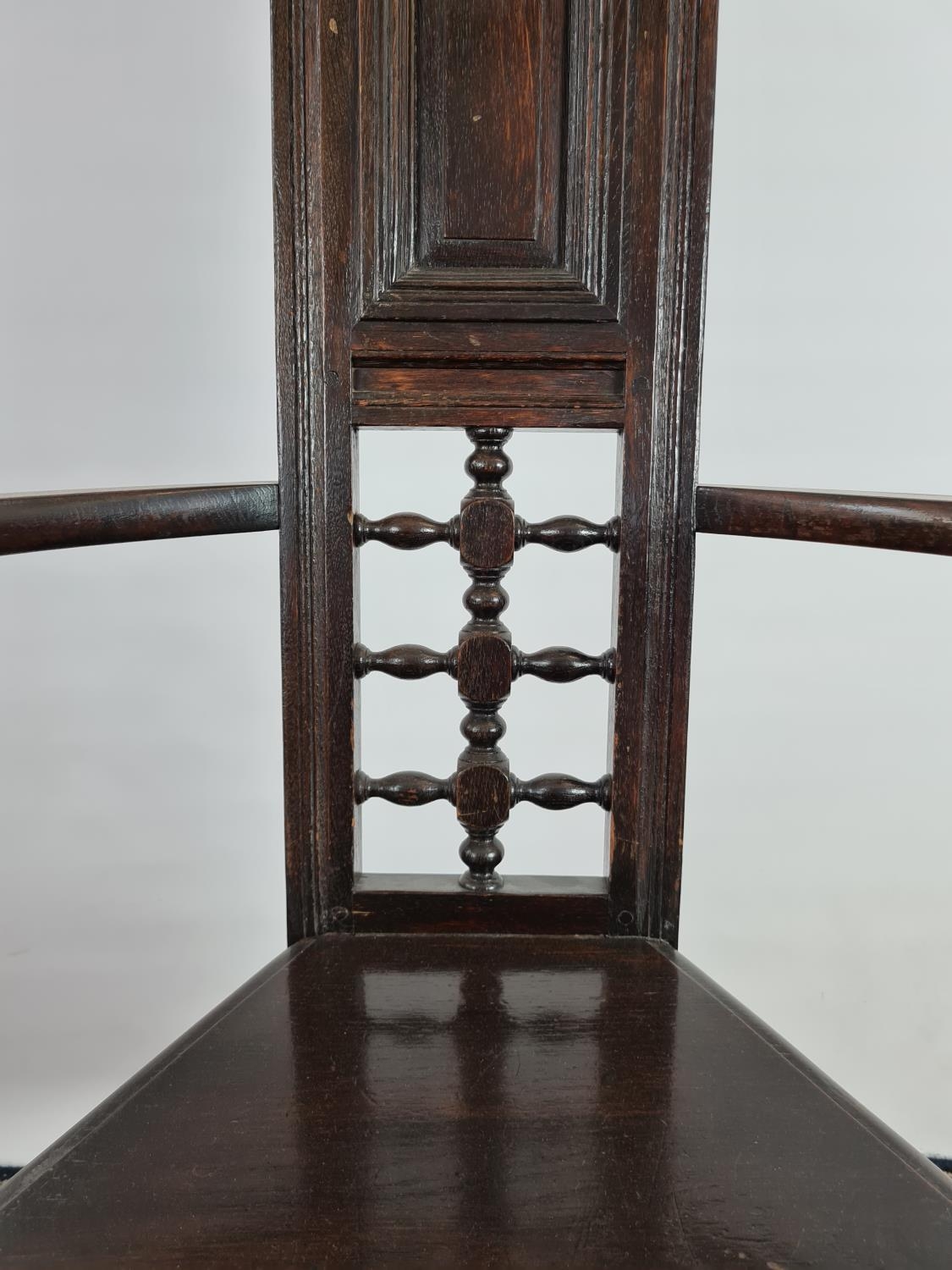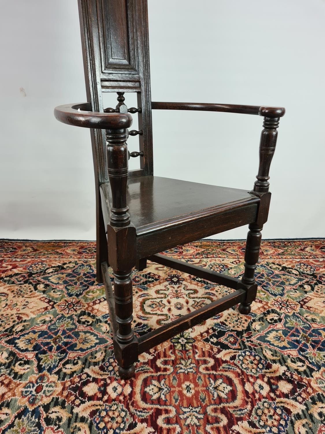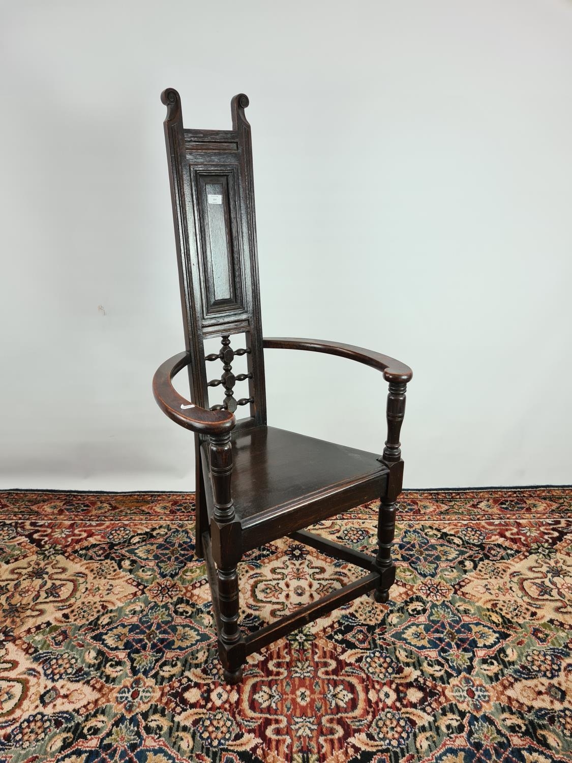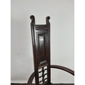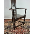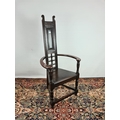 An usual Arts & Crafts oak throne chair with narrow back, triangular seat, bowed arms and lower stretchers