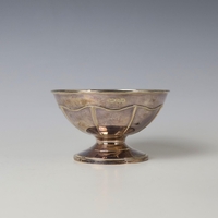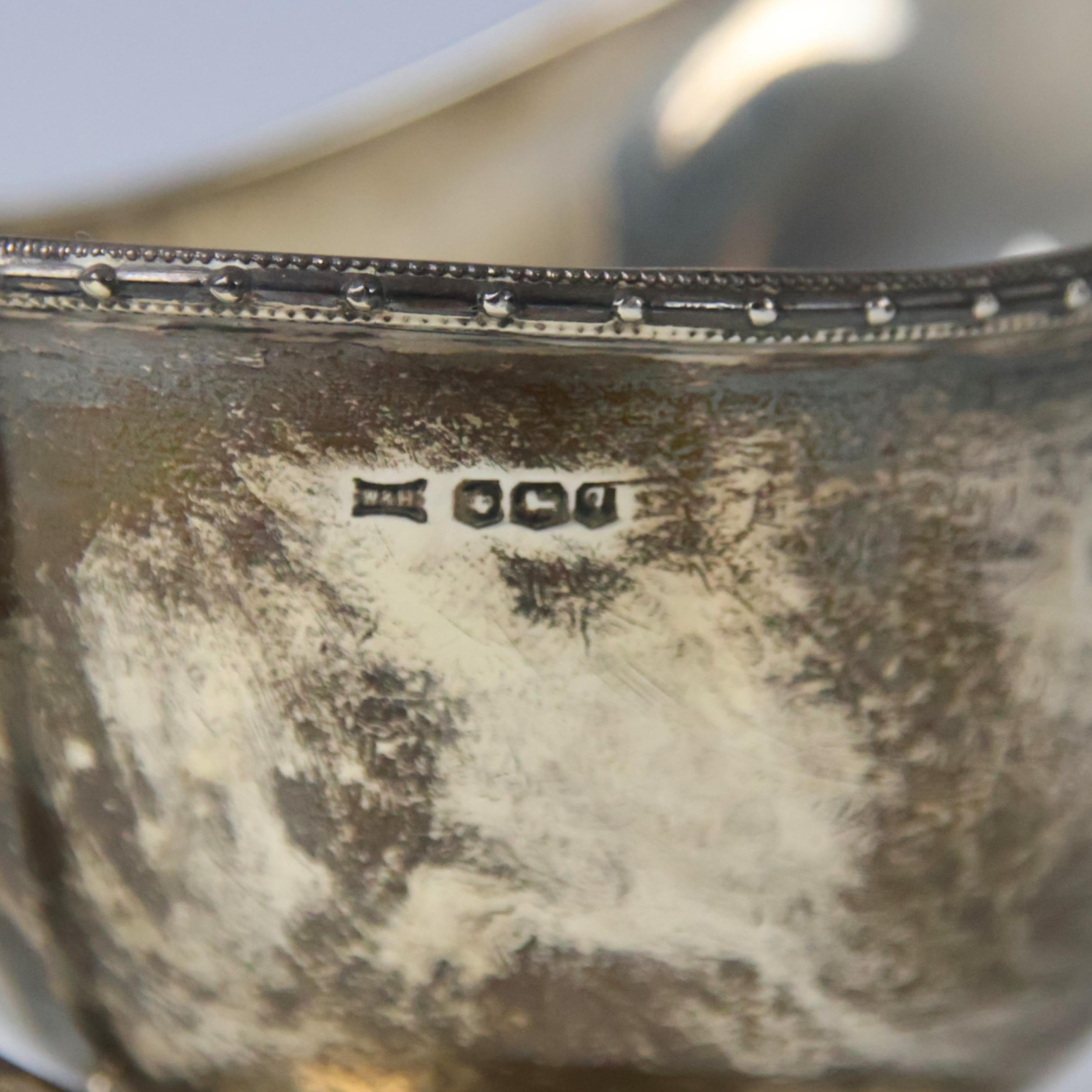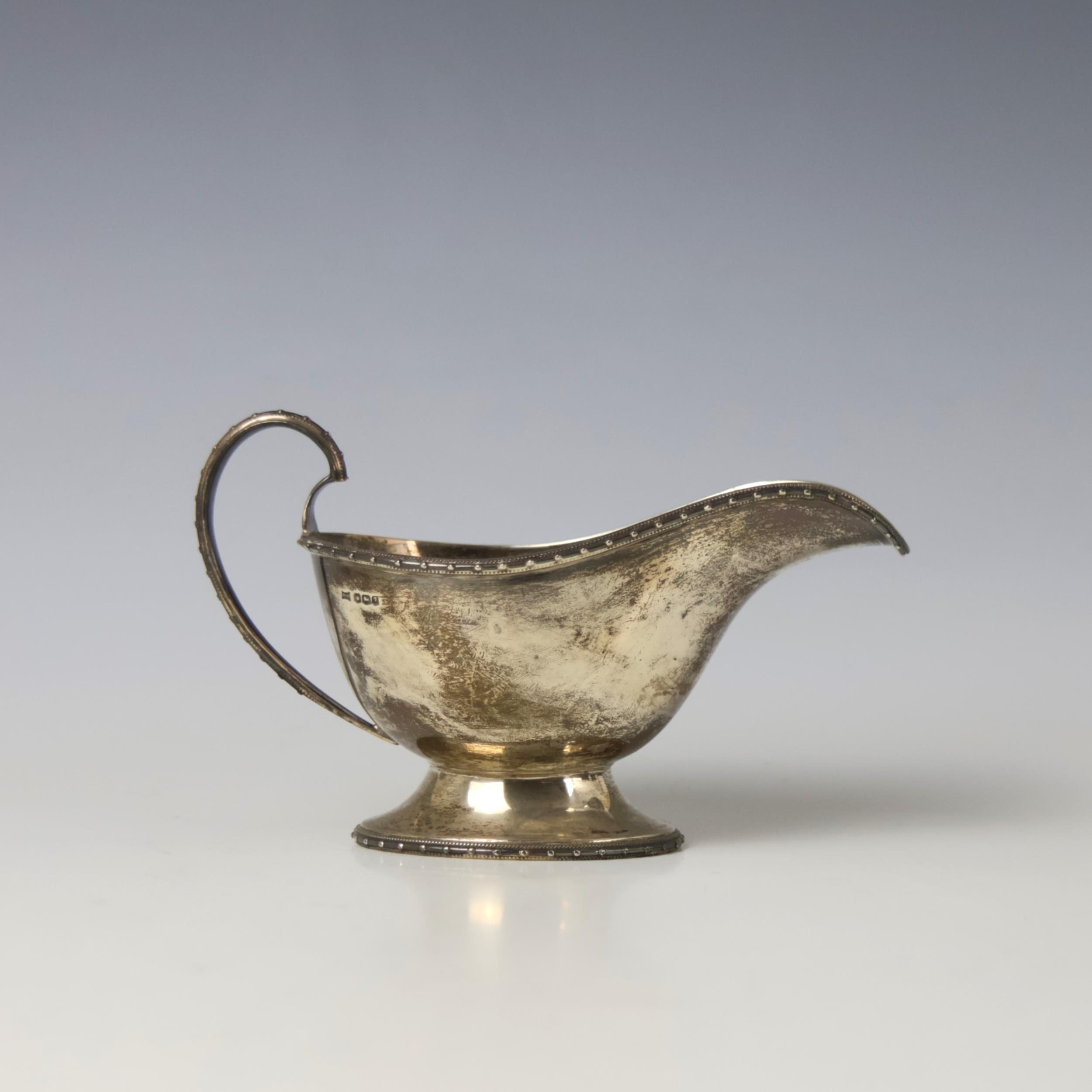 A George V silver sauce boat, Walker & Hall, Sheffield 1933, the stylised beaded rim above plain polished body, upon pedestal base and oval foot, 9.5cm high, 3ozt
