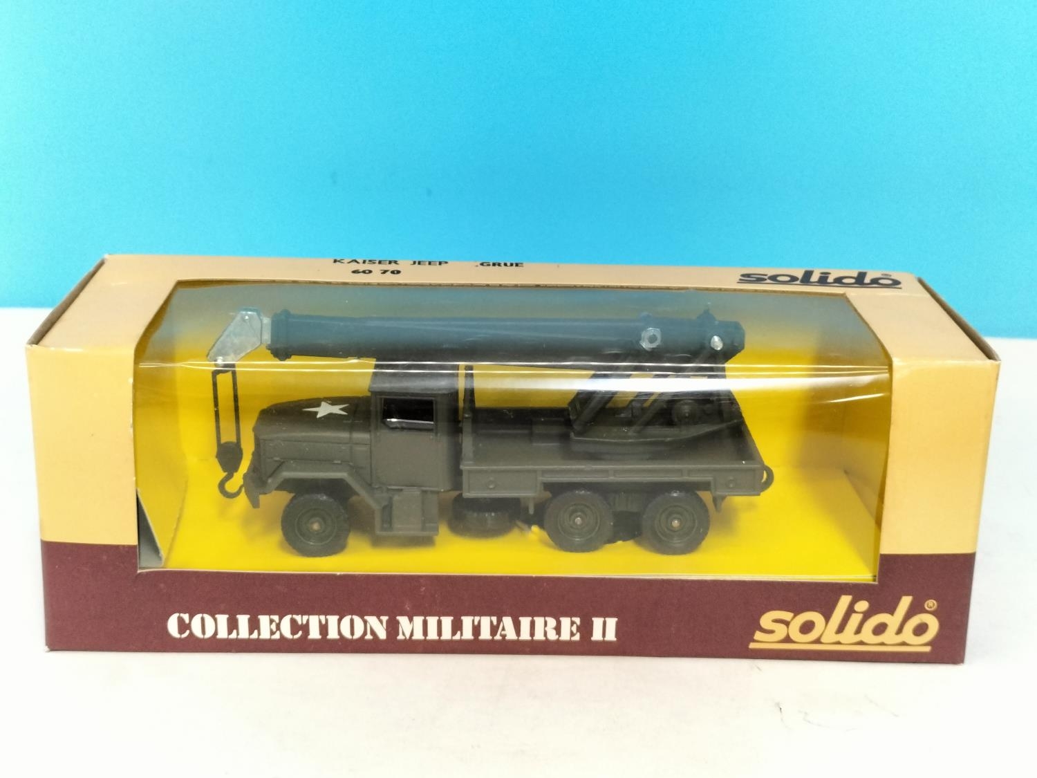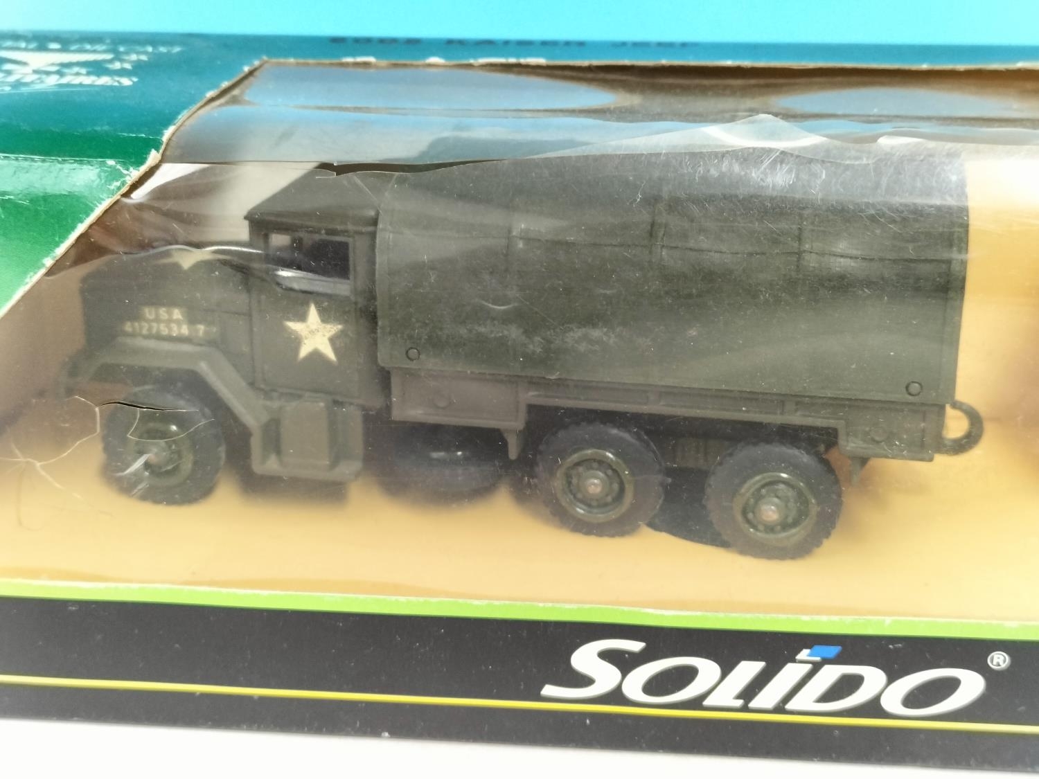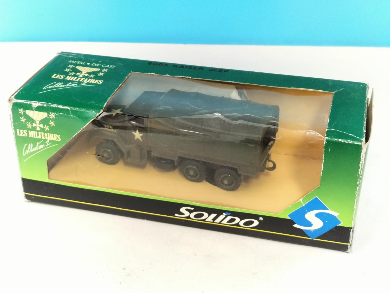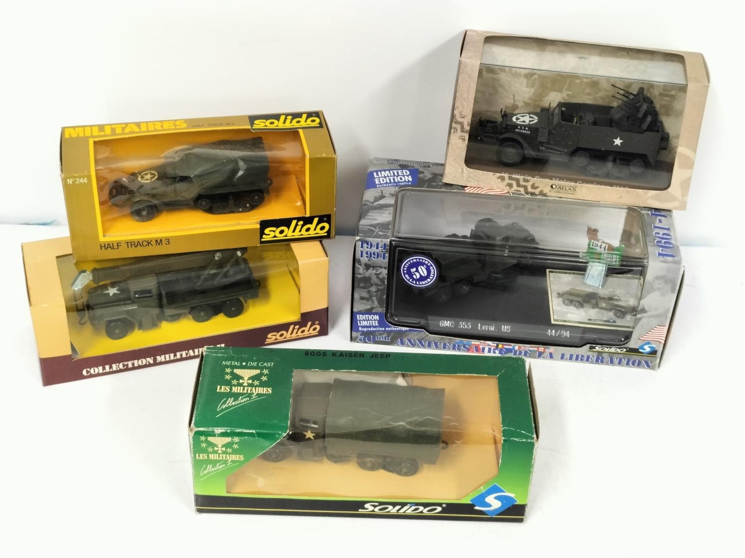 Collection of Boxed Die-Cast Military Vehicles (5) to include Solido Half Truck M3 No 244, Solido 6005 Kaiser Jeep, Solido Kaiser Jeep GRUE, Atlas Collectables Multiple Gun Motor Carriage M16 and a GMC 353 Leroi.