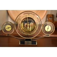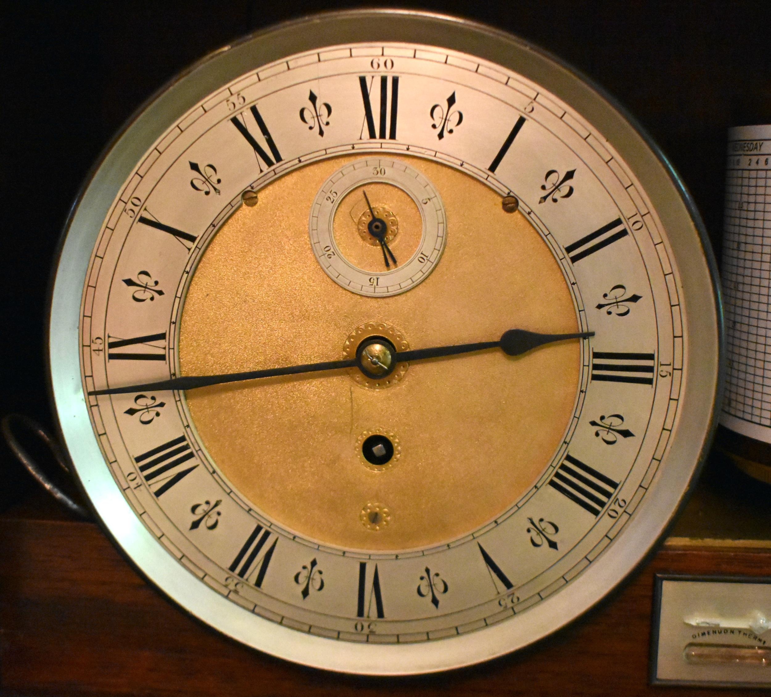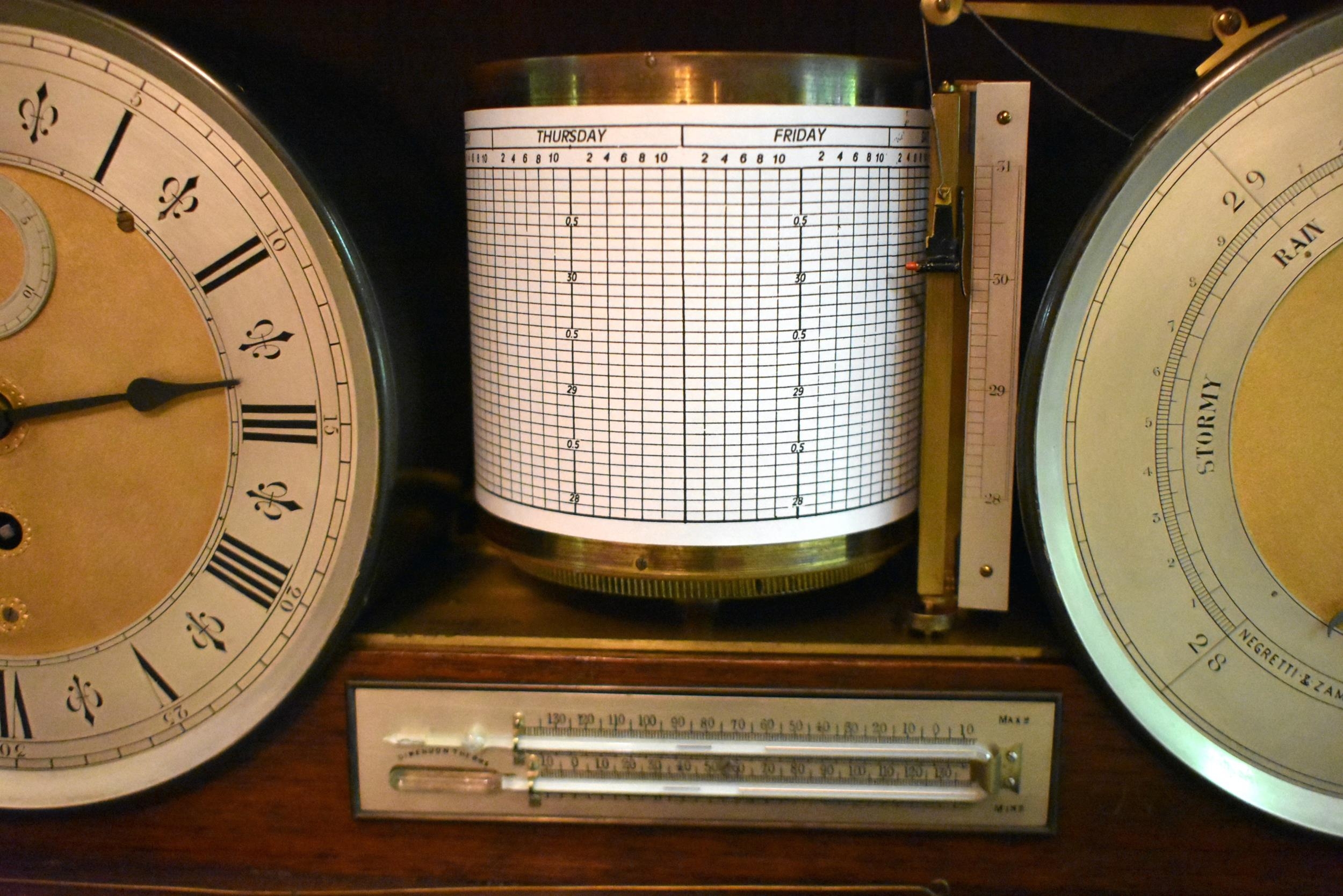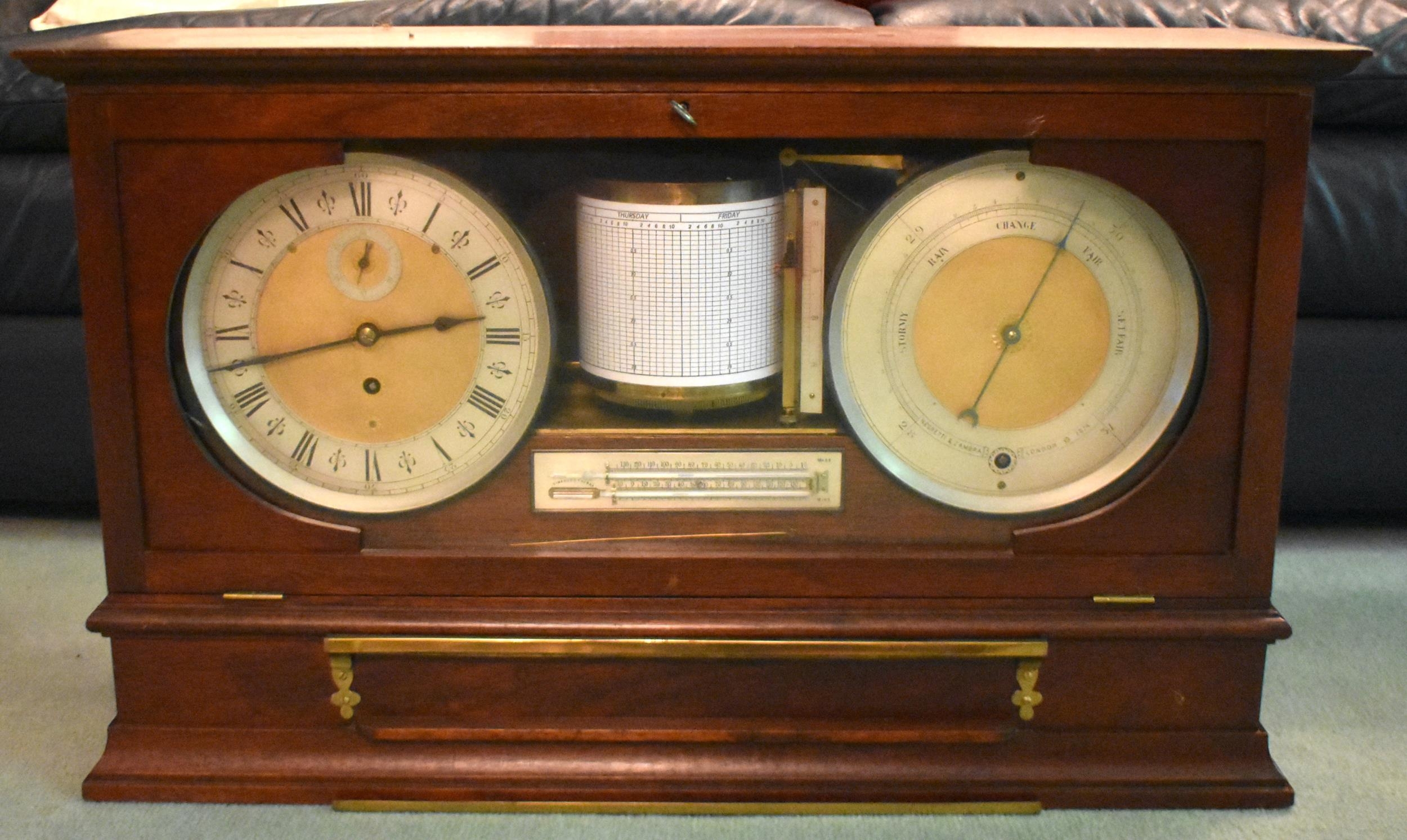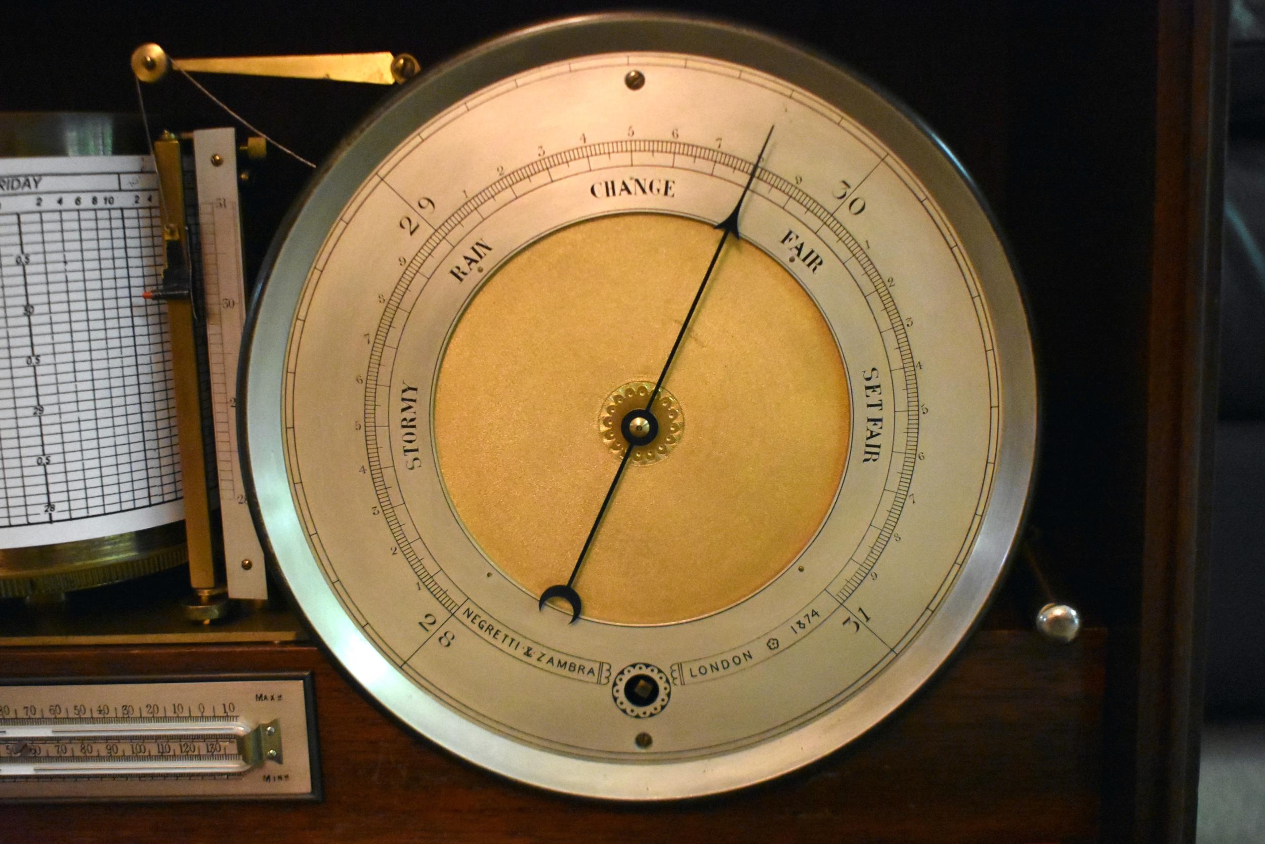 A FINE ANTIQUE NEGRETTI & ZAMBRA WEATHER STATION C1874 with twin silvered dials, central barograph and dual thermometer. 65 cm x 40 cm x 20 cm.