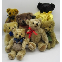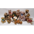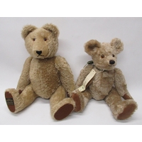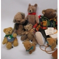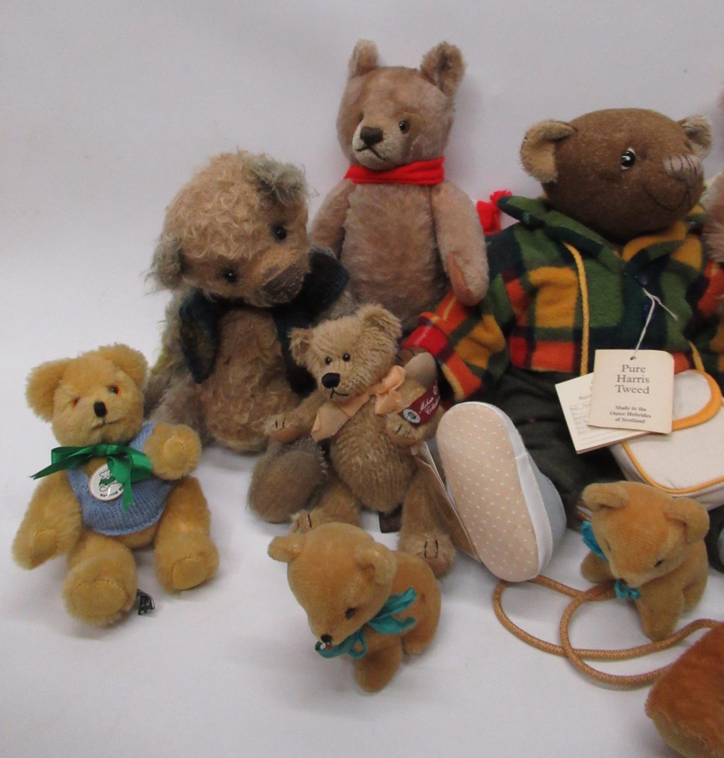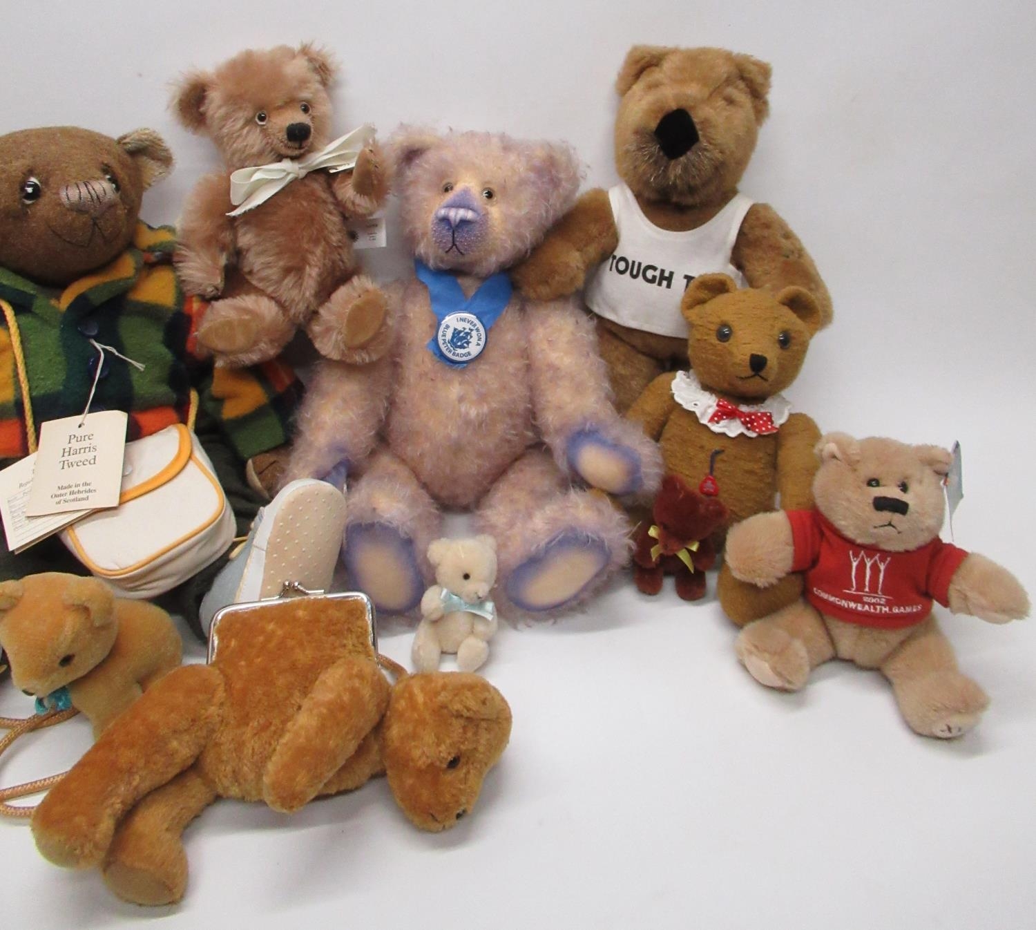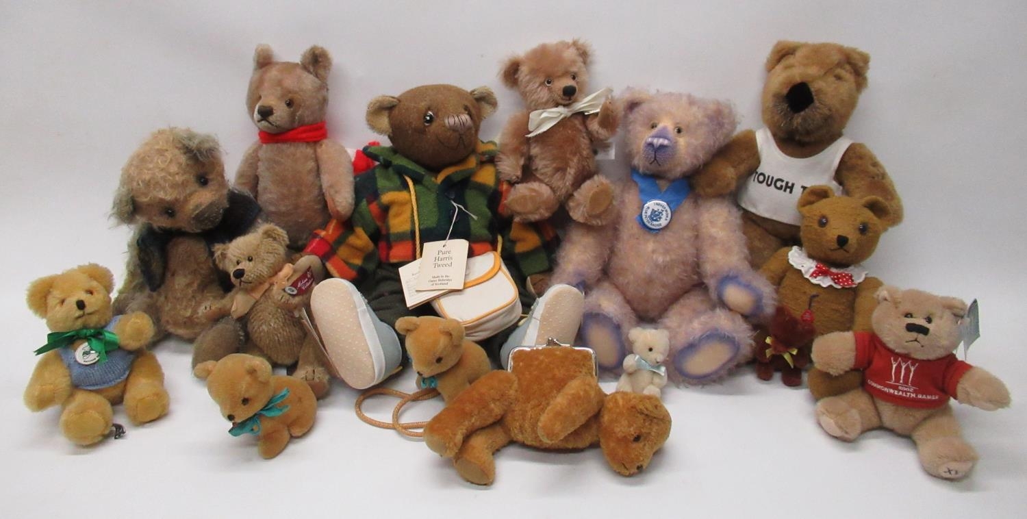 Large collection of teddy bears varying in age, size and make, including "Oscar" by Harris Tweed, H43, a blue and white Jac-Q-Lyn blue peter inspired bear, H38cm, a teddy bear purse by The Teddy Bear Museum, H25, "Jasper" a National Trust bear, H25cm etc. (15)