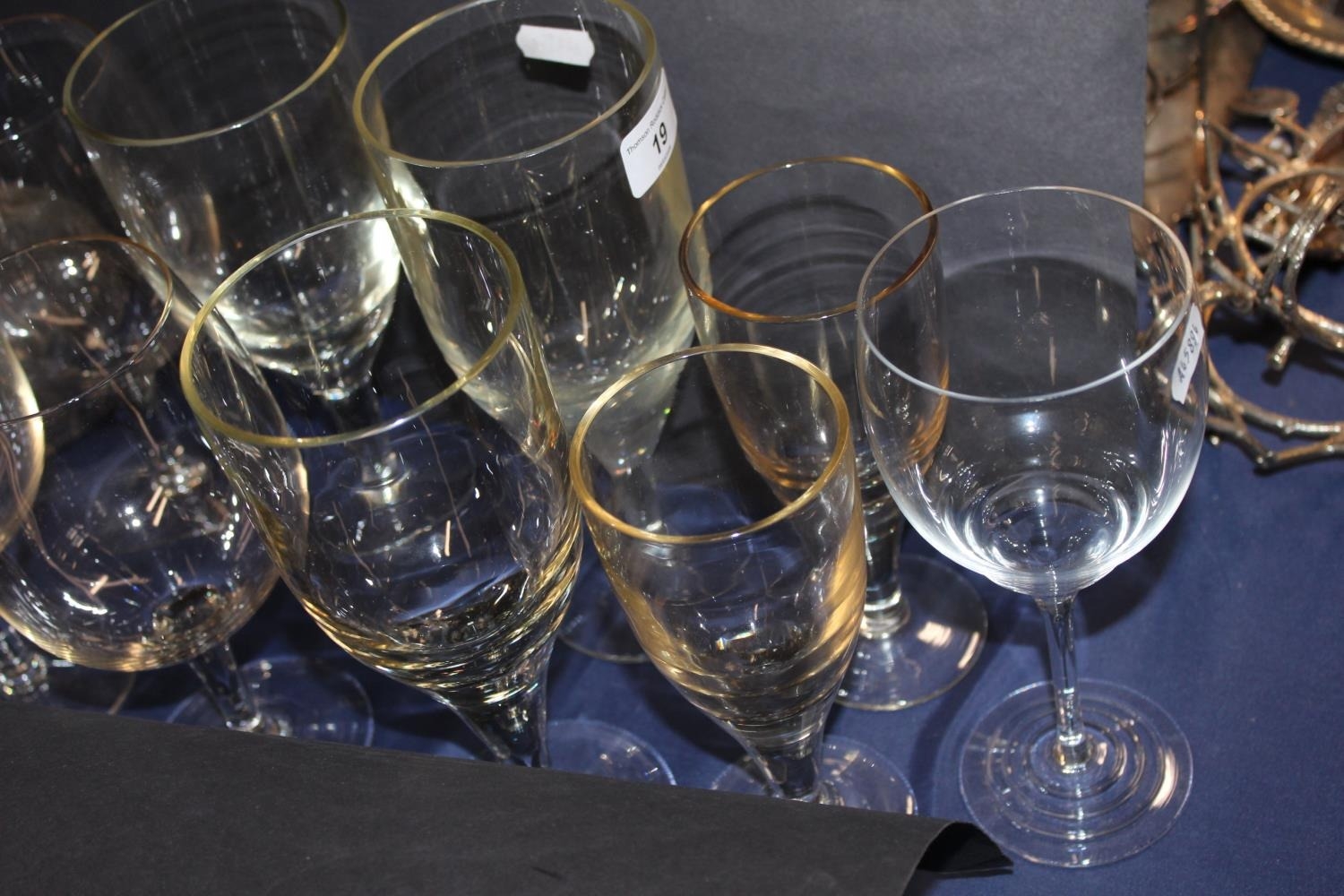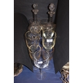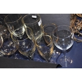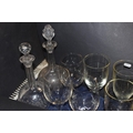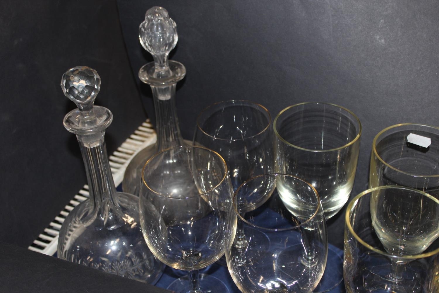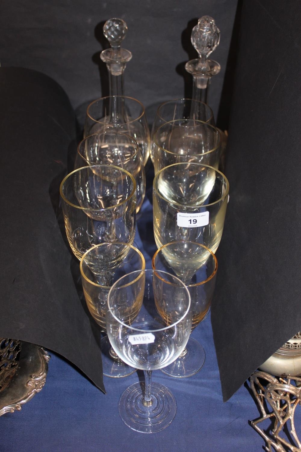 Glass goblets and two glass decanters with stoppers.