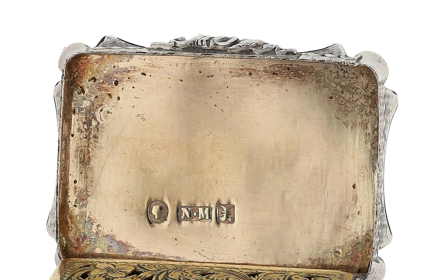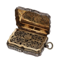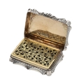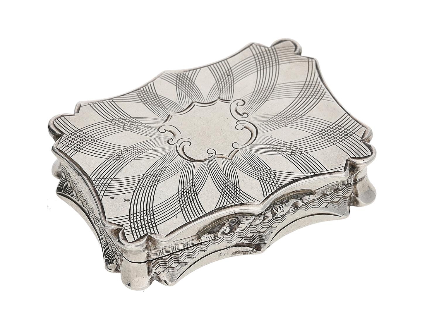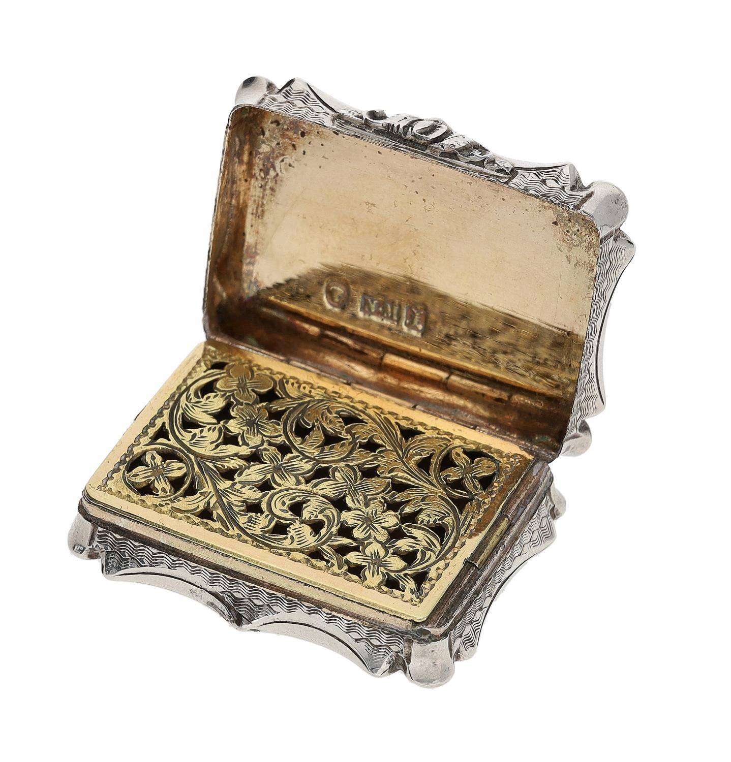 Victorian silver vinaigrette, of shaped rectangular outline with engraved decoration around a central cartouche, gilt interior, Nathaniel Mills, Birmingham 1846, 1.5", 19gm