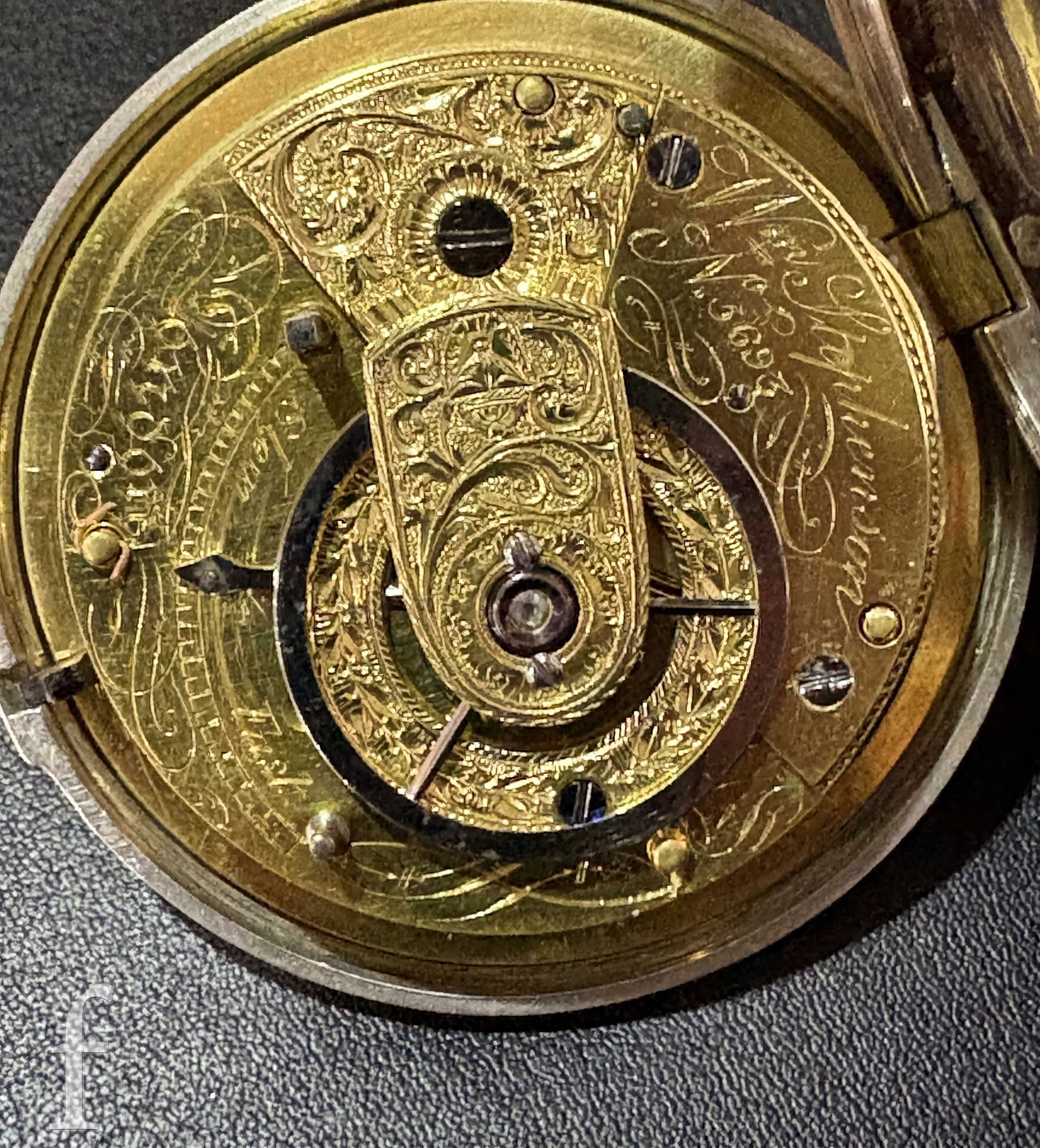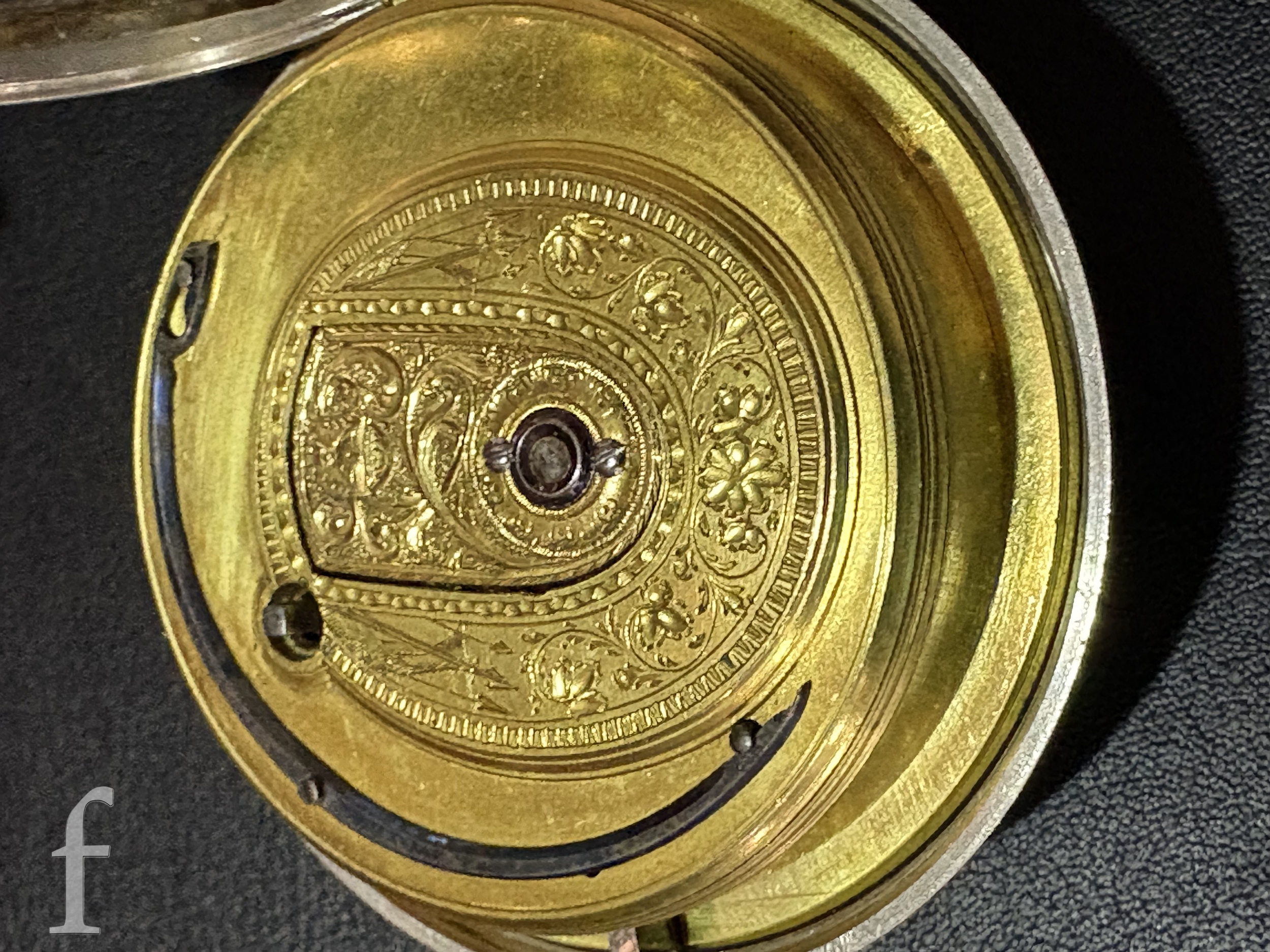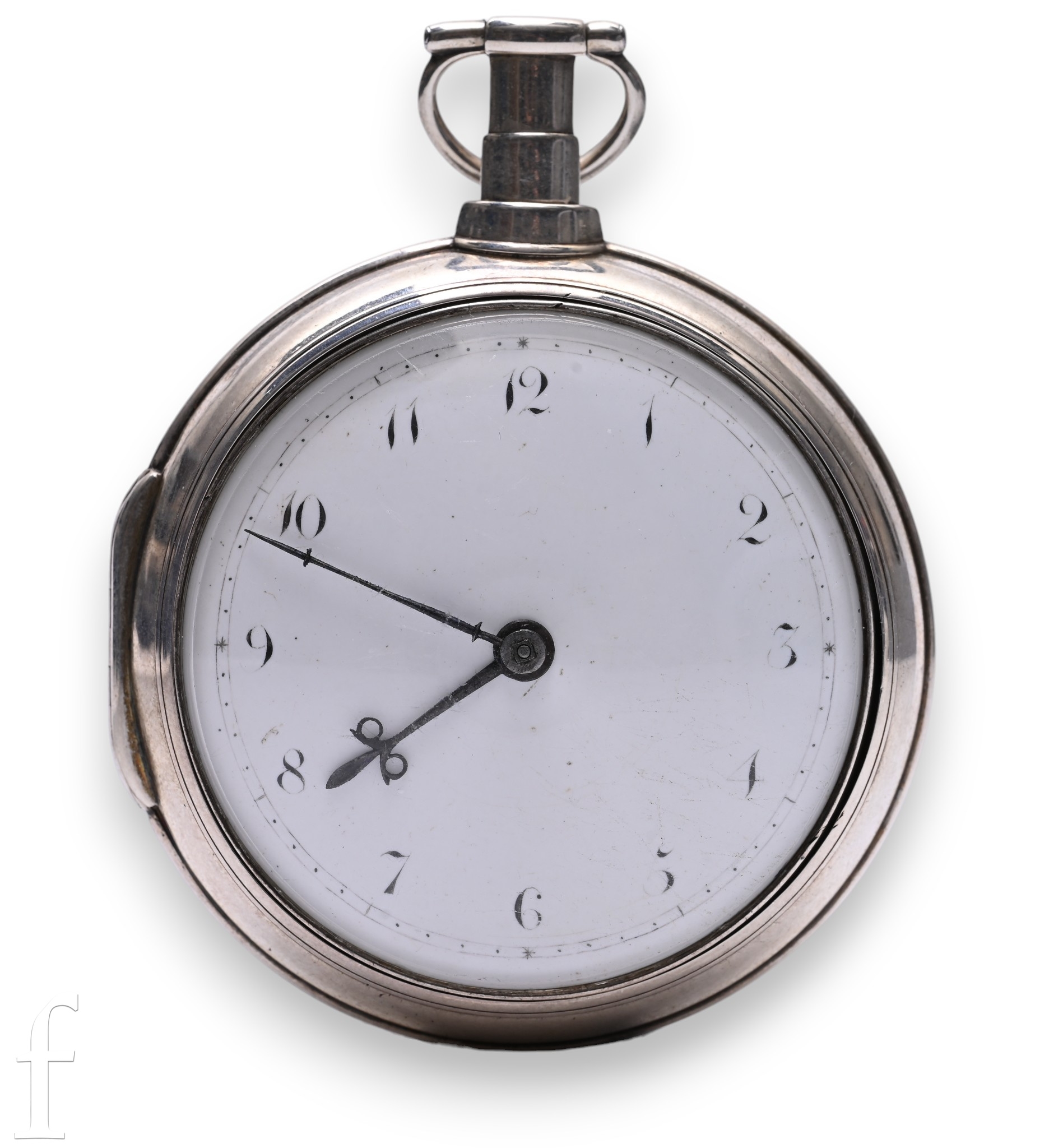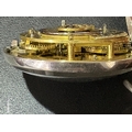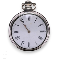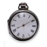 A George III William Stephenson, London silver pair case pocket watch with fusee verge movement, white enamel dial with Arabic numeral markers, minute track border, ornate design movement and cover with diamond set end stone and makers marks, numbered 5693, case hallmarked London 1806, watch case diameter 49mm, pair case diameter 58mm, total weight 145g.