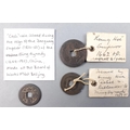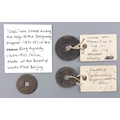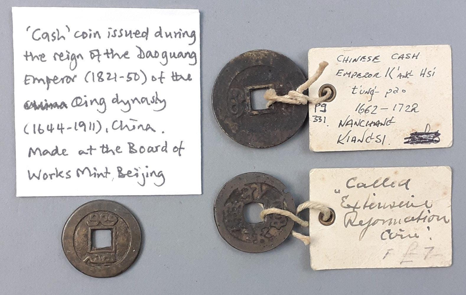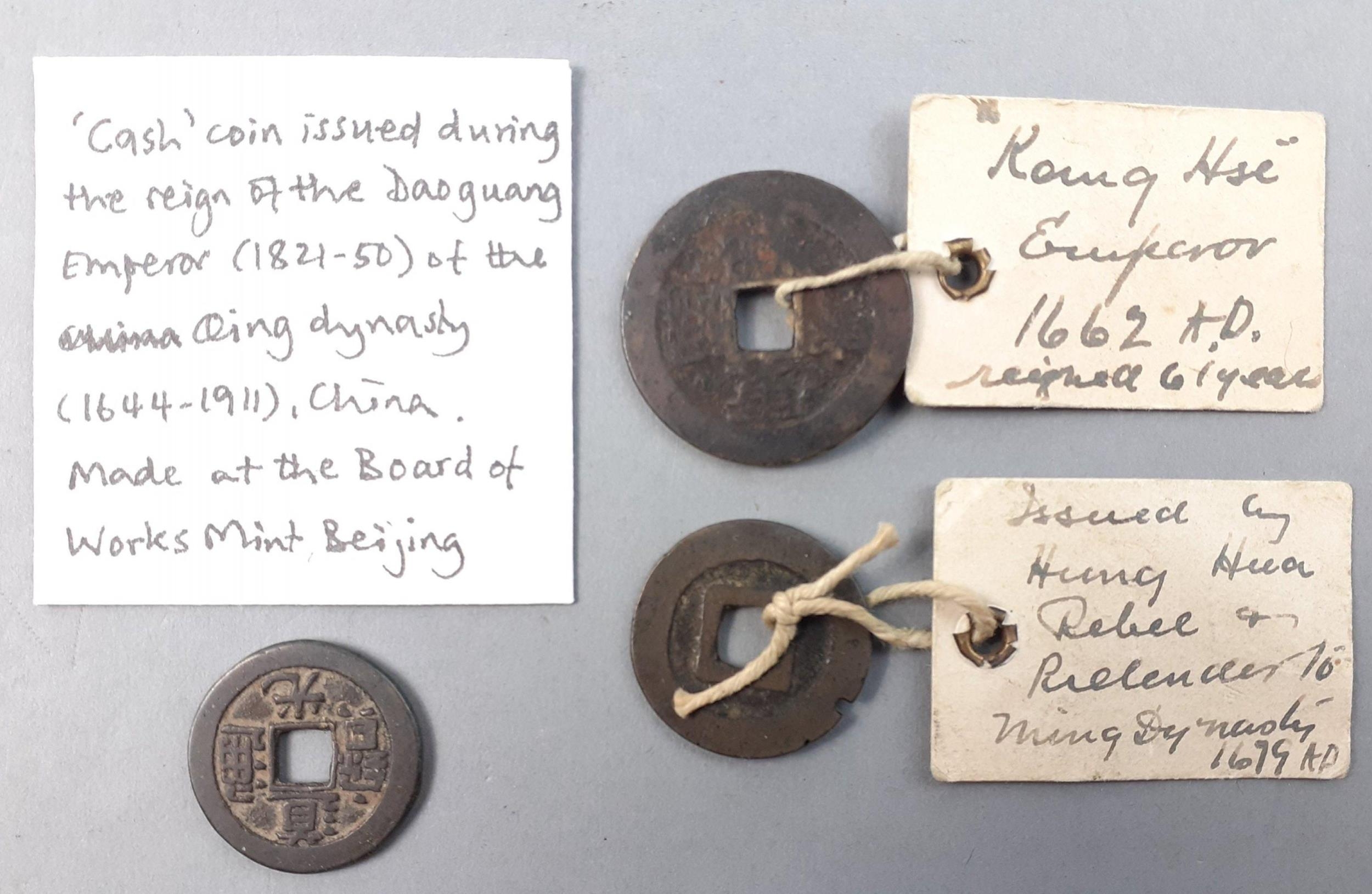 CHINA. Three ancient Chinese coins. Two with older collated collection labels indicating from 1600s, the third from 1800s. Interesting lot for the Chinese numismatic community.
