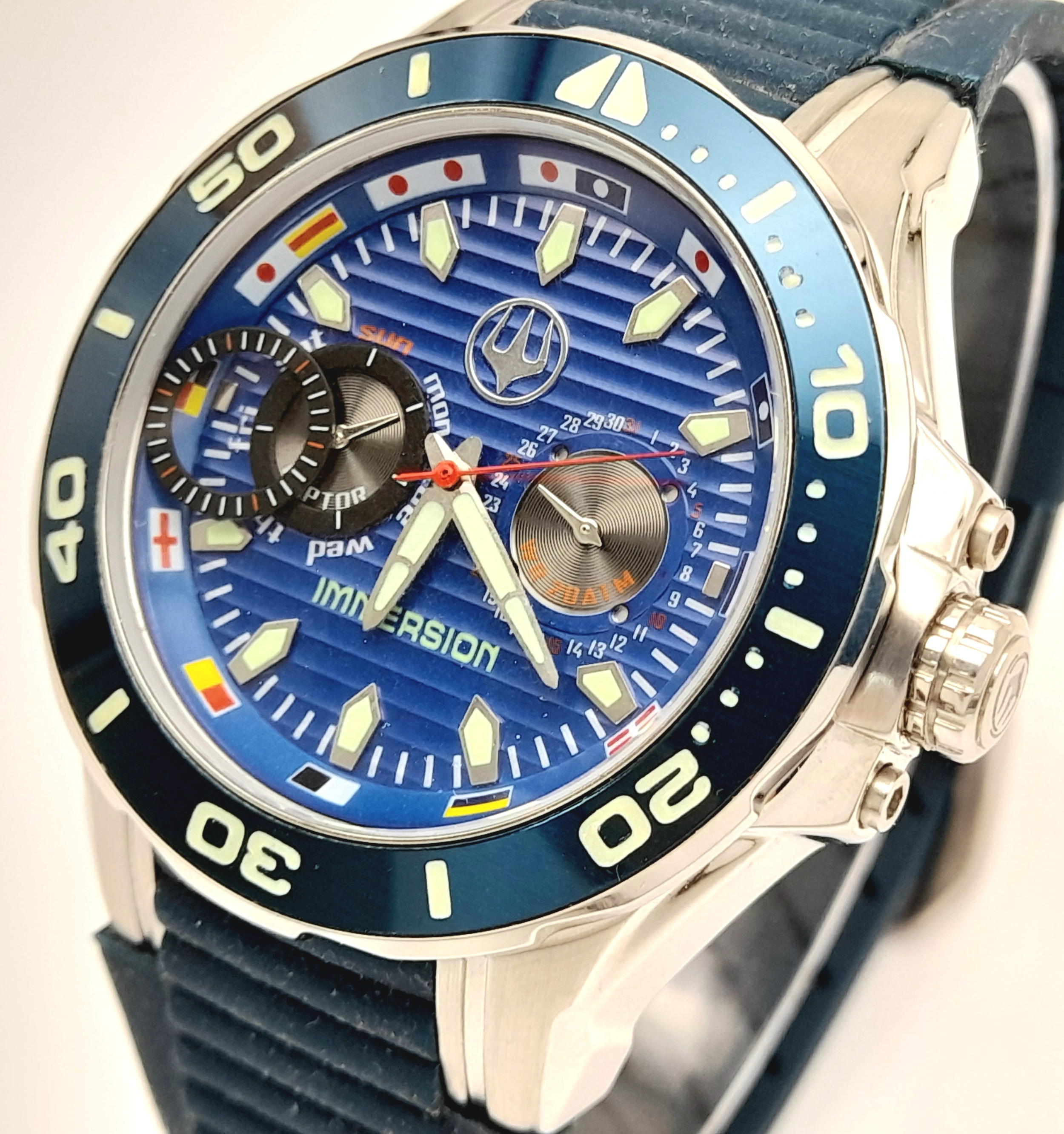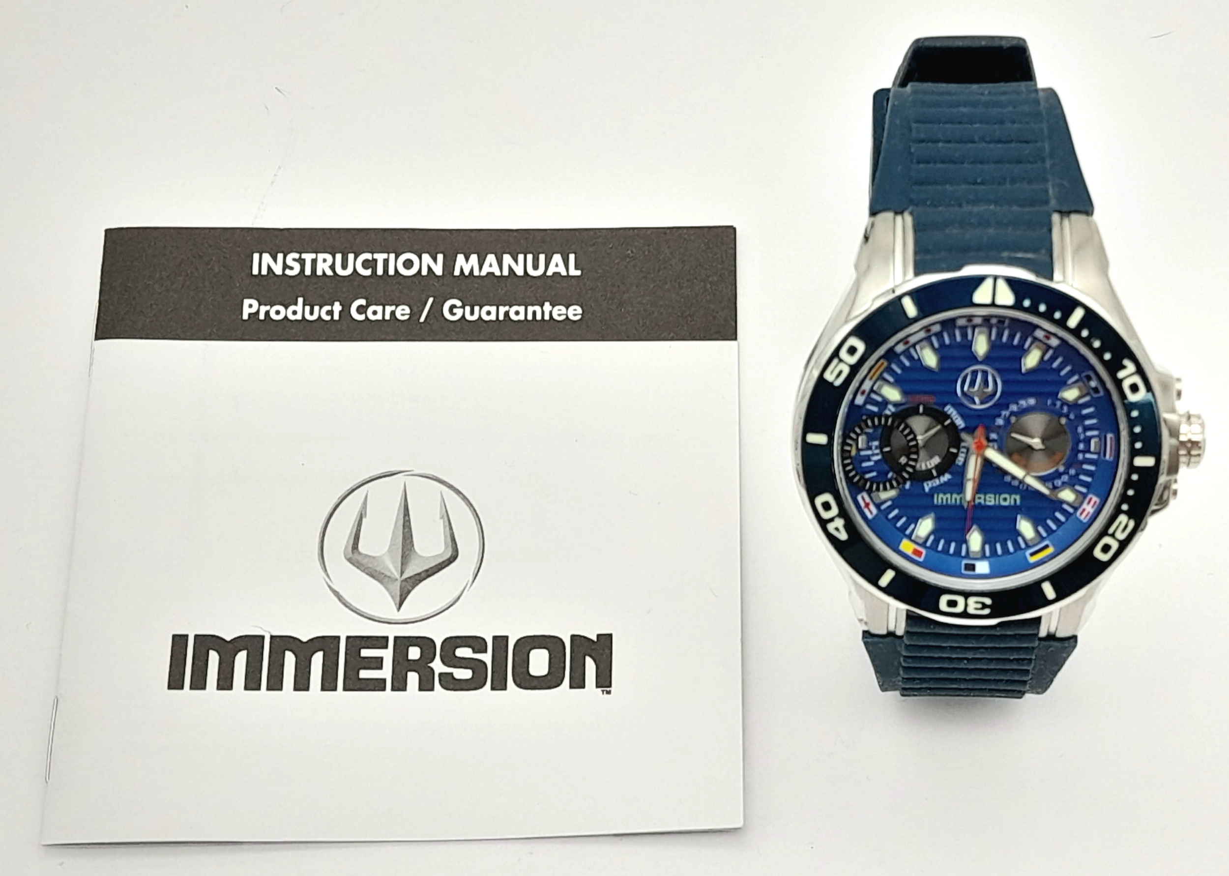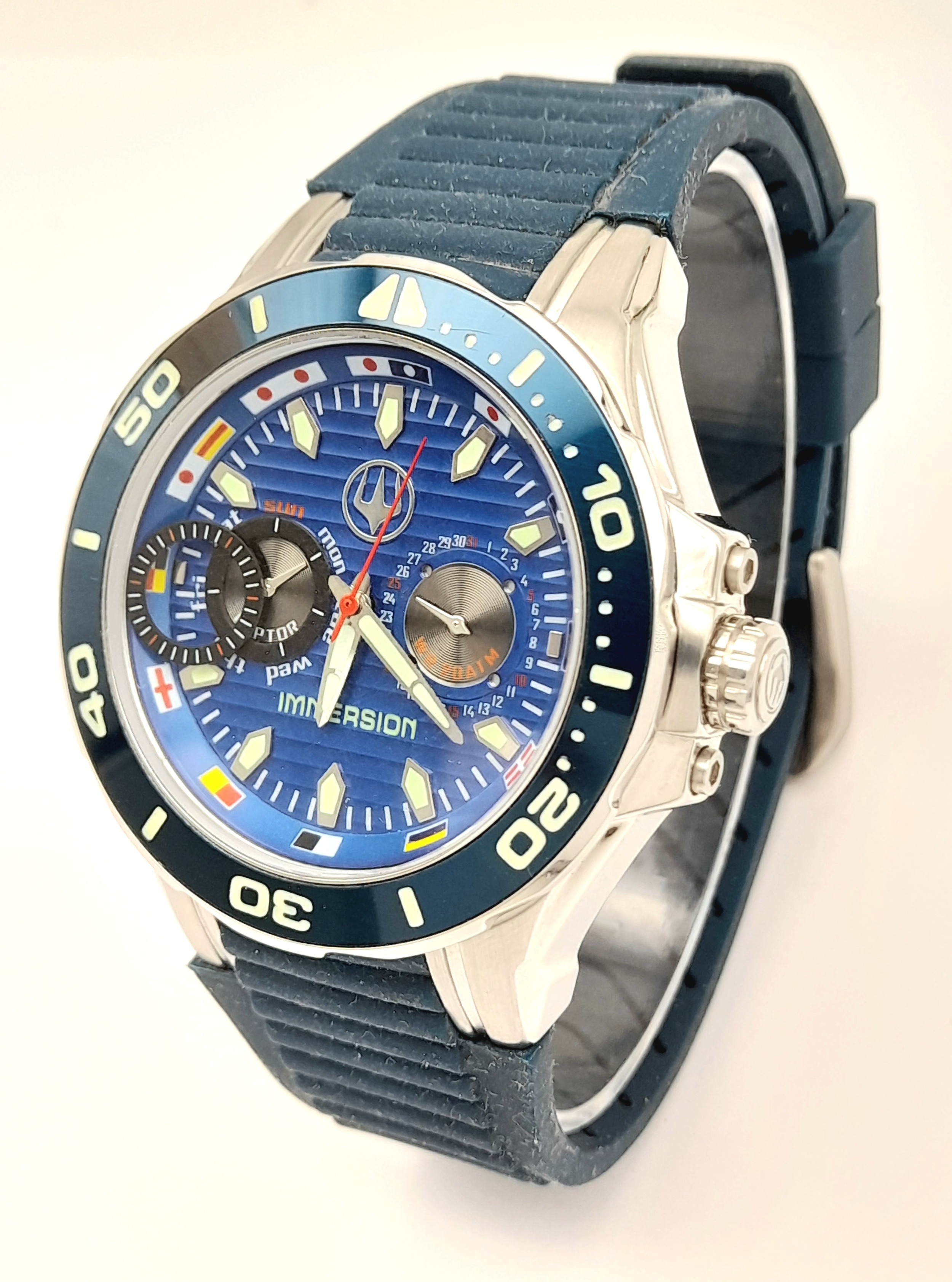 IMMERSION DIVERS CHRONOGRAPH 316L WATCH. Multi Dial Blue Face Model with rotating bezel. Quartz Movement. Divers Strap. Complete with manual. Full working order.