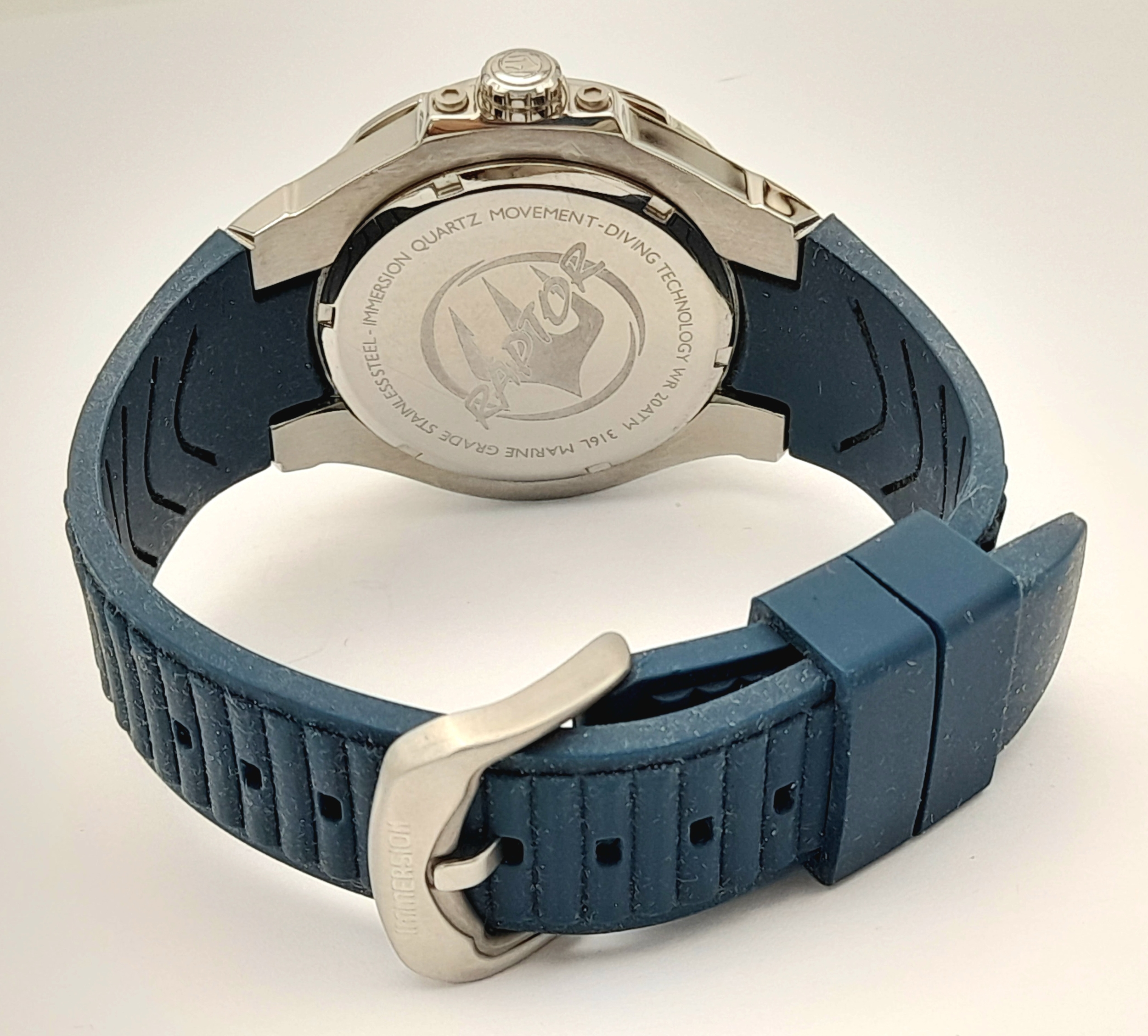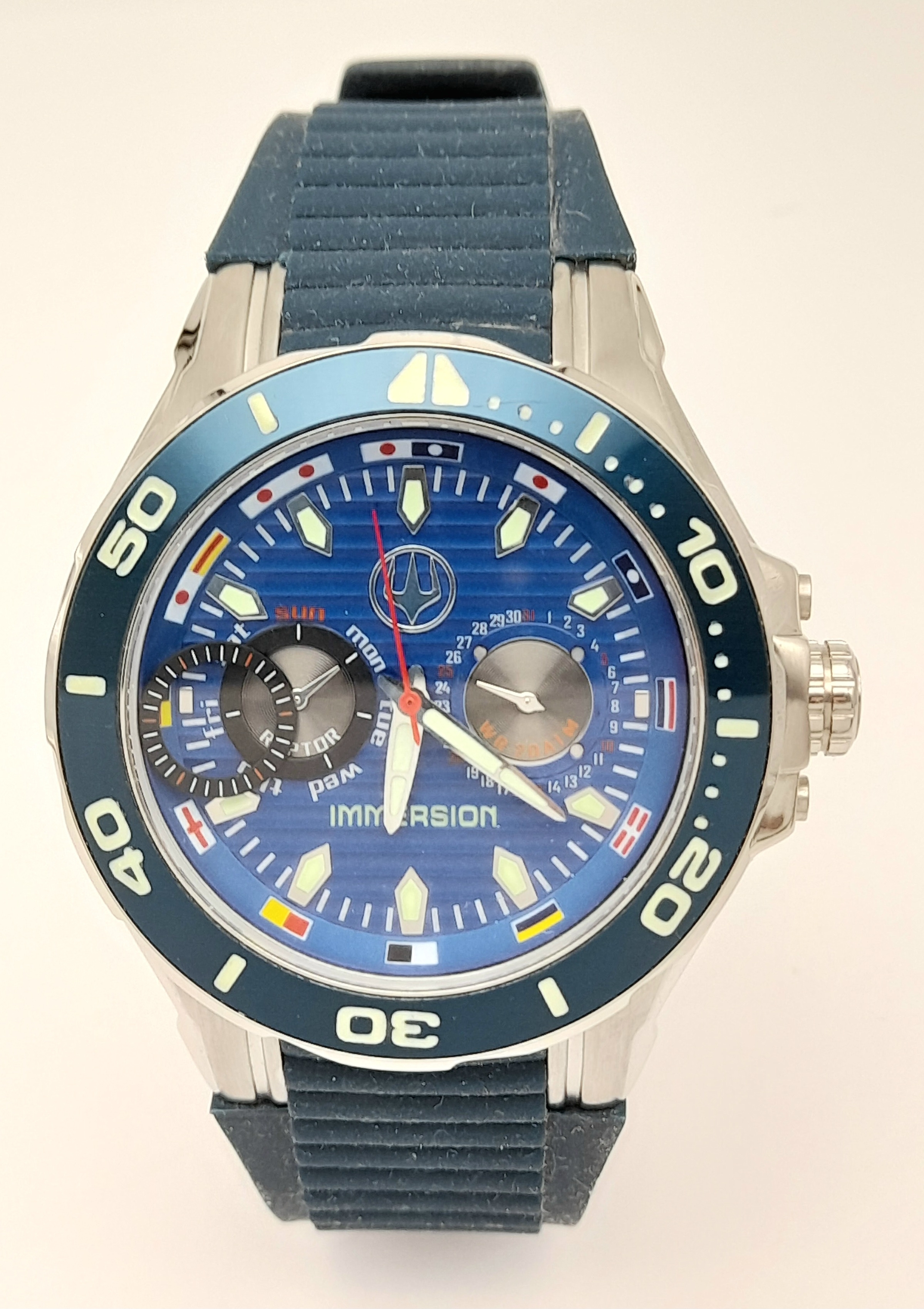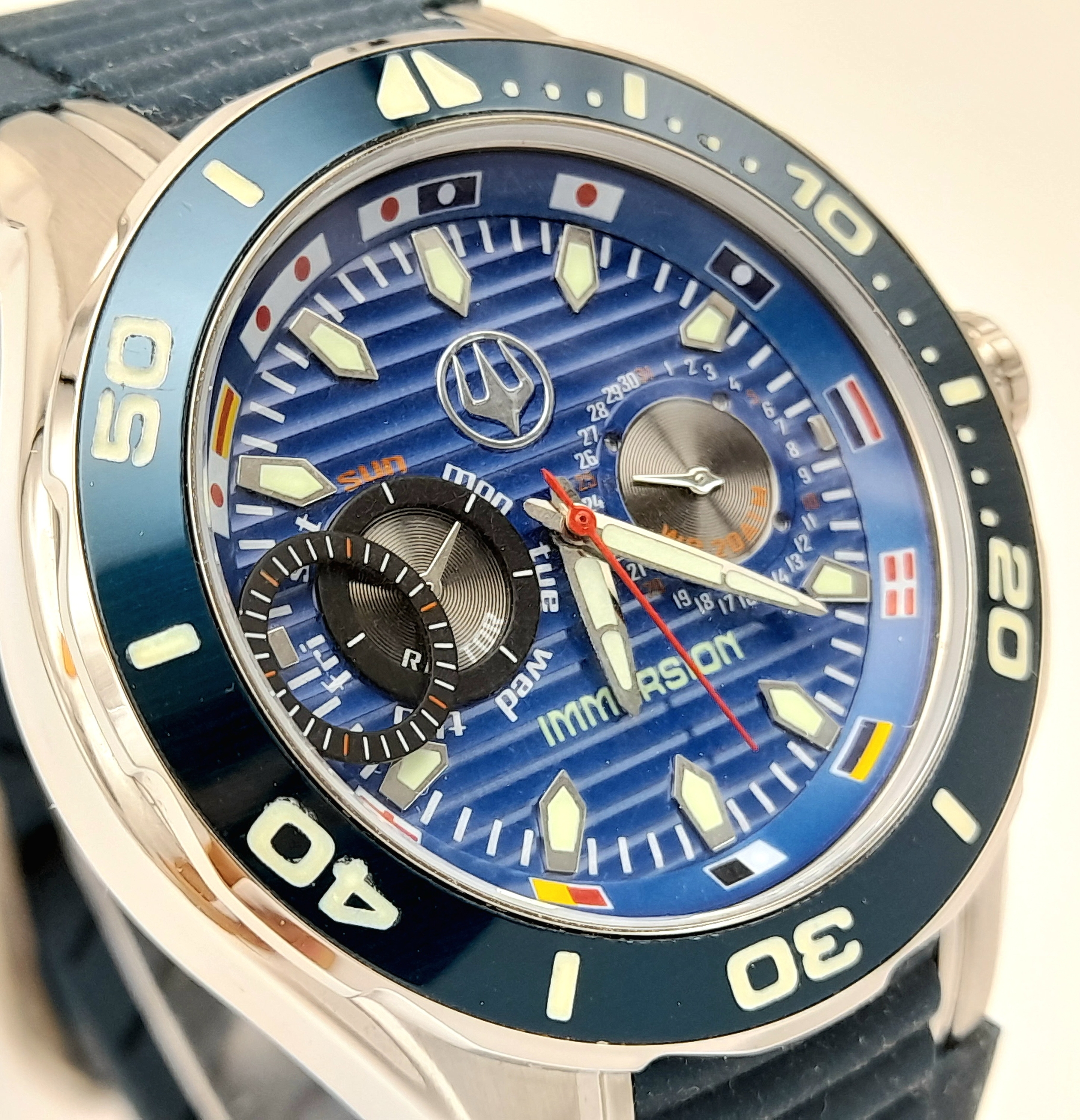 IMMERSION DIVERS CHRONOGRAPH 316L WATCH. Multi Dial Blue Face Model with rotating bezel. Quartz Movement. Divers Strap. Complete with manual. Full working order.