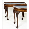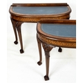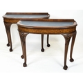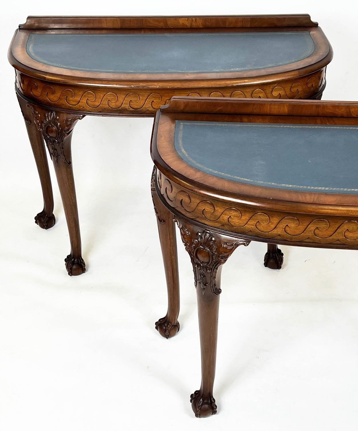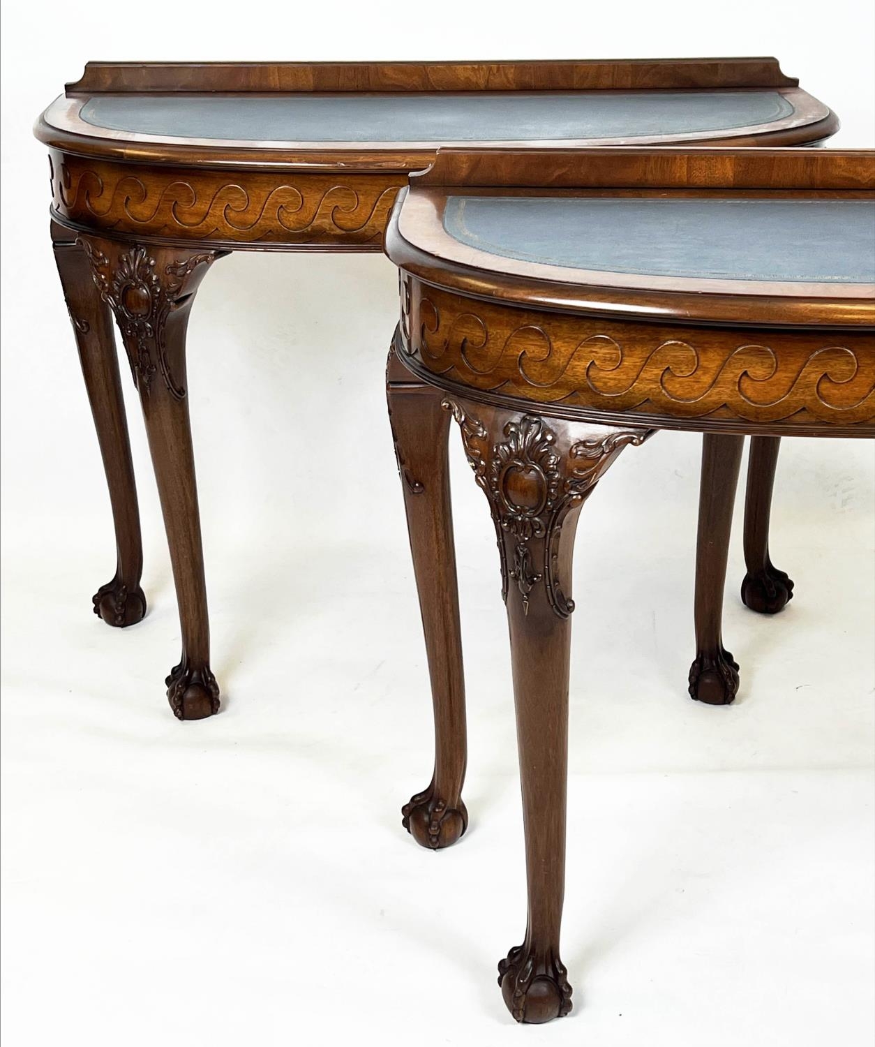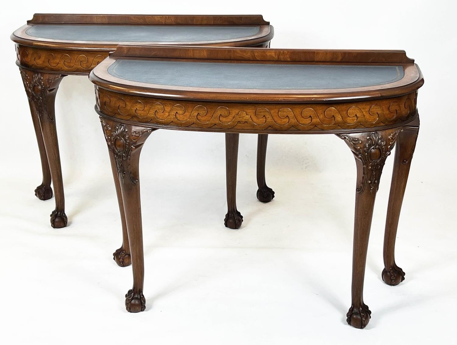 DEMI LUNE SIDE TABLES, 80cm H x 103cm x 43cm, George II style mahogany with blue leather tops. (2)