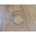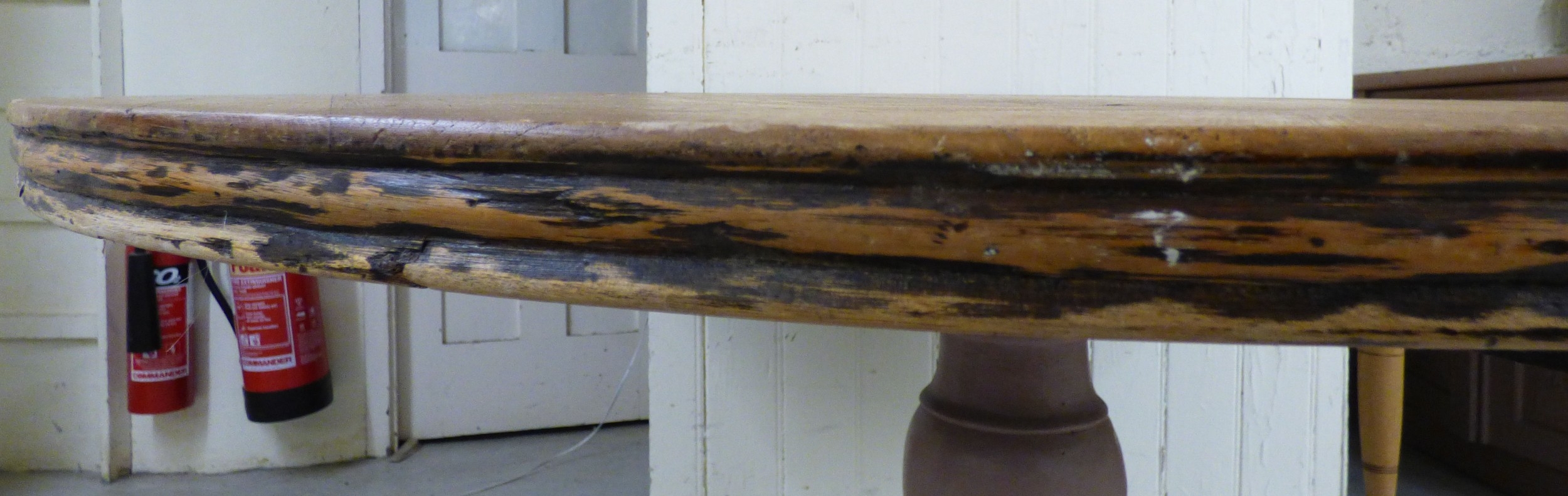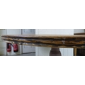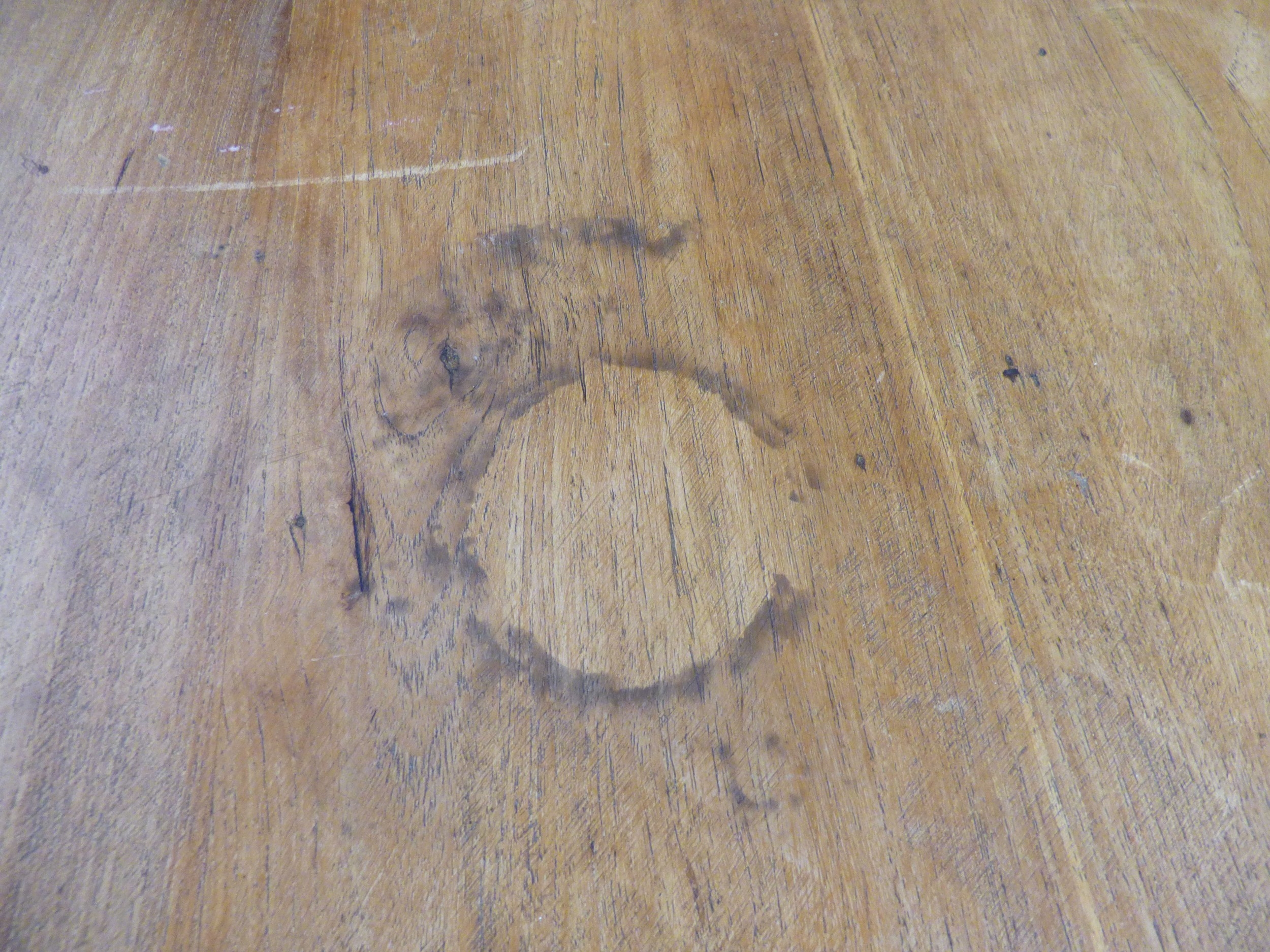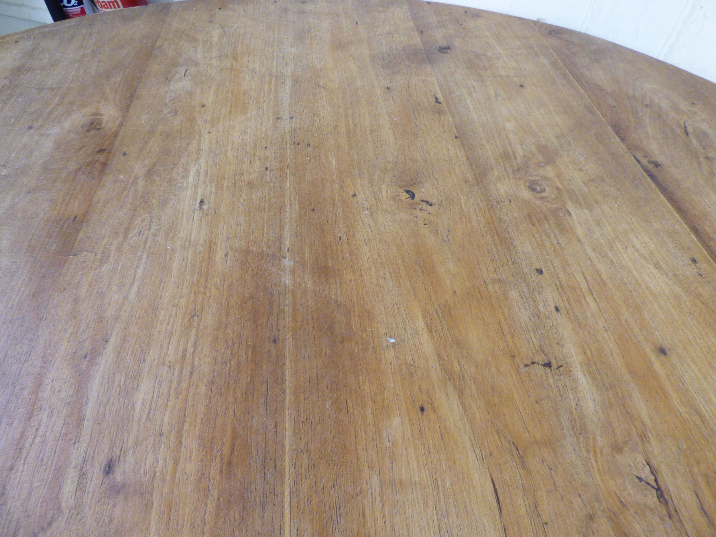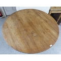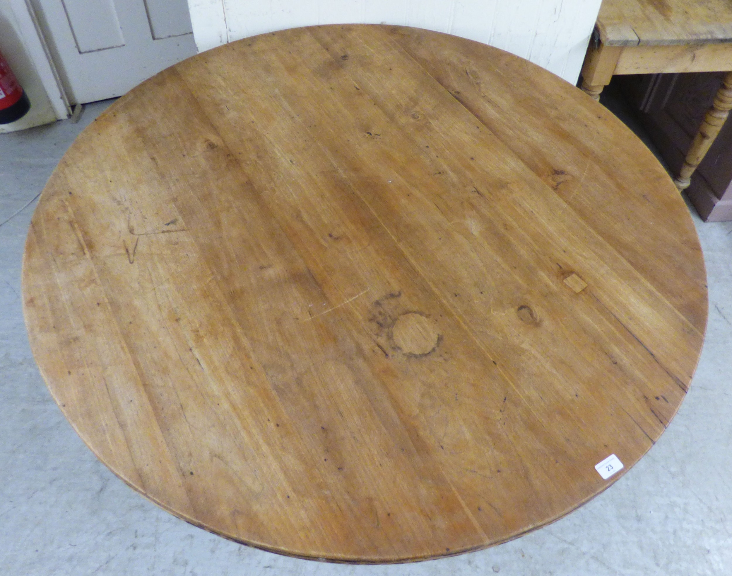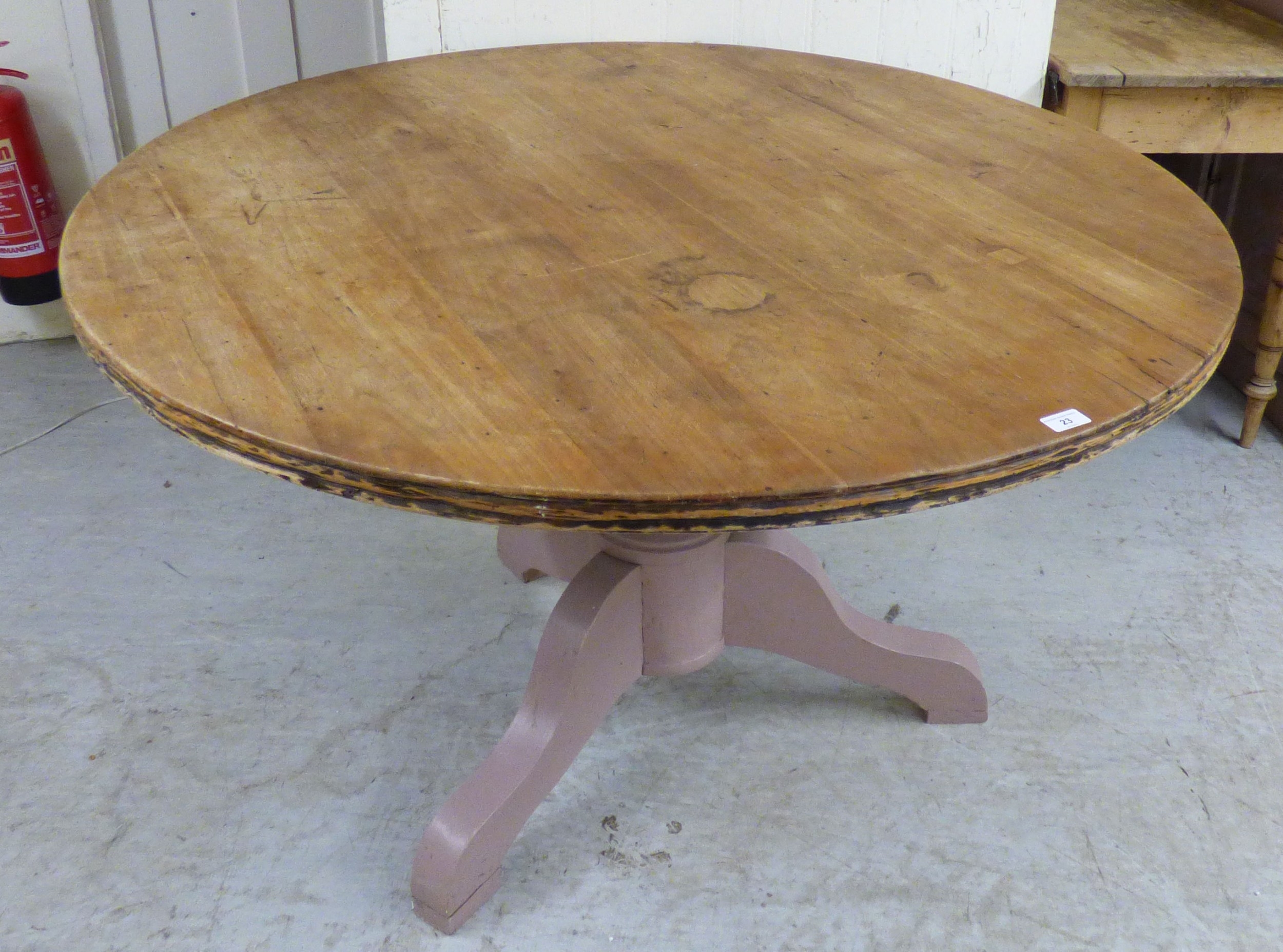 A late 19th/early 20thC bleached mahogany centre table, the top raised on a grey painted pedestal and tripod base 29"h 49"dia