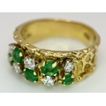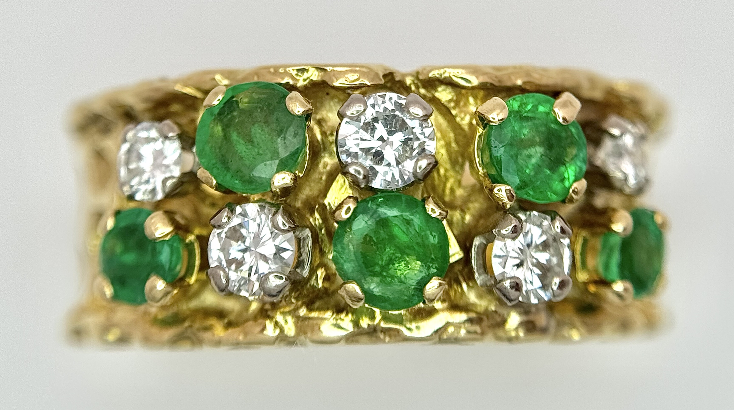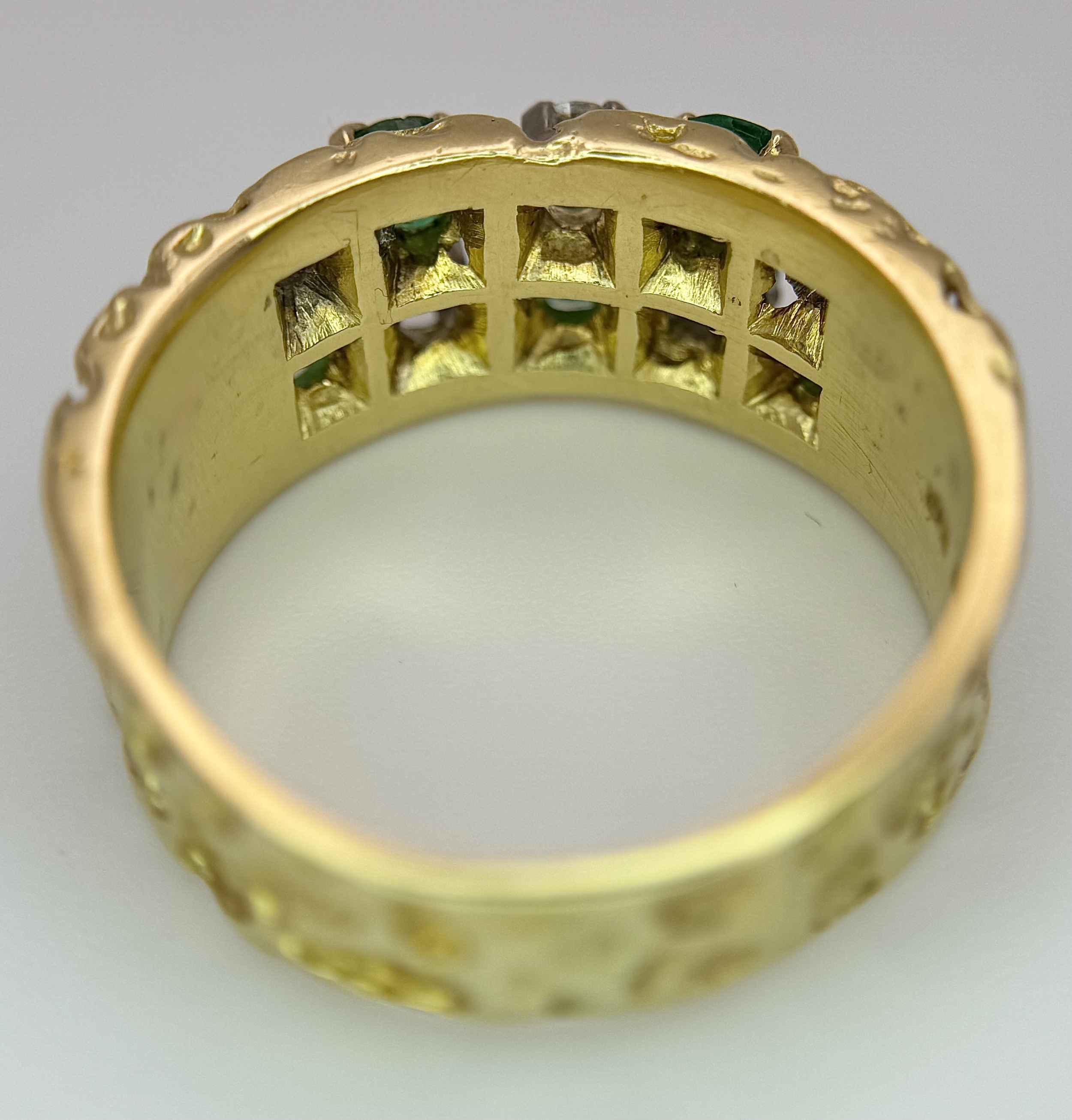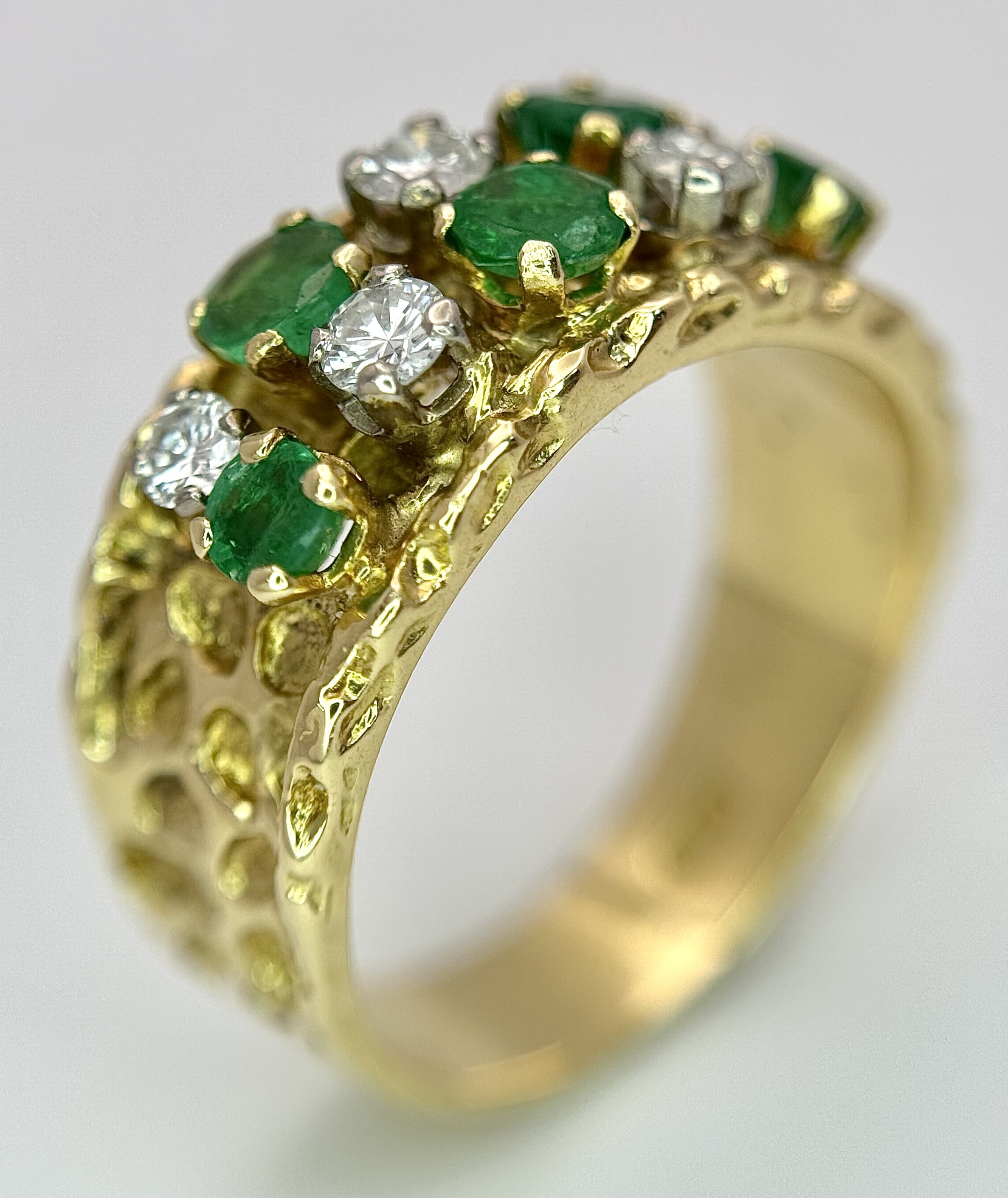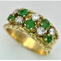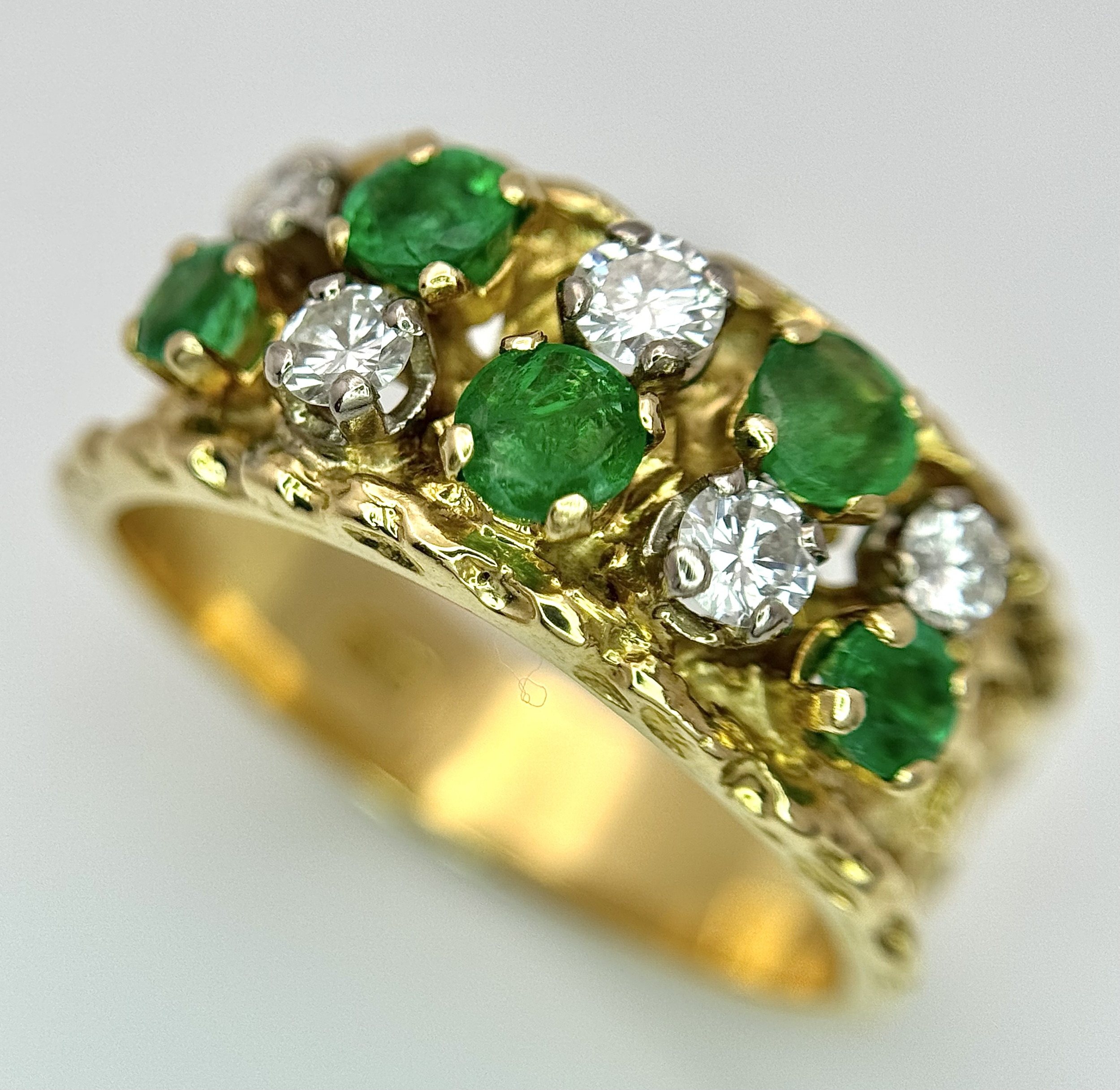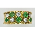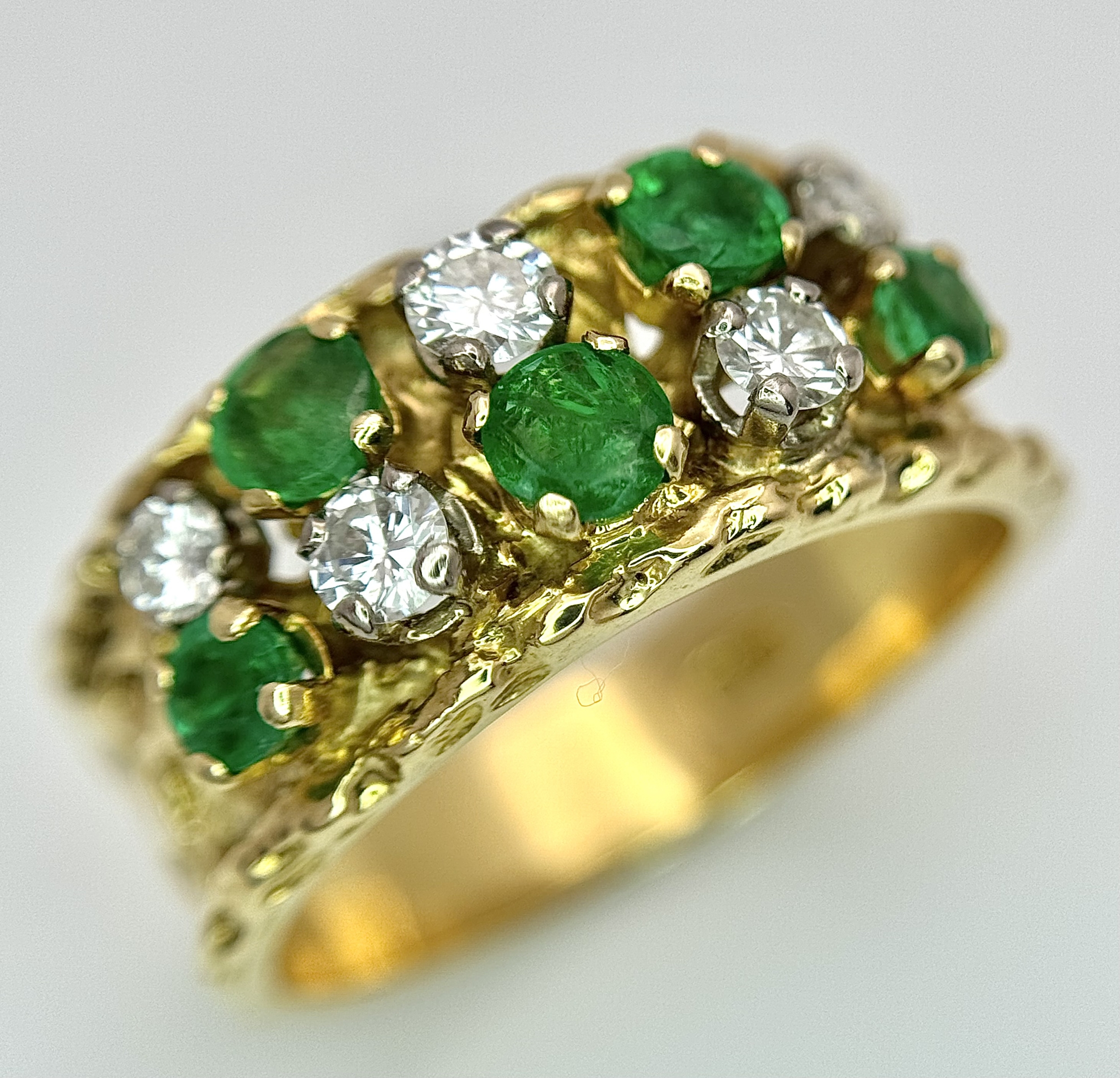 An 18K Yellow Gold Emerald and Diamond Band Ring. c. 0.50ctw of round cut emeralds and c. 0.50ctw of round brilliant cut diamonds. All stones are high grade. 10mm width at widest point. Size S. 8.2g.
