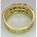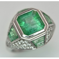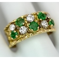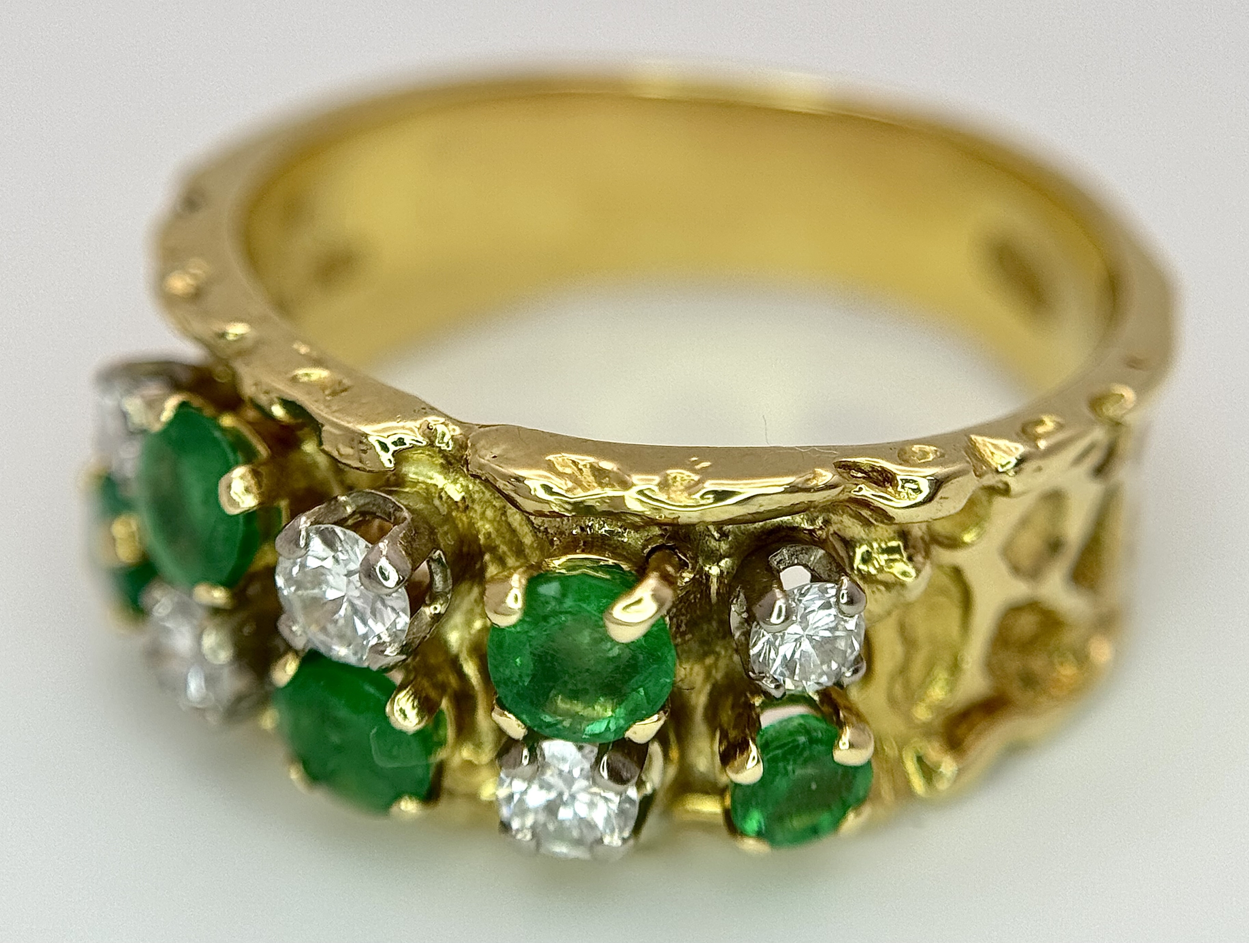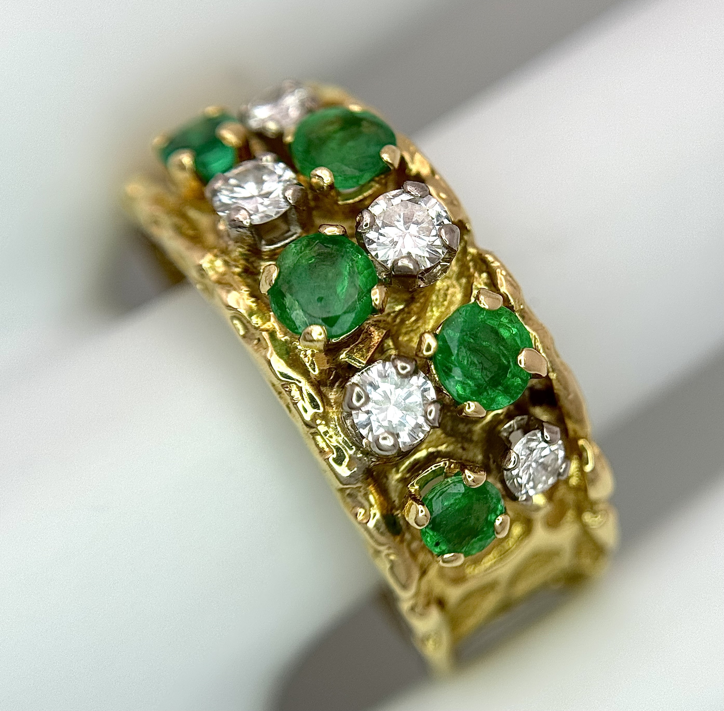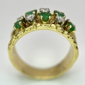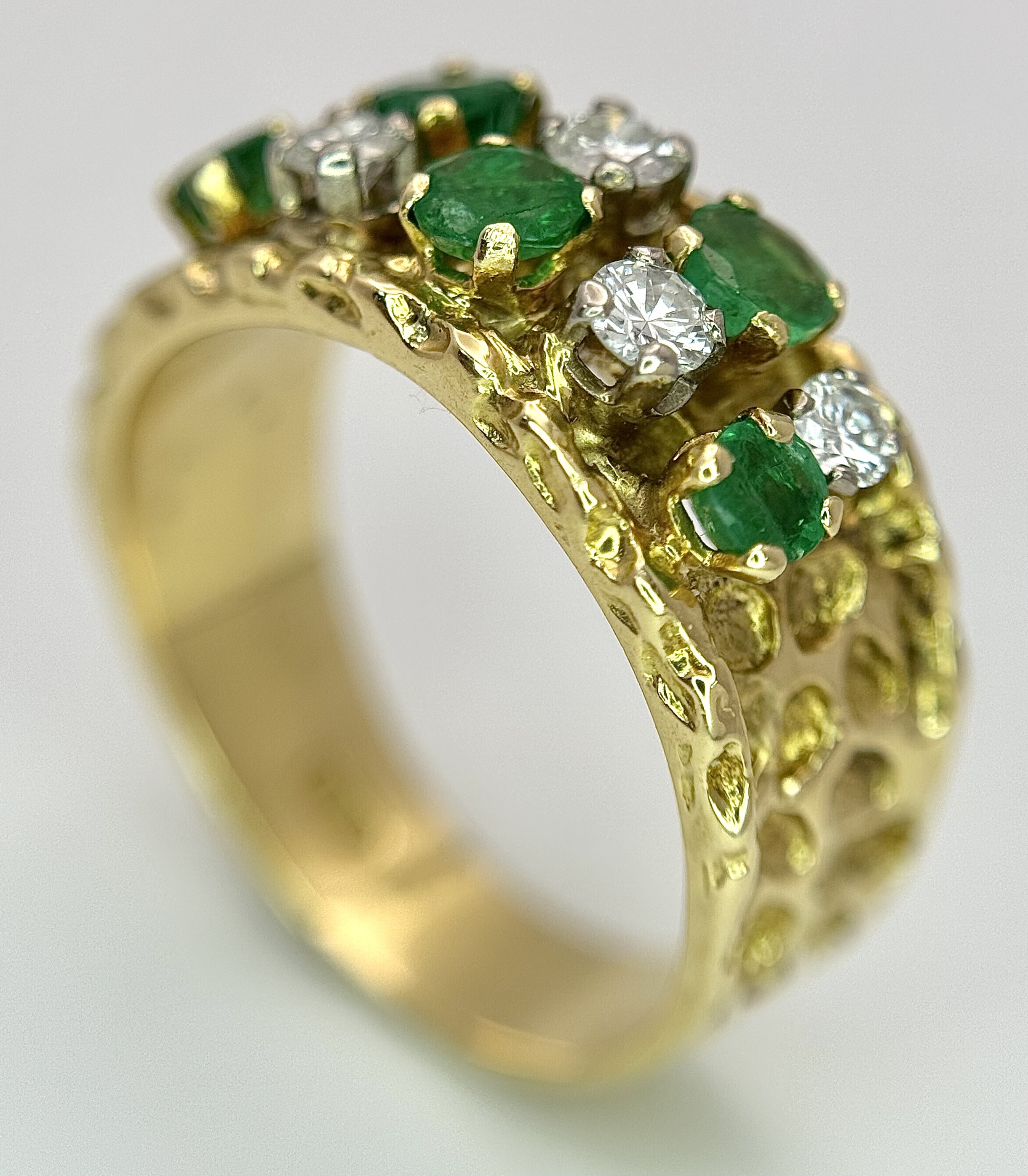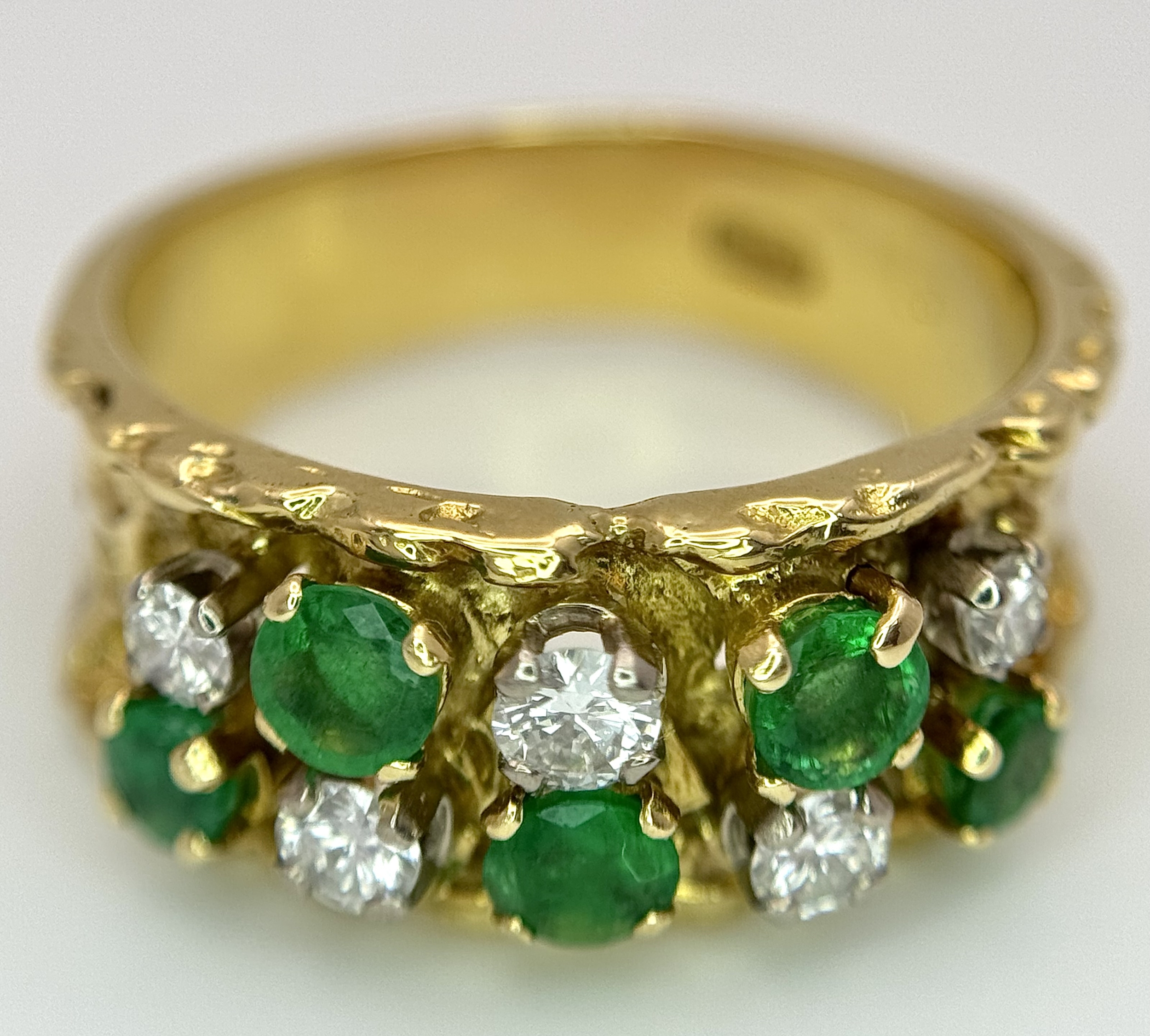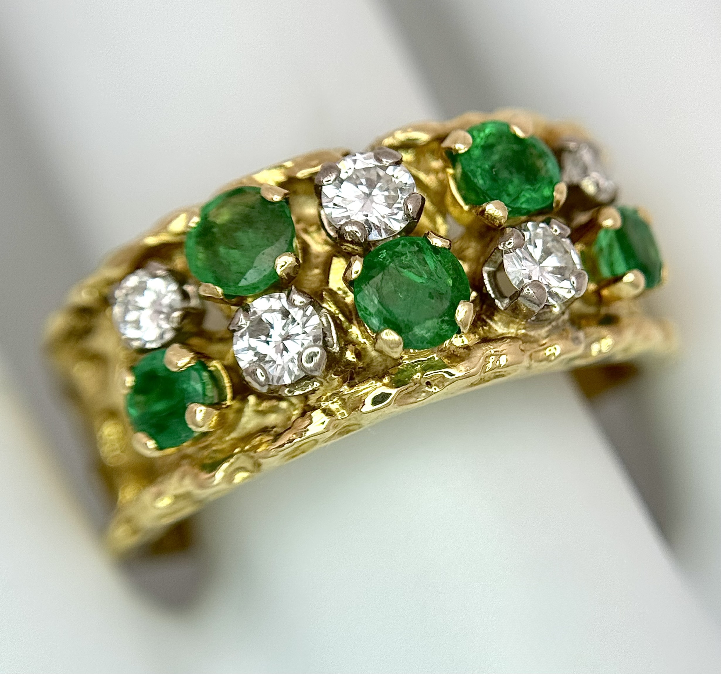 An 18K Yellow Gold Emerald and Diamond Band Ring. c. 0.50ctw of round cut emeralds and c. 0.50ctw of round brilliant cut diamonds. All stones are high grade. 10mm width at widest point. Size S. 8.2g.