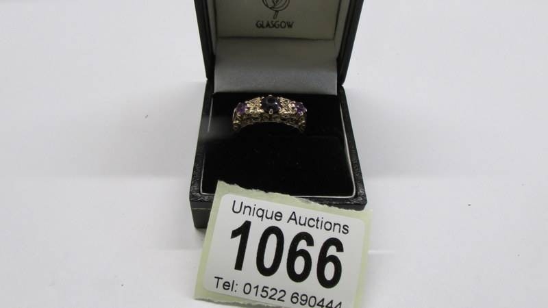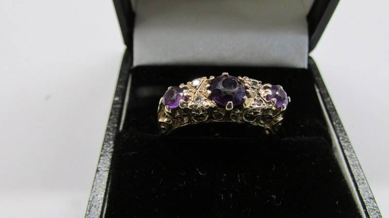 A diamond and amethyst vintage ring in 9ct gold, size L, 2.97 grams.
