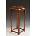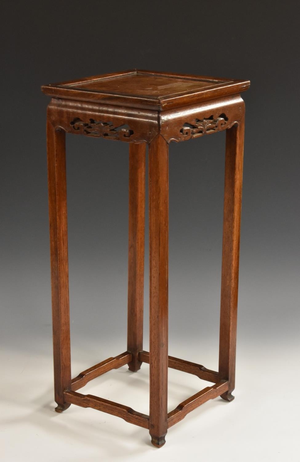 A Chinese hardwood vase stand, square panelled top above a pierced frieze, square legs and stretchers, 45cm high, 19cm wide, c.1900