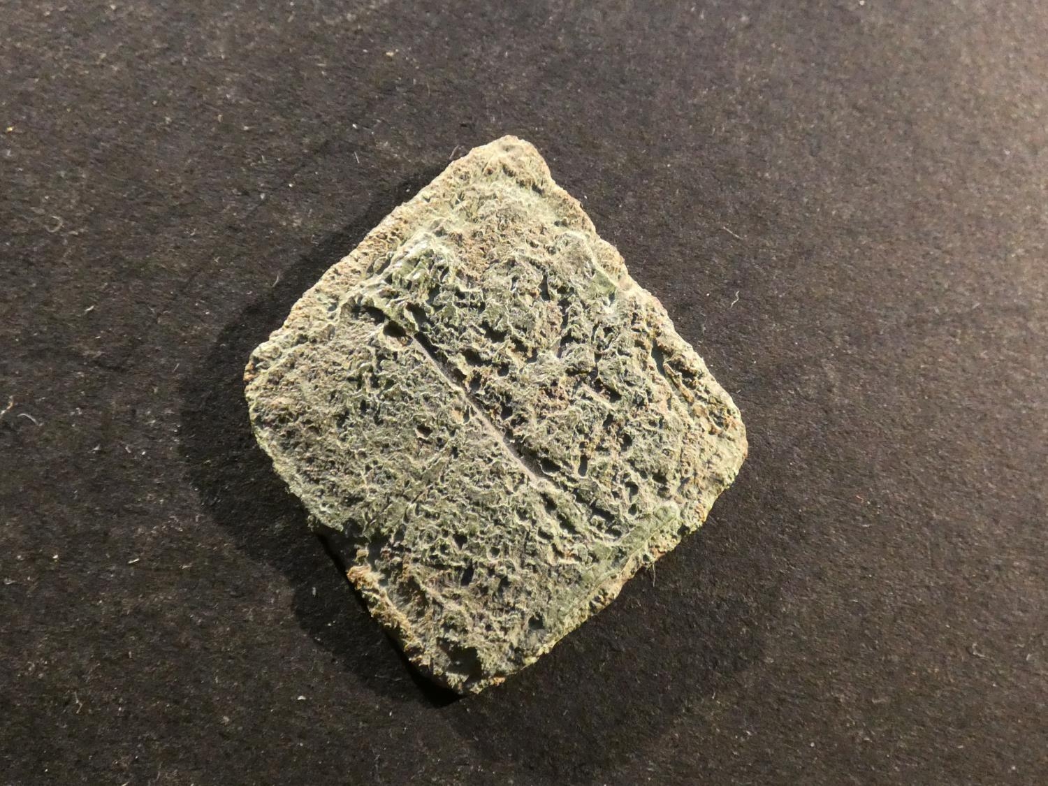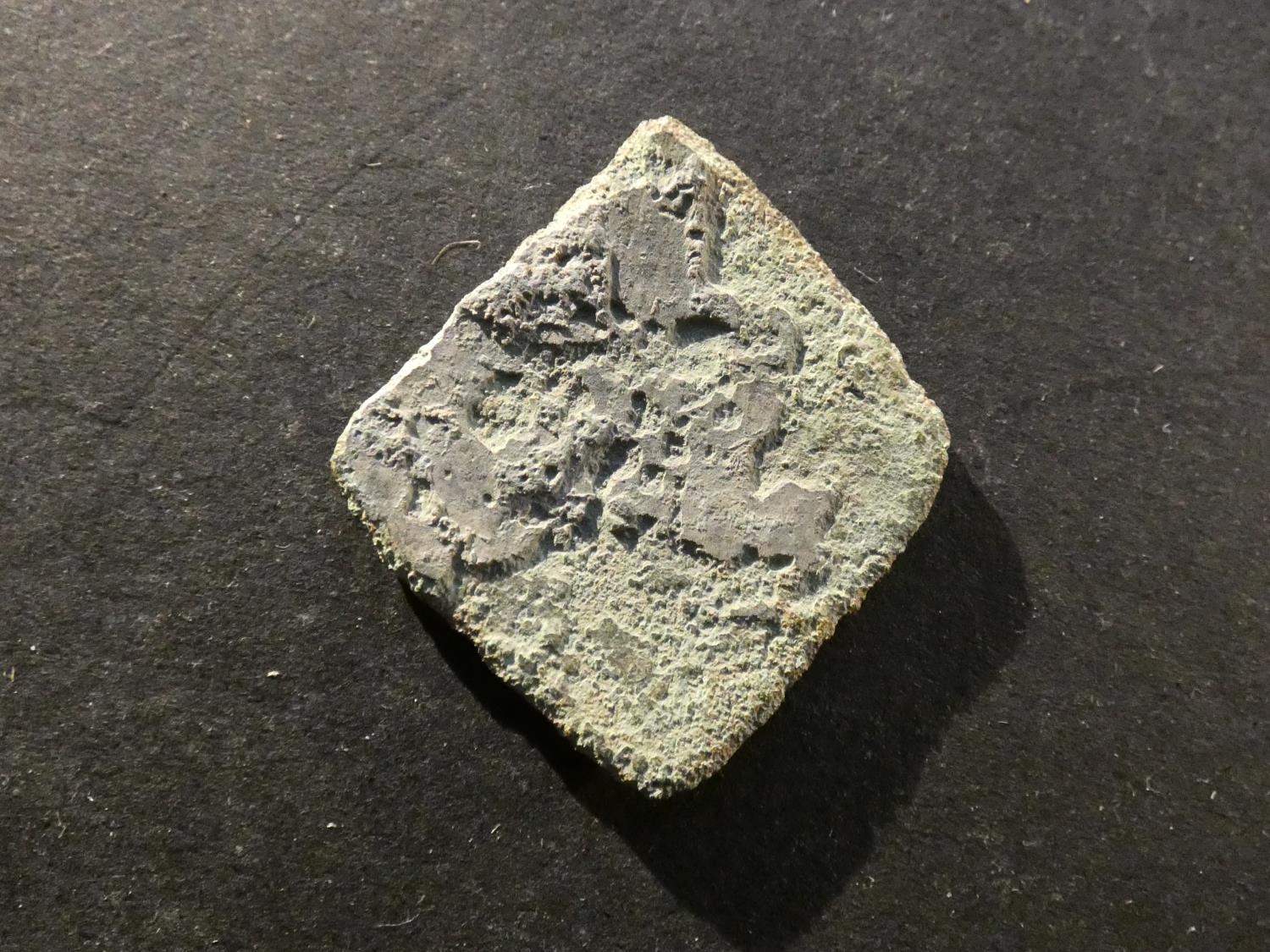 ENGLAND. Charles I (1625-1649). Silver Ninepence, Newark Siege issue, approximately 25½mm x 28½mm, 4.0g, lozenge-shaped, badly corroded, but crown dividing C-R is discernible in the right light.
