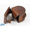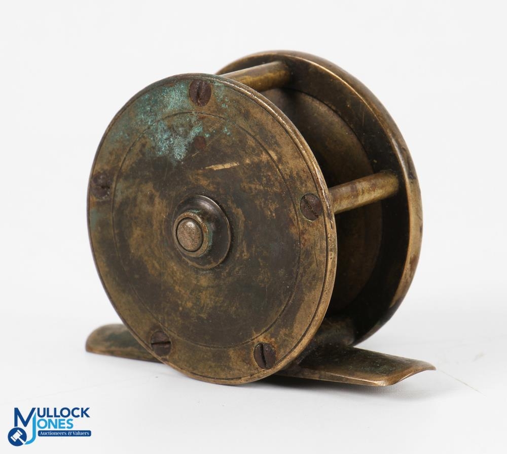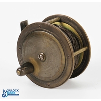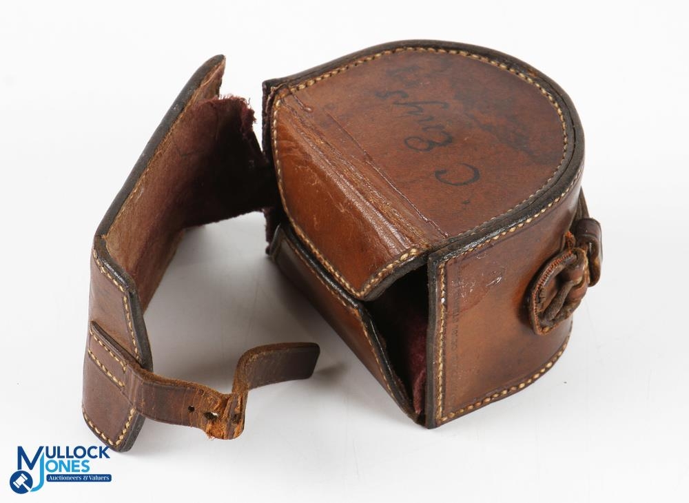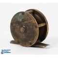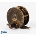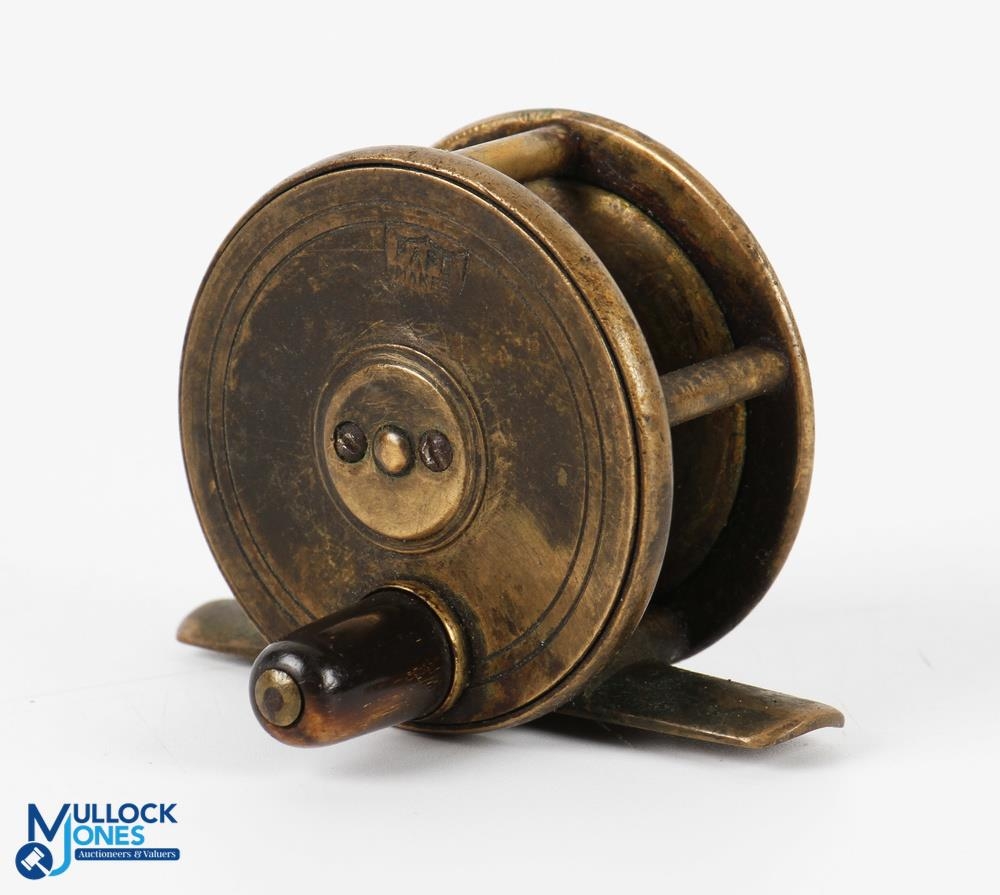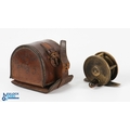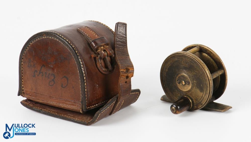 W R Pape, Newcastle 2" Brass Trout Reel - with makers mark to face, small horn handle, weak check, housed in leather case with ink written period owners name to sides, lid A/F at hinge with only a small amount of material keeping it attached to case